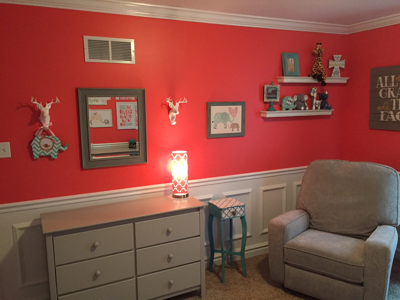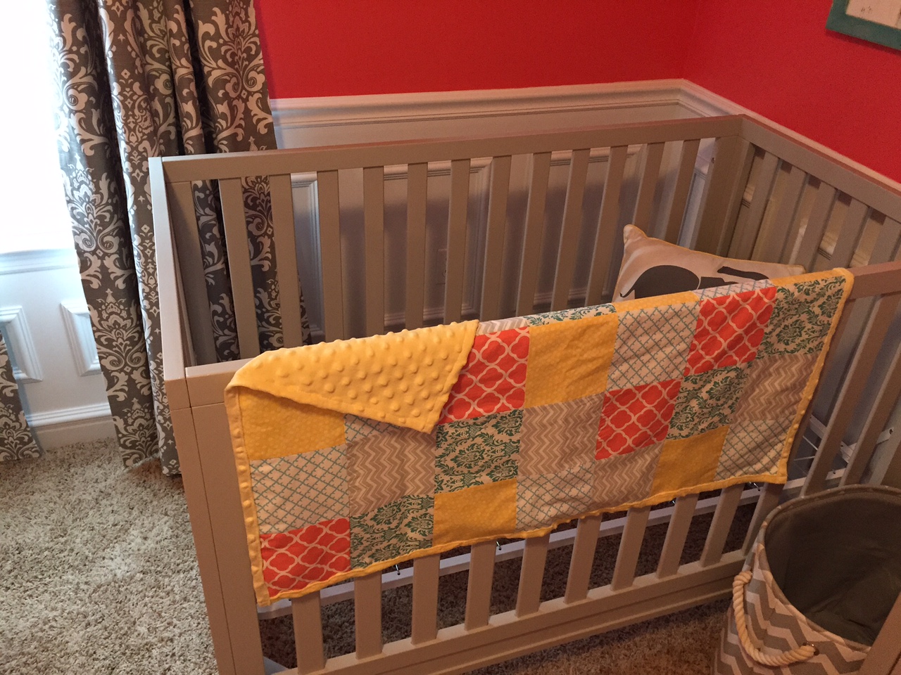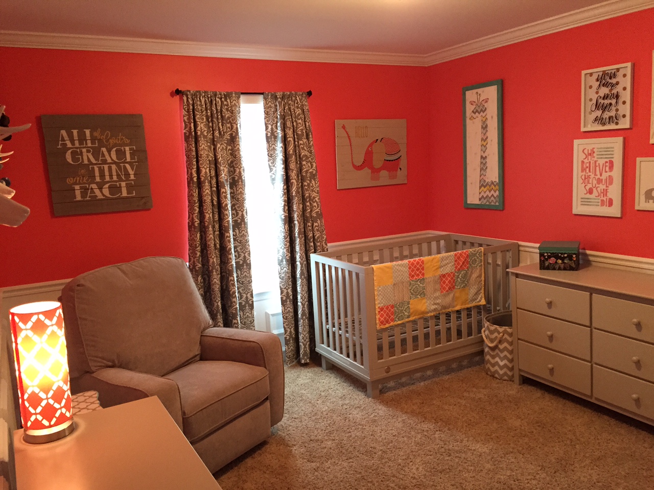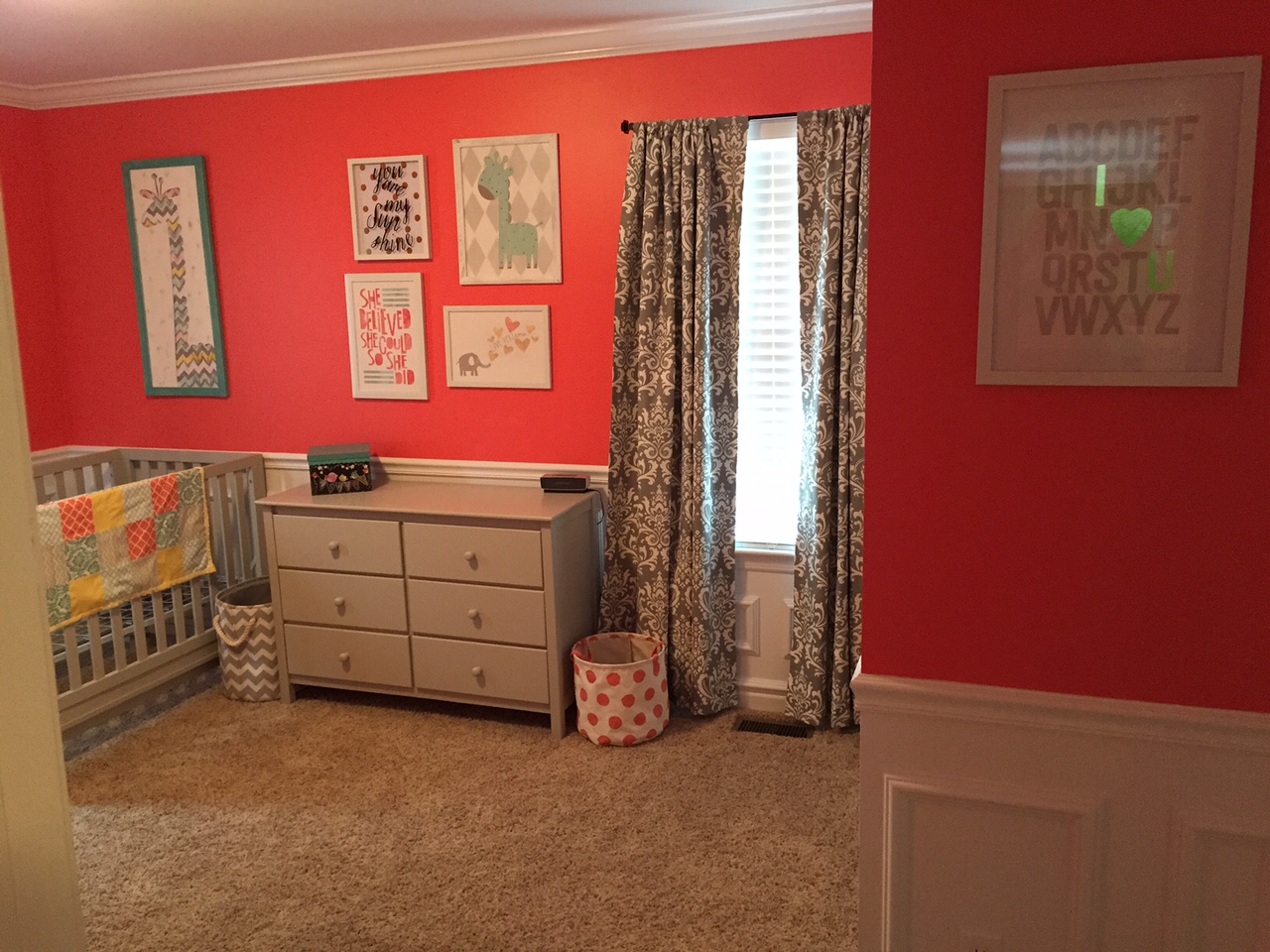 Olivia Mae's room is pretty much ready to go. When we were supposed to have twins, we were going to do yellow and gray, but when we lost our little boy, I wanted to do something really cheerful and bright - hence the coral color. My husband worked really hard putting up the moldings and painting. I picked the fabrics out and my mom made the curtains and blanket.