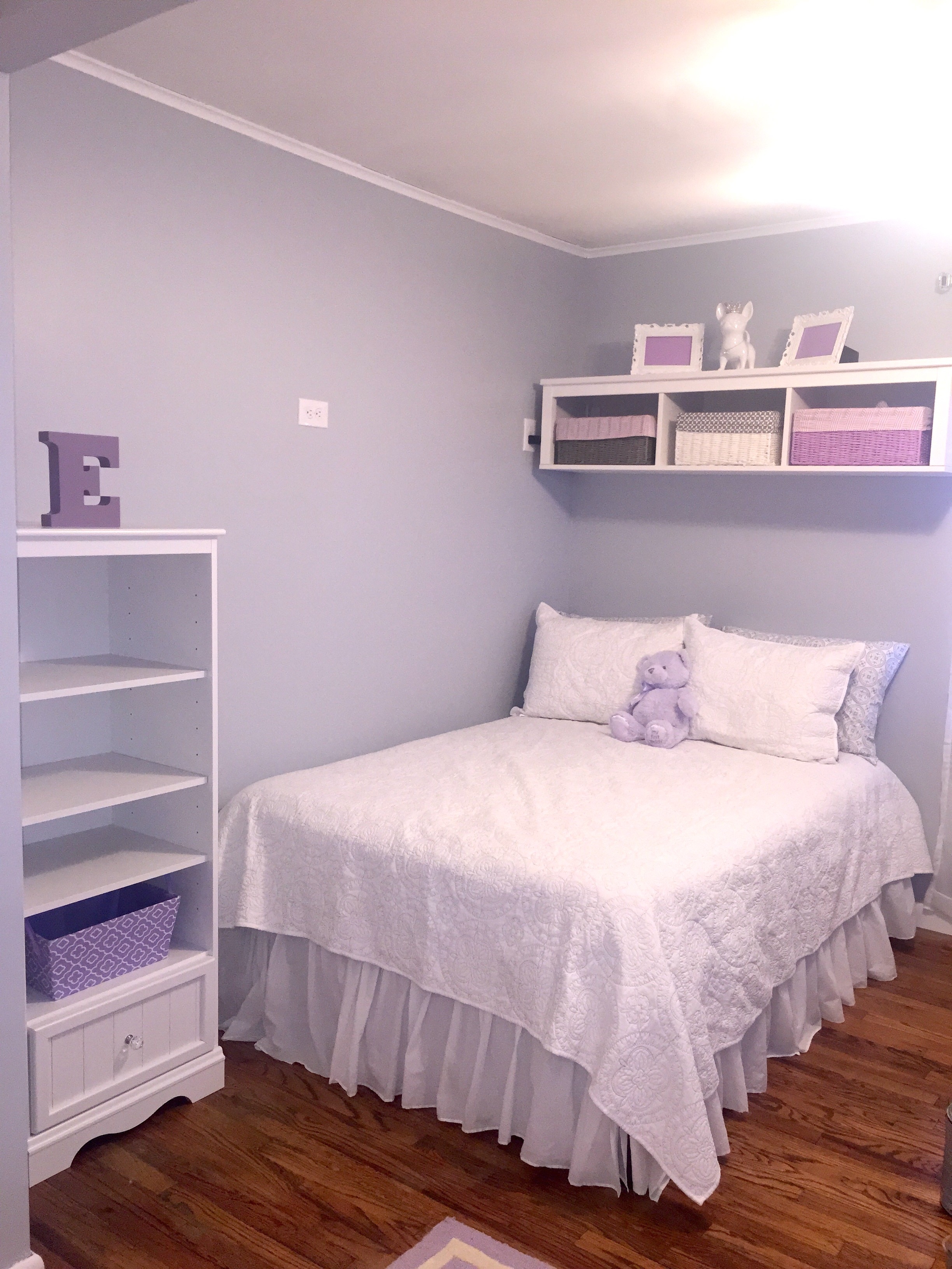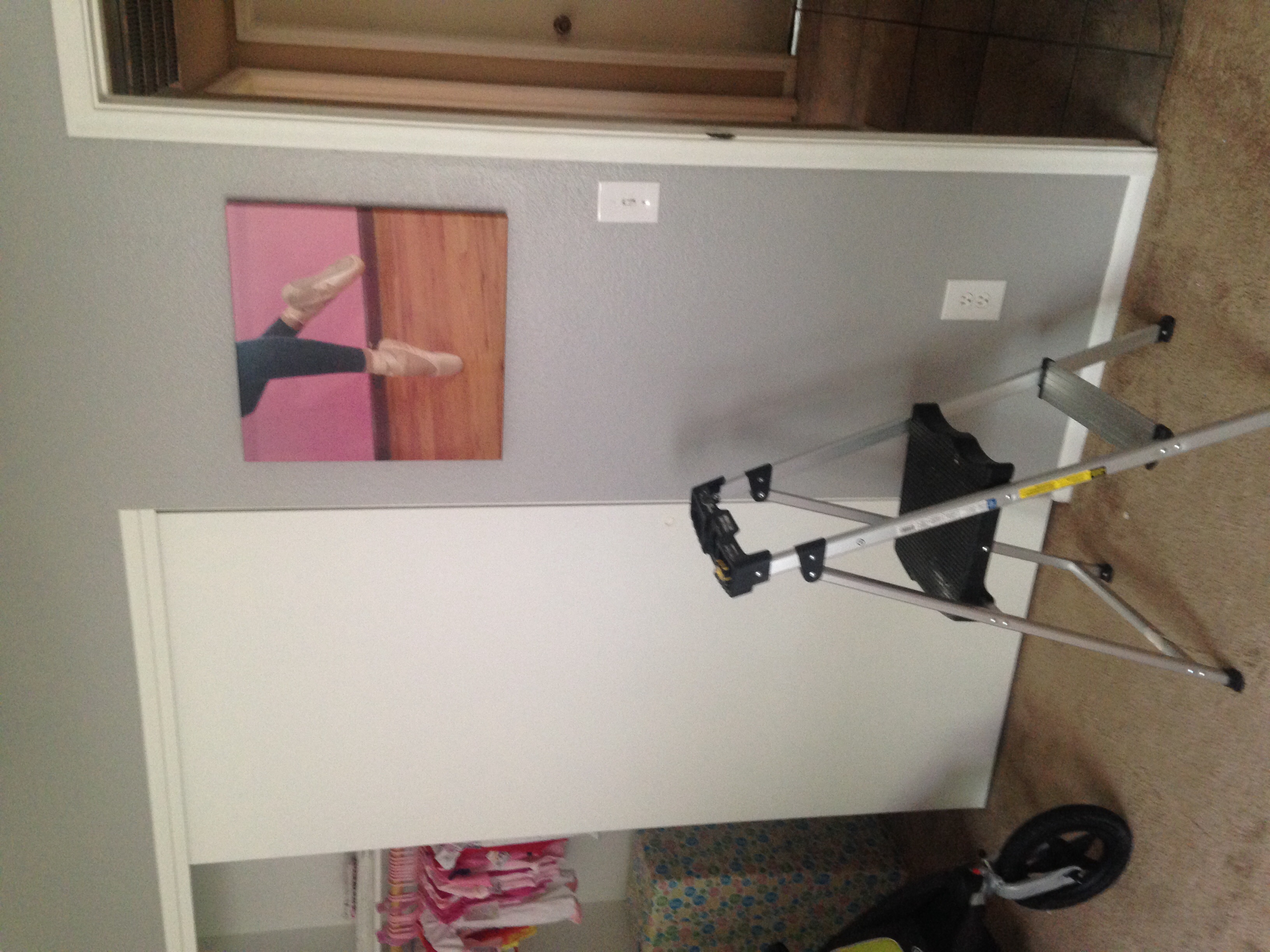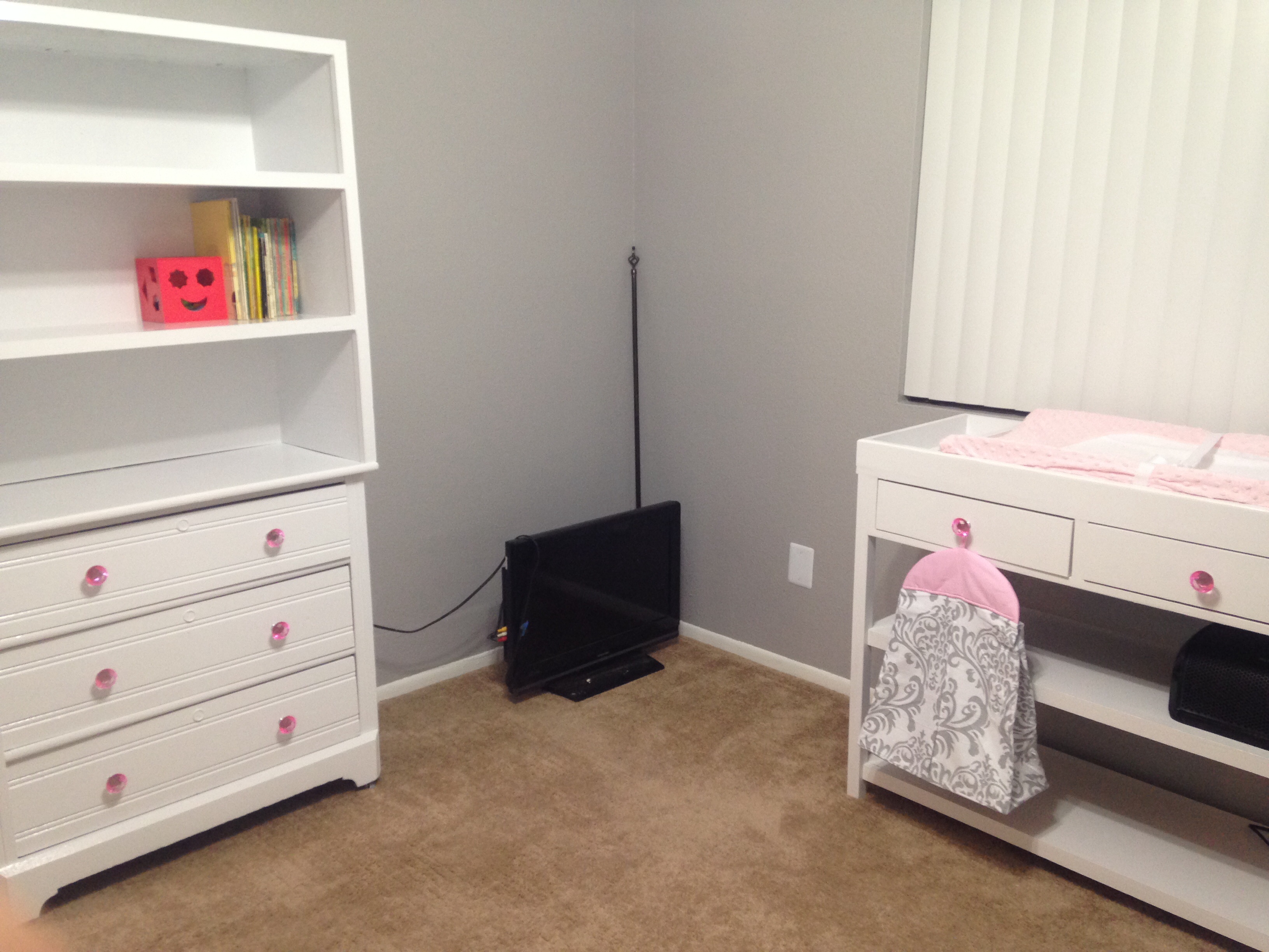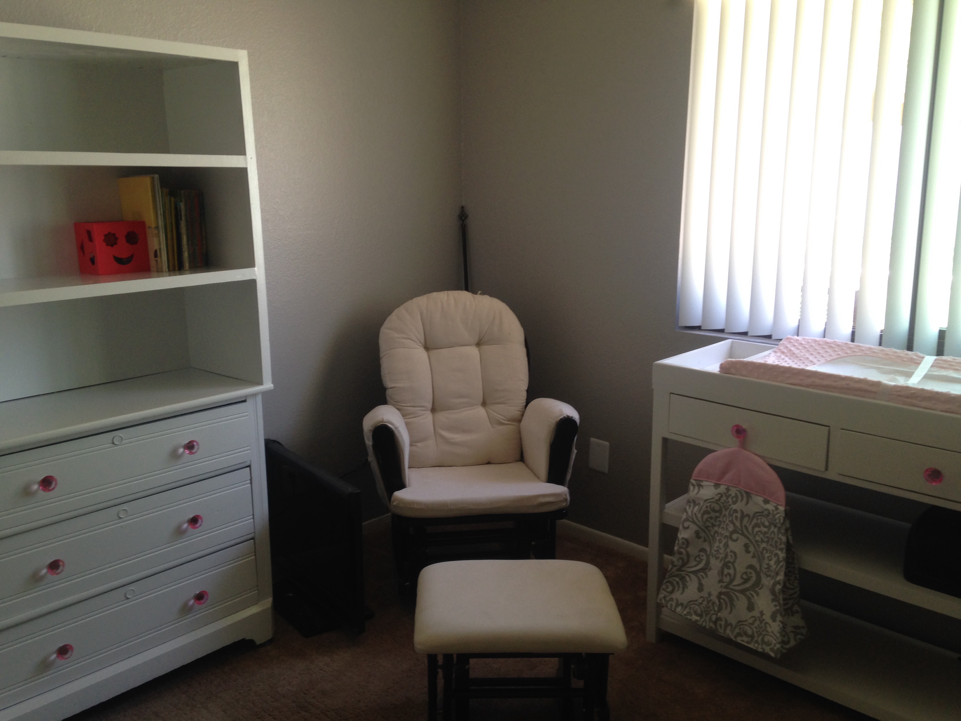 We are still waiting on the crib and glider. But here's the dresser that will have the changing pad on it and then we kept the spare bed in her room for us to use if need be.