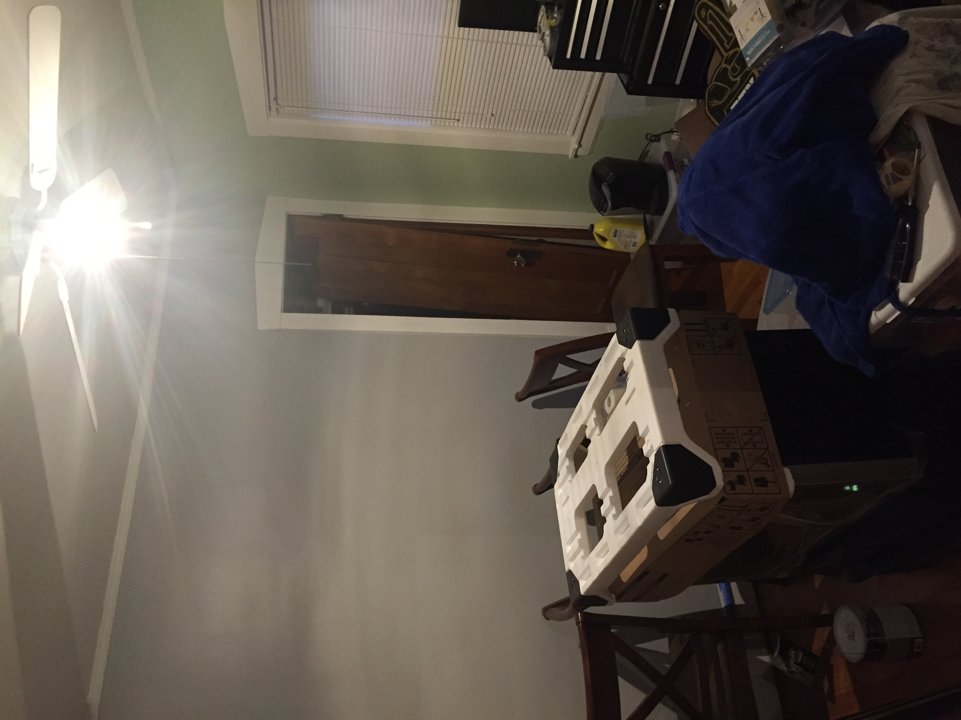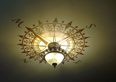We replaced the light fixture with something that's way cooler, but was also smaller than the old light fixture, which meant there was a ring on the ceiling with the inner paint as white and the outer paint as off white. Rather than paint the whole ceiling, i opted for a compass rose decal that disguises the rings, matches real-world cardinal directions, and just looks very cool.
