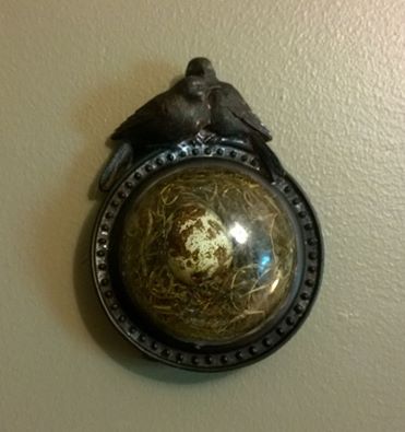 You'll remember that i cast our gender reveal/baby announcement into a resin paperweight. I later decided to frame and hang it. This frame wasn't quite a perfect fit for a 3" paperweight, so i used a dremel to widen the opening and some clear glue to keep the paperweight mounted. The back still opens to reveal our "It's a Boy! Coming October 1st, 2015..." message. The birds were extra perfect with the egg/nest