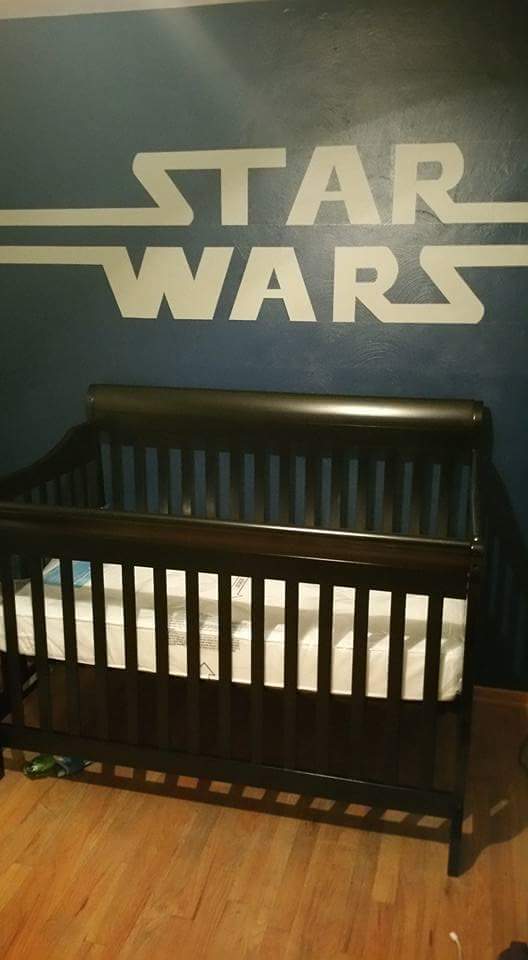 The start of our Star Wars nursery those letters took me f*cking forever ha fiance decided to put the crib together in our living room instead of in the baby's room.. After about an hour and a half of work, we ended up having to take a piece off to fit it down the hall way anndd another to get it through the baby's door - insert fiance's super pouty face here lol one of us got a good laugh out of it