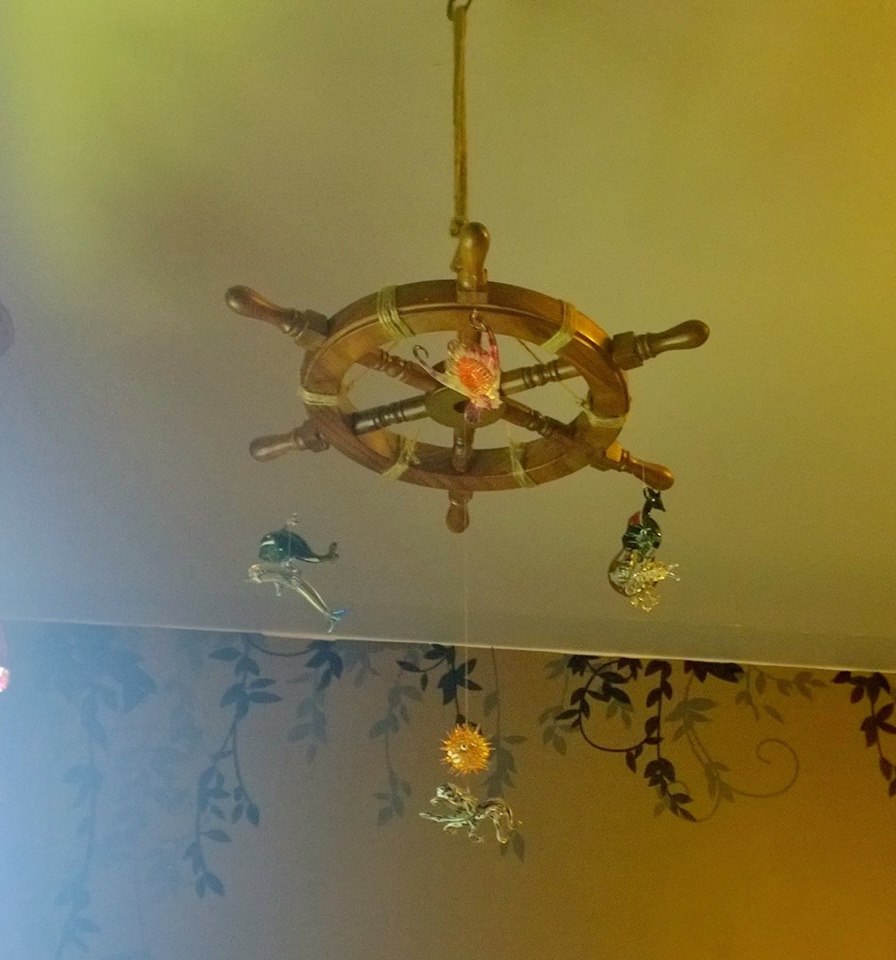 I love how this is coming along. It currently has 6 glass sea creatures dangling from aships wheelanchored to the ceiling with abrass hookin front of the window (where light can make it sparkle). I have 6 more animals coming and would not be surprised to receive others. It has a whale from "Aunt" Wendy, a hermit crab from Aunt Lori, apufferfishfrom Sandy, a seahorse from Pappy, anOctopusfrom me, and a dolphin from our babymoon (it was a gift in our room). It also has an angelfish for good measure. I will be adding: a jellyfish, sanddollar, starfish, seashell, sea turtle, and snail, as well as seaglass from Grandma Corder and some doubloons too.