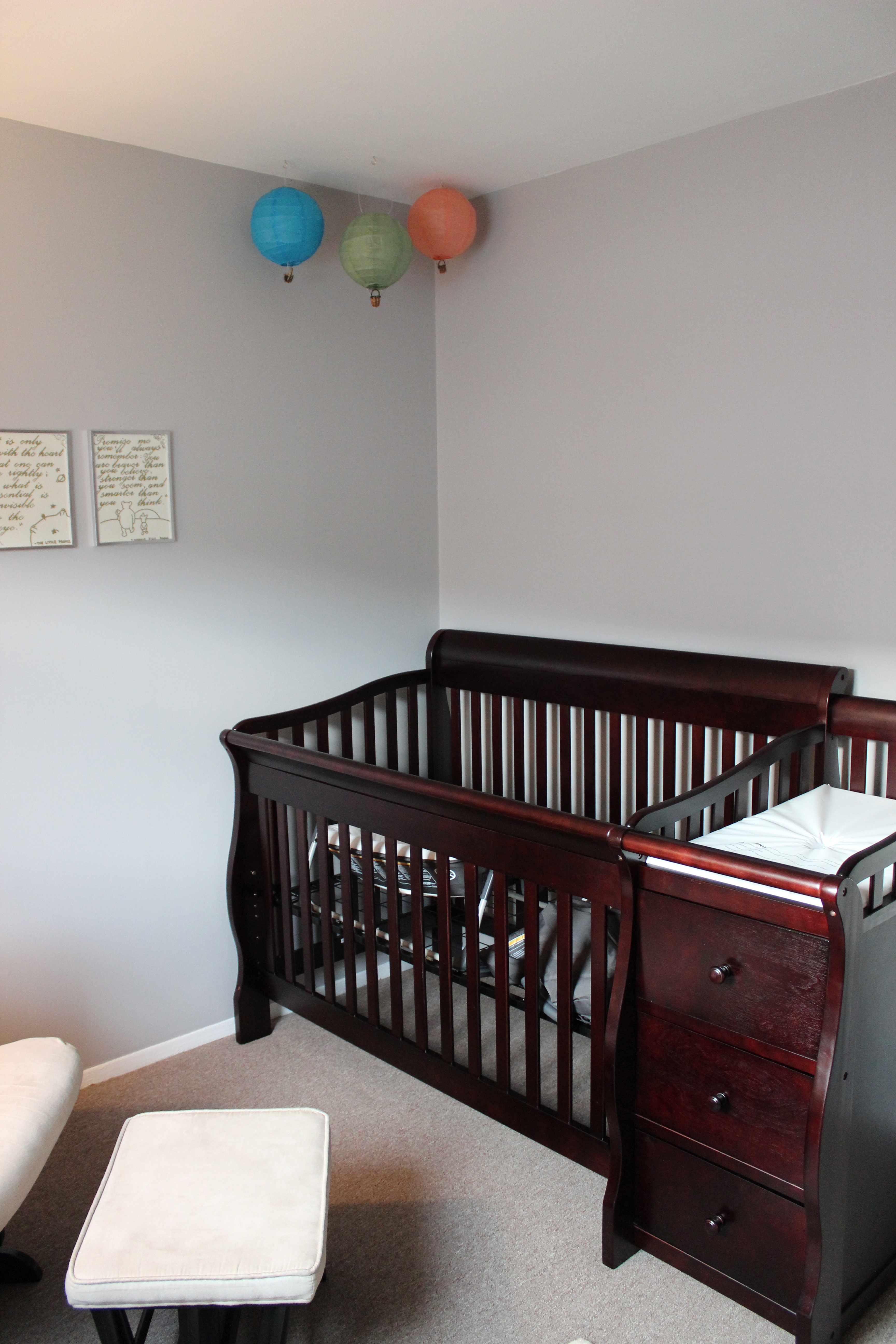 Alright, ladies! I've finished some more of the nursery. Here's what it looks like now! I made the quotes out of frames, card stock, calligraphy stencils, and gel pens from Michaels. Since our families live so far away, my husband and I decided to put up some photos of our families so baby can get to know their faces. The stuffed animals on the shelf are my husband's and mine from when we were babies. I made some hot air balloons out of paper lanterns and mini-baskets to be hung in the corner of the room. More to come!