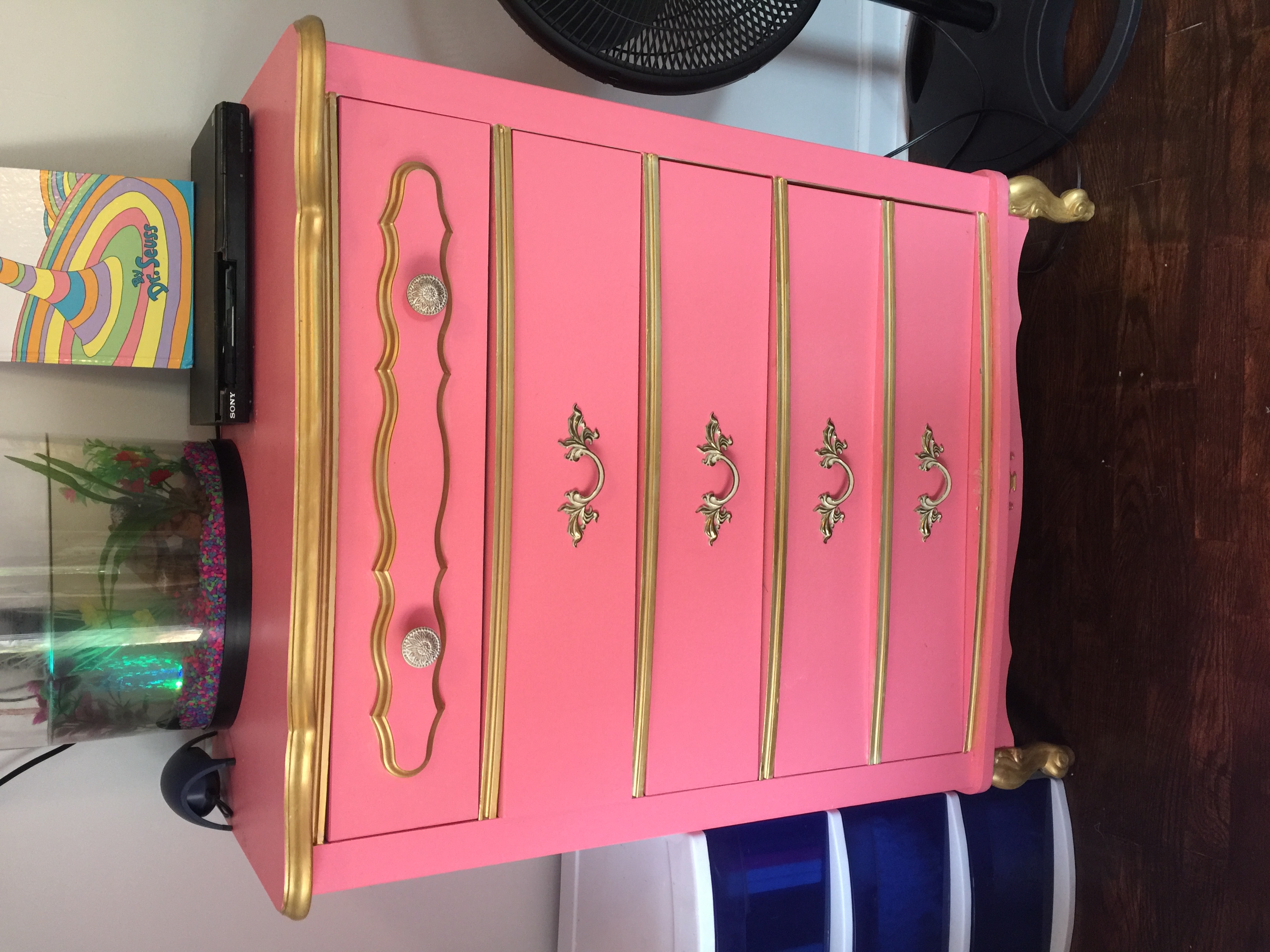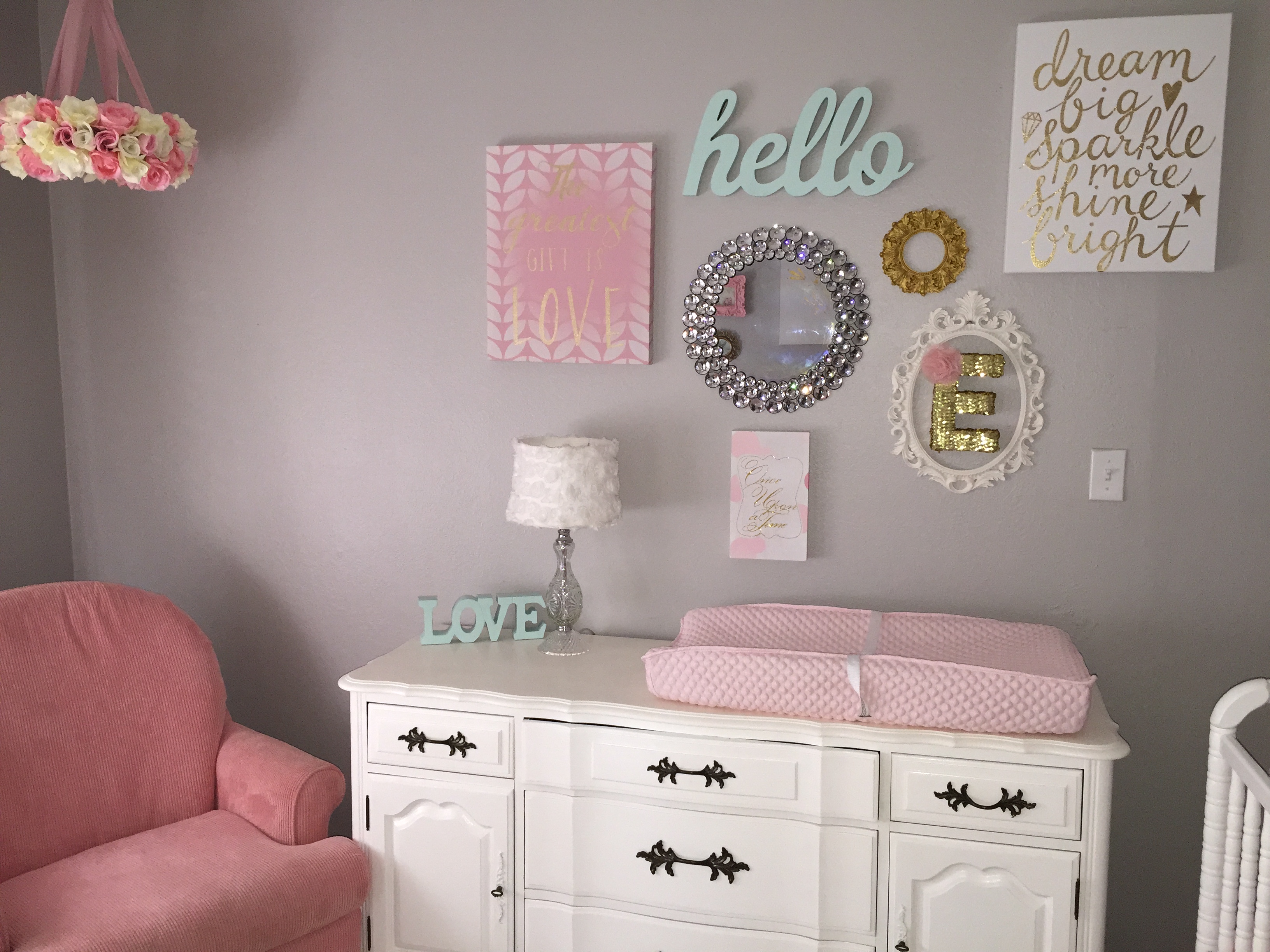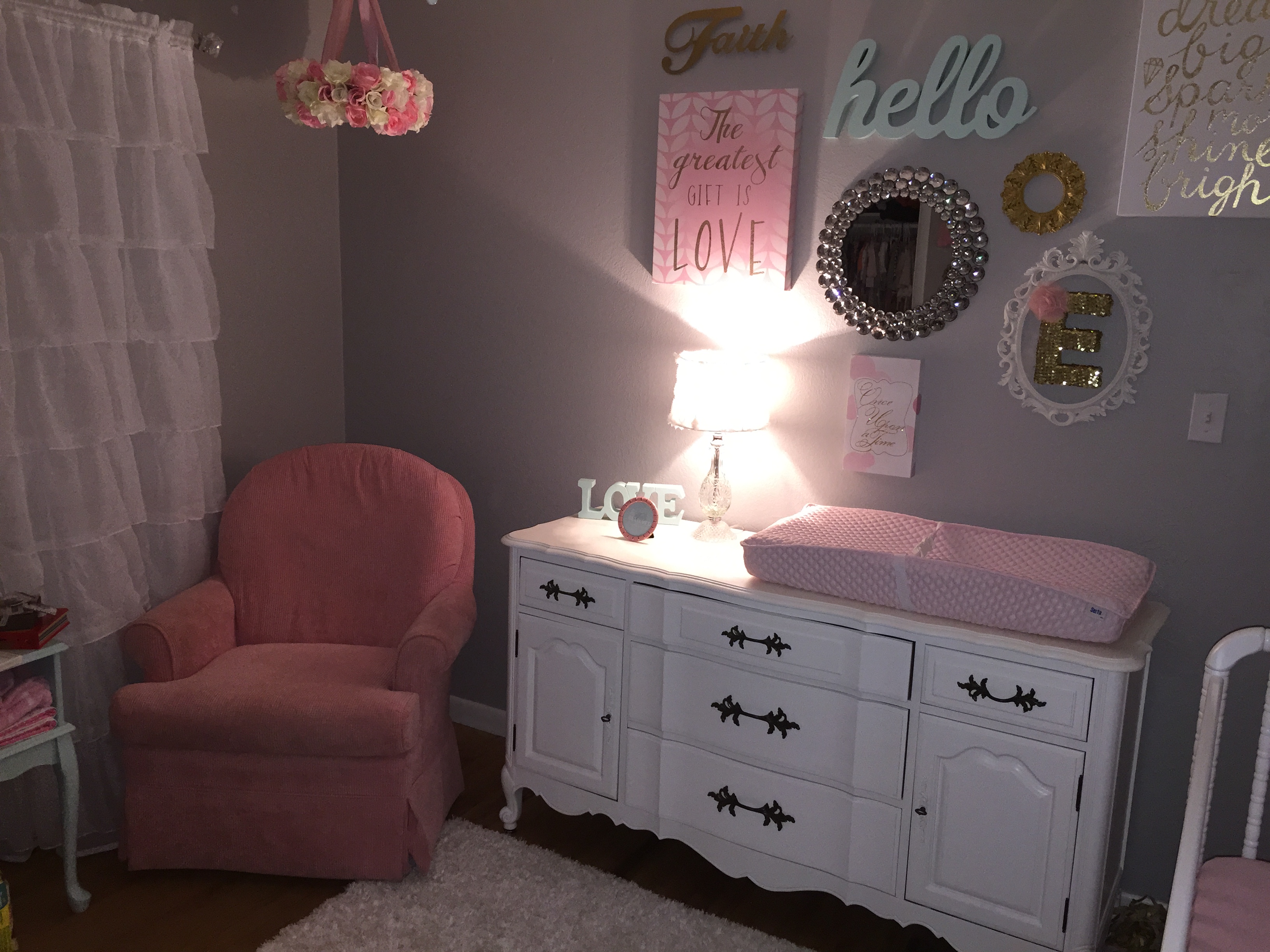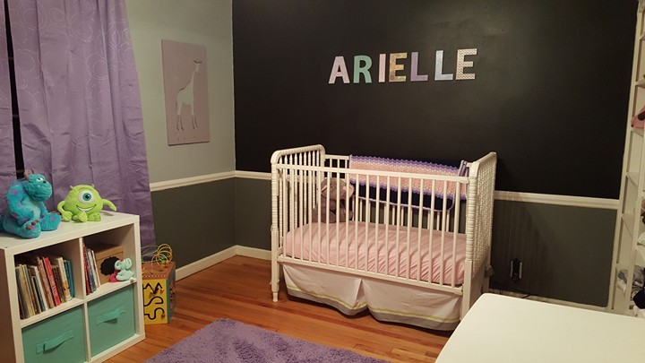 Our baby girl's nursery colors are grey, purple,pink, and teal. The black wall is chalkboard (for us to feel artsy) and the name was mod podged with scrapbook paper. The dresser was a $40 auction find that we sanded, painted, and gave new hardware for (it'll double as a changing table. Still a work in progress!