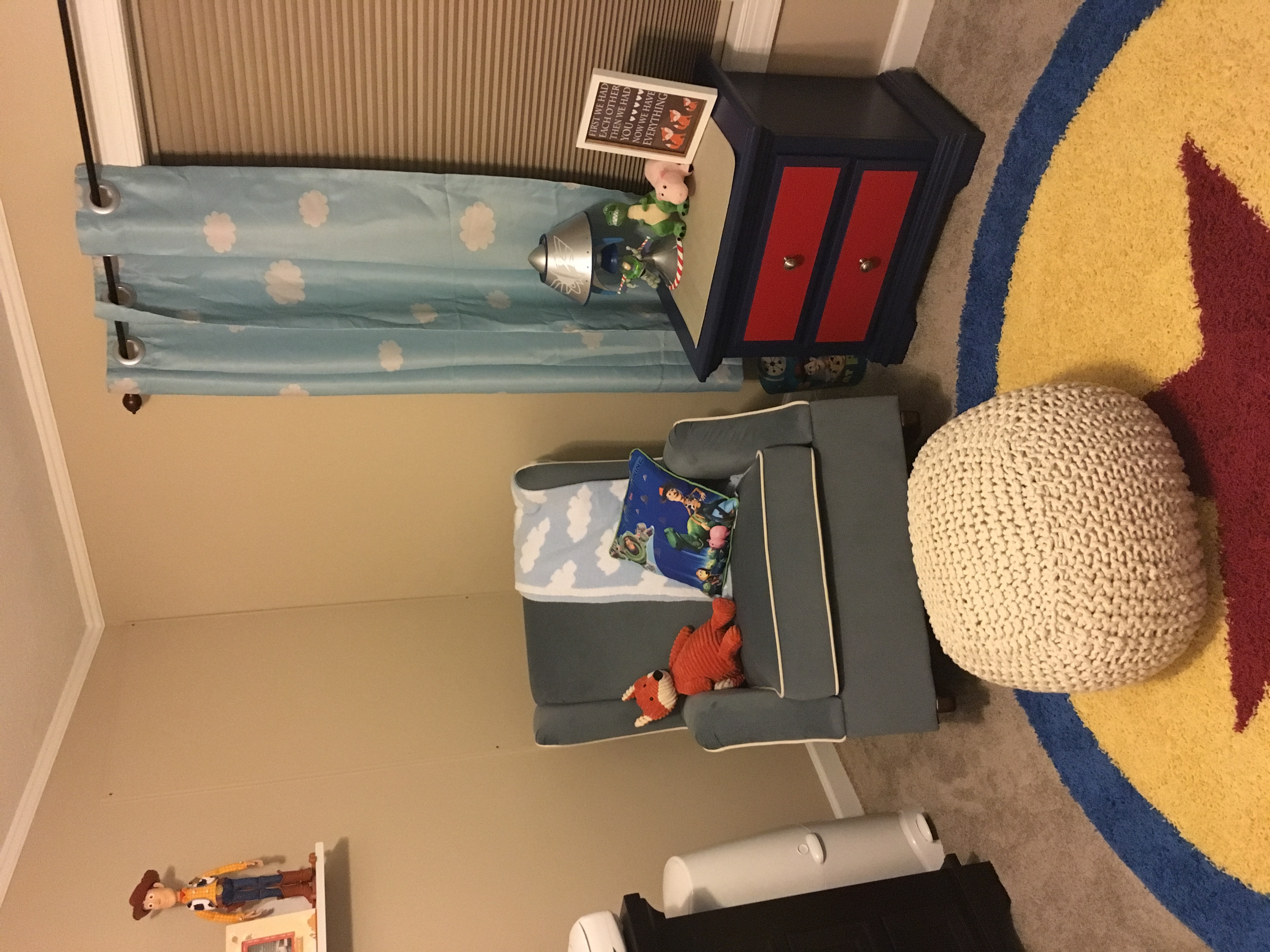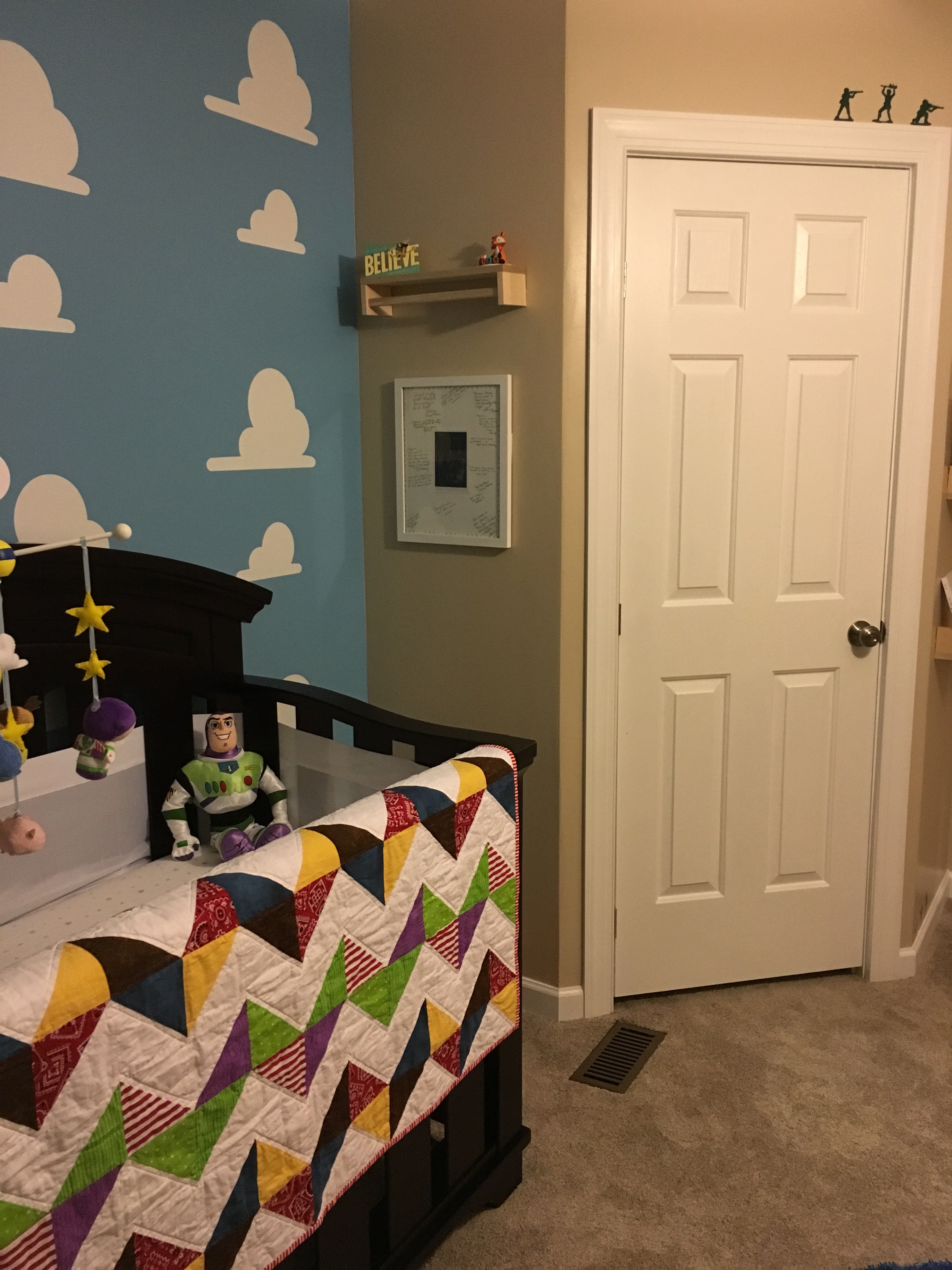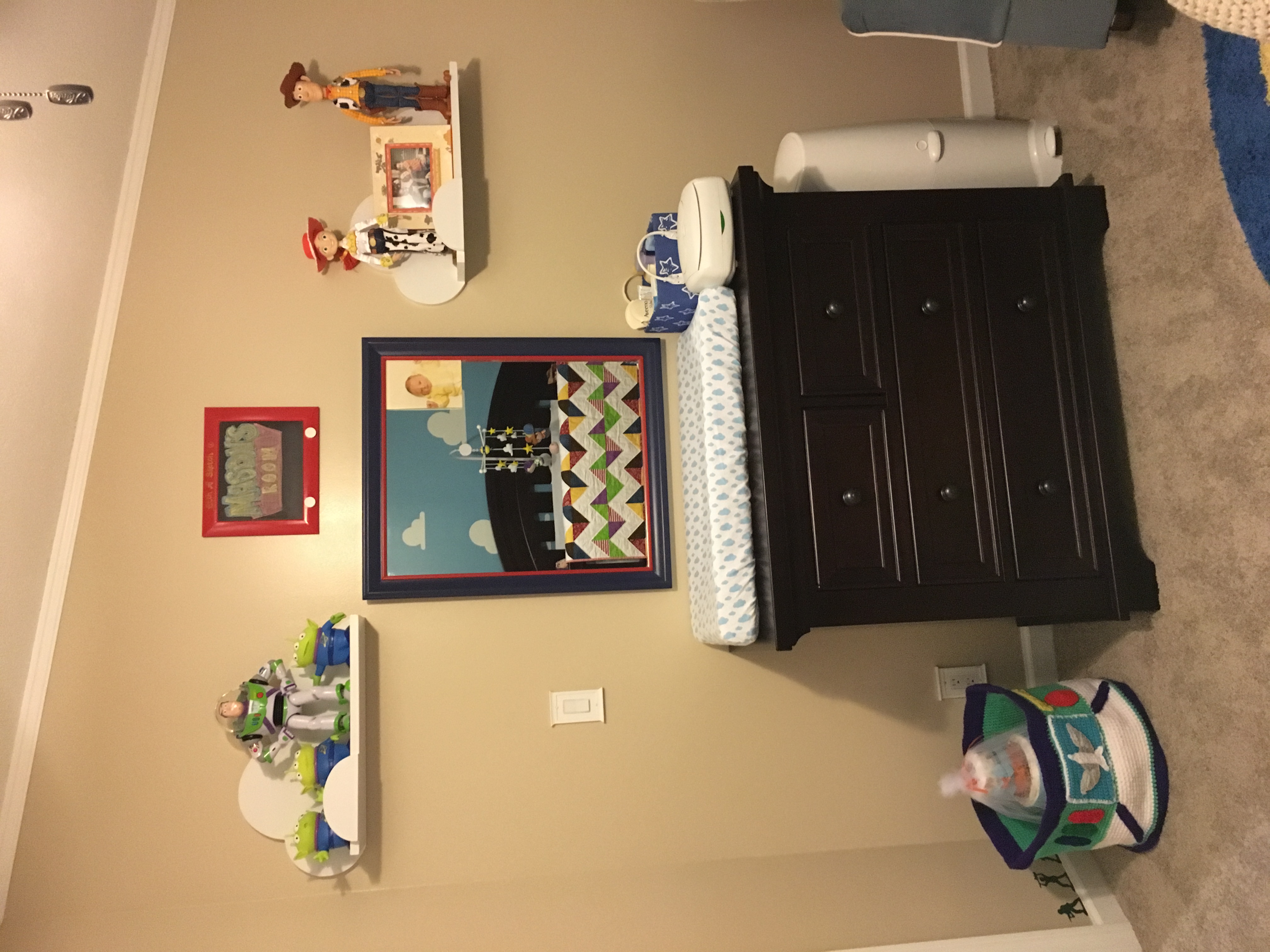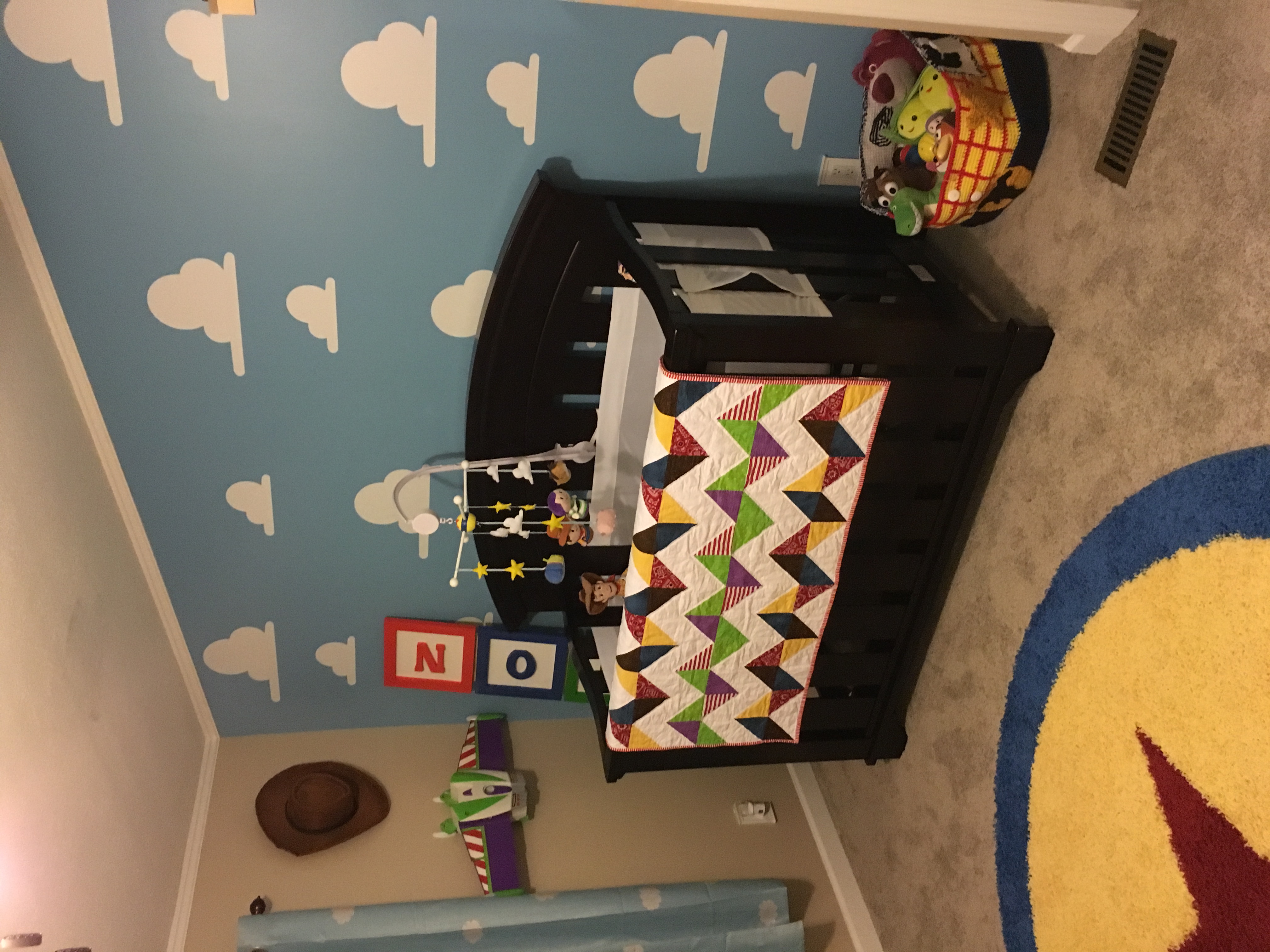 Our baby boys nursery theme is Toy Story, we wanted something he could grow into. Almost everything is custom made, the only thing we have to do is put up his name (it's leaning on the wall to the left of the crib) and finish his toy box. We are soooo happy with how it turned out!