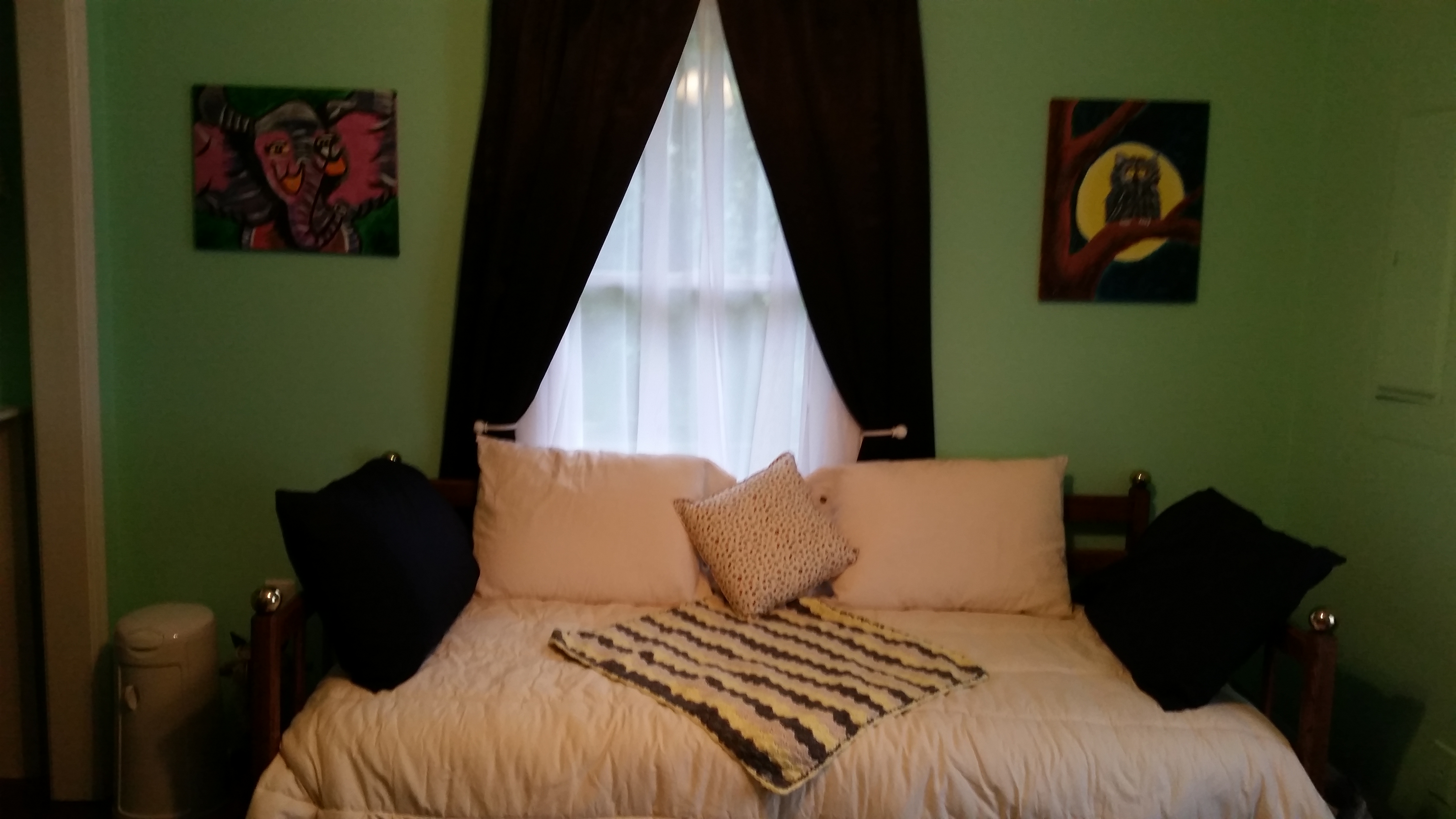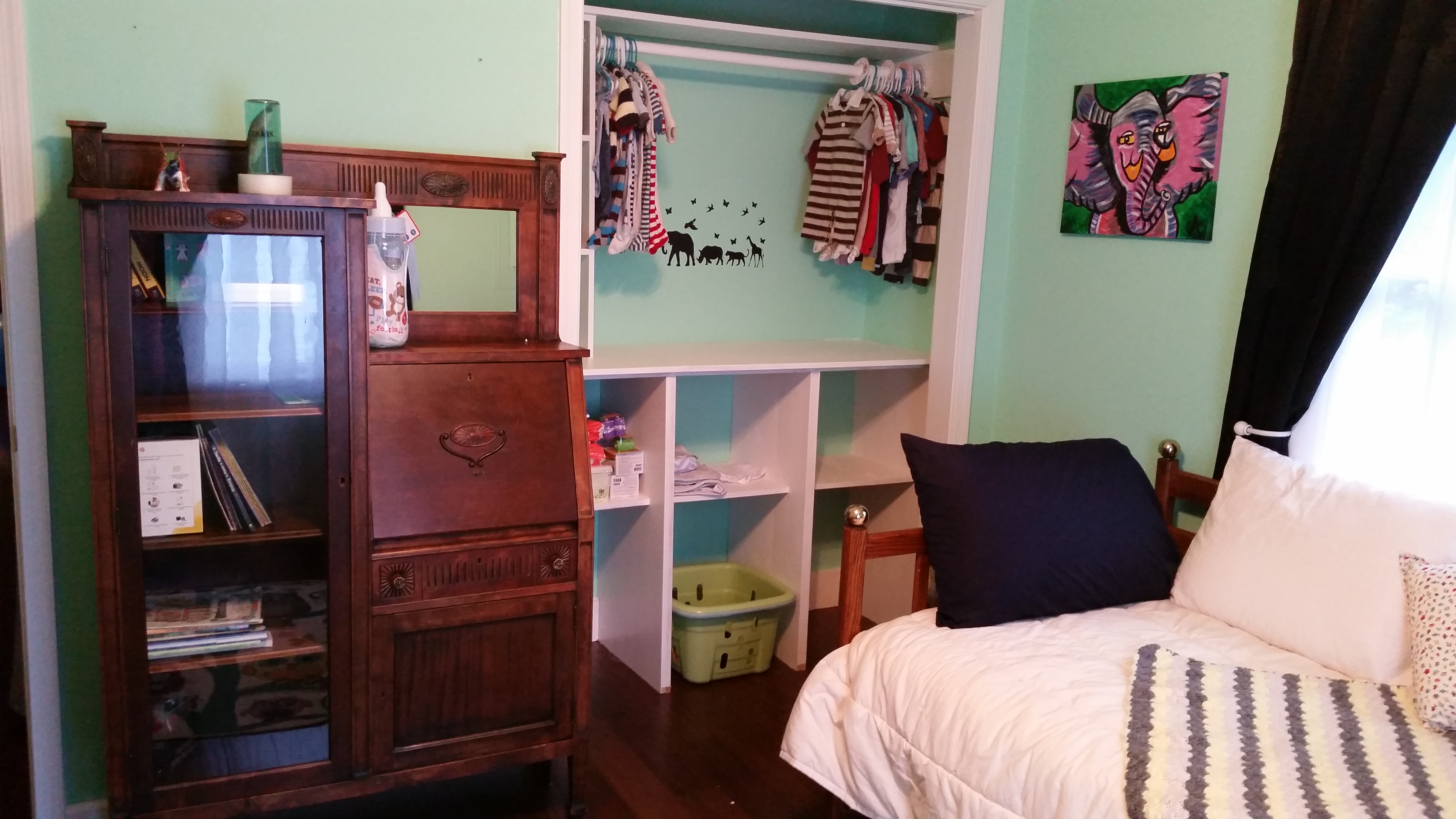 All ready for our little guy. SO made the closet shelving, there is a third 3 shelf unit going up the left, antique desk was my grandmother's and it will hold his books and various supplies, and daybed is for mommy/visitors/future big boy bed. Paintings and tiny blanket are mommy made. (He won't be watching TV btw. SO refused to take it down since he had to create a new outlet for it, so it will be used for late night feedings.)