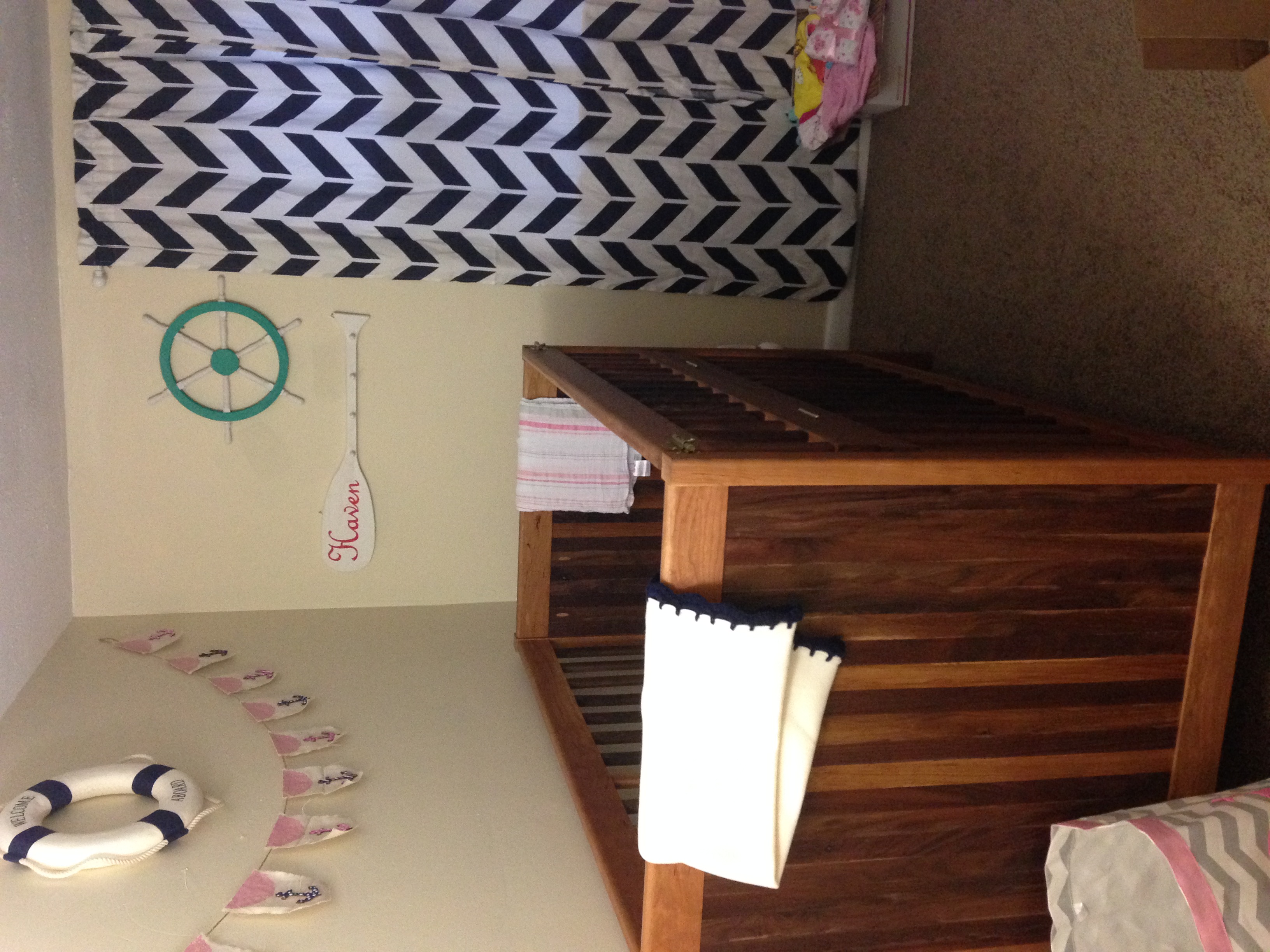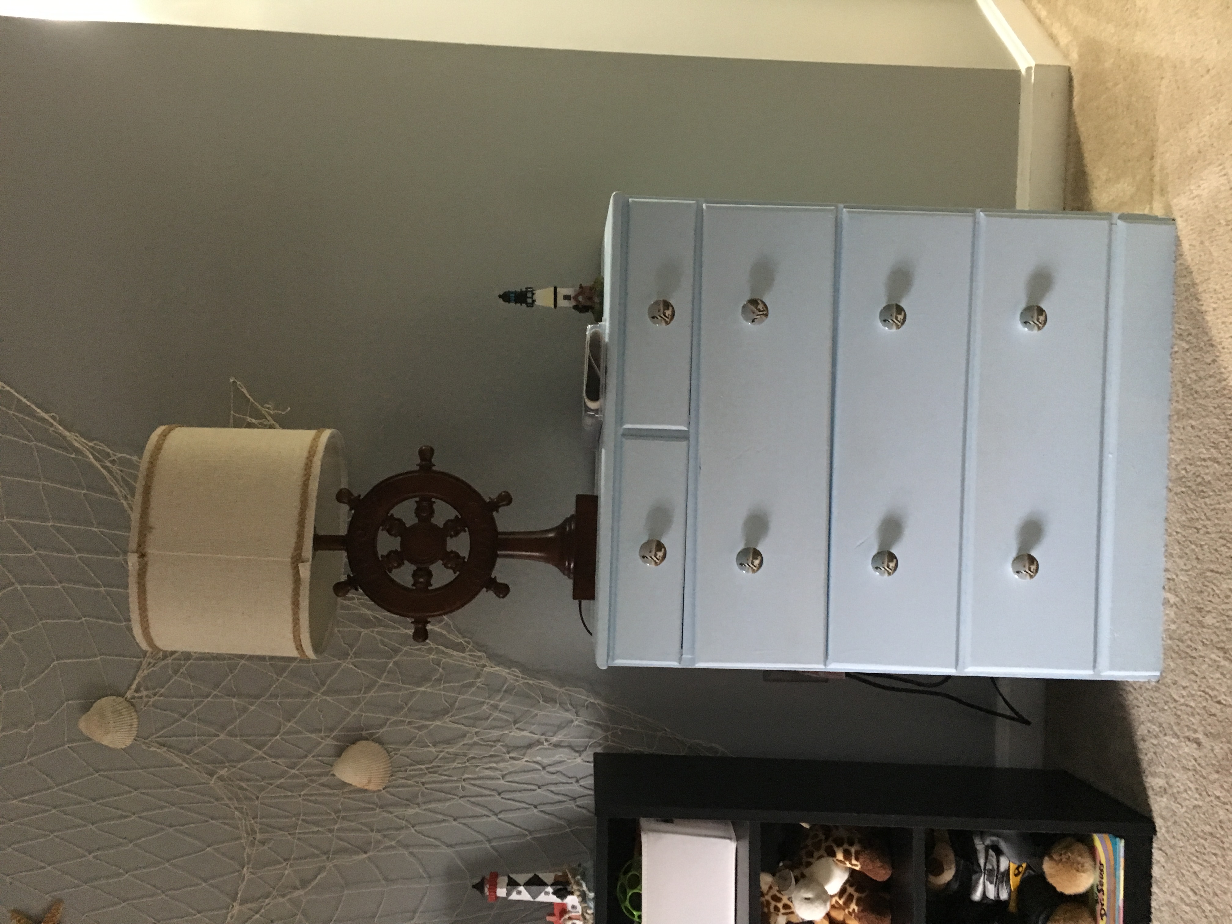Biggest challenges in this room would be the wall paper removal and repainting of EVERYTHING. Wow, that was lot of work. Also, renovated the dresser. Picked it up on Craigslist and it looks nothing like when we first bought it. Added, legs, hardware, rustic wood plank top, and painted.