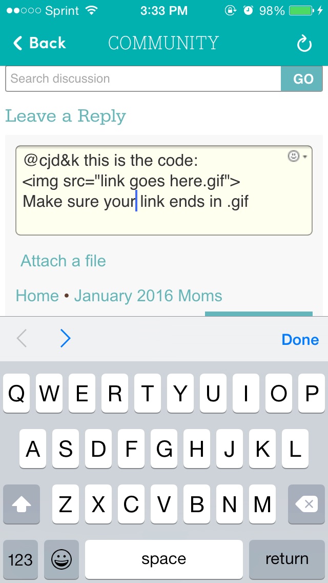 @cjd&k Sorry it took me a little while to get back. So you find the gif you like and open image - I usually have to use safari on my phone to get that, the google app doesn't let me - and make sure that the gif is the only thing on the page. Then copy the link into the code and voila!