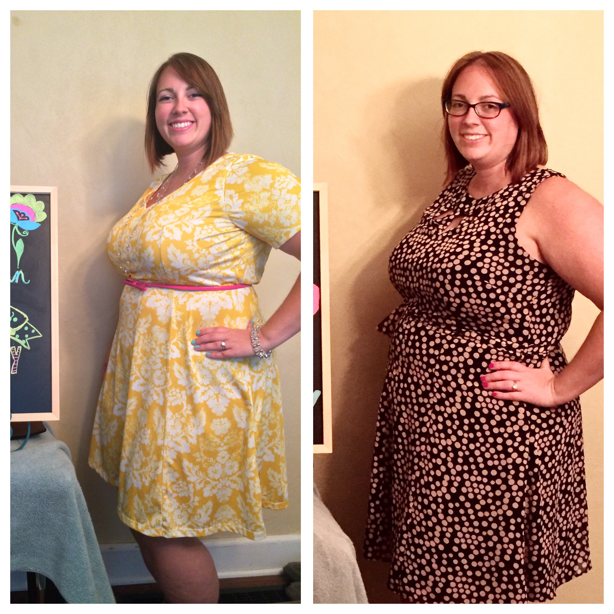 I just wanted to share a progress pic. The yellow dress is at BFP and the left is 9 weeks. It's a lot different looking than some of the Wednesday bump pics but I still see it and I'm trying to just have fun and not have expectations about what my body does differently than someone who is straight sized.