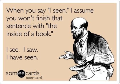 Funny how we all have our grammar pet peeves. I hate "I seen" "I could care less" and when something is broken and people say it's broke. My father says that. Argh it makes me rage.