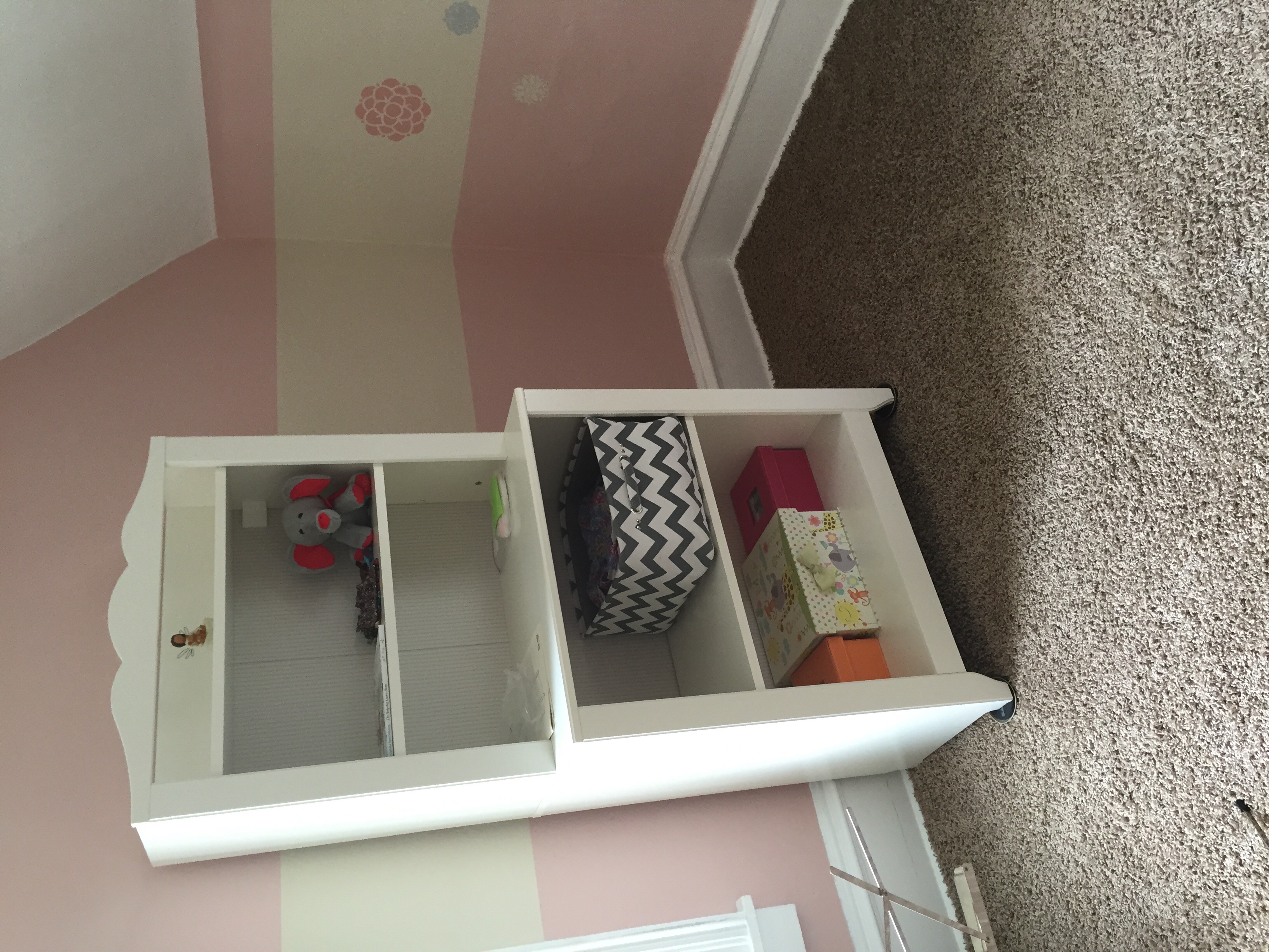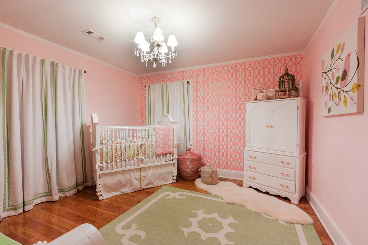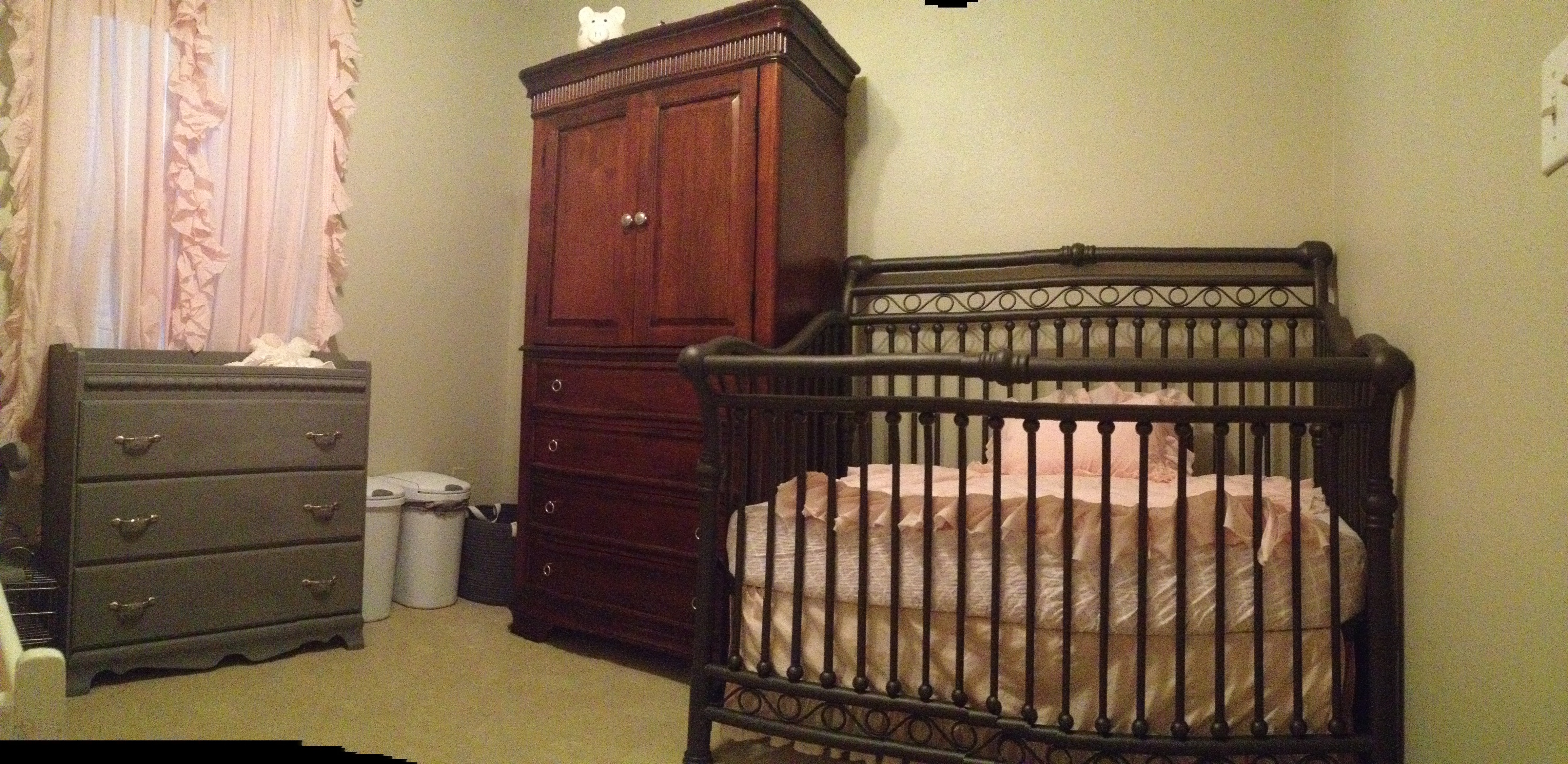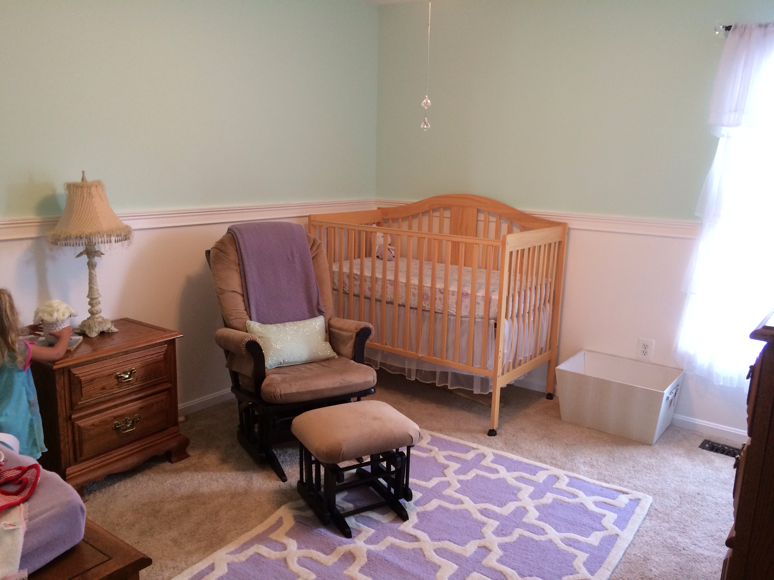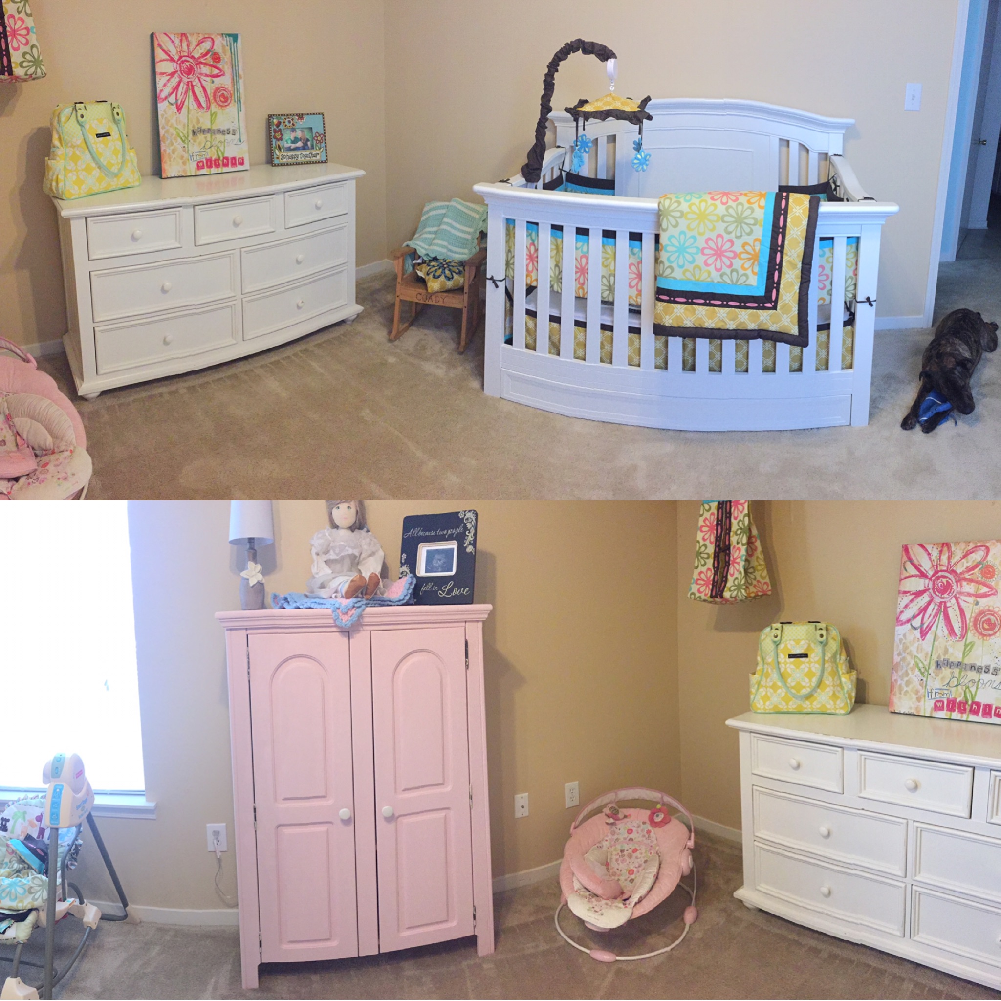 This WAS our nursery until about two months ago. It had been like this for almost 4 years...even though we let our daughter sleep with us. The crib never got any use, so DH and I resigned ourselves to the fact (after 3 kids) that we are co-sleeping hippies and we donated the crib and accessories. I am now in the process of making a big girl room that DD1 and the baby will eventually share. It is totally different - wallpaper and black trim - but I needed a change of pace from all the pink that was initially so appealing after 2 boys.