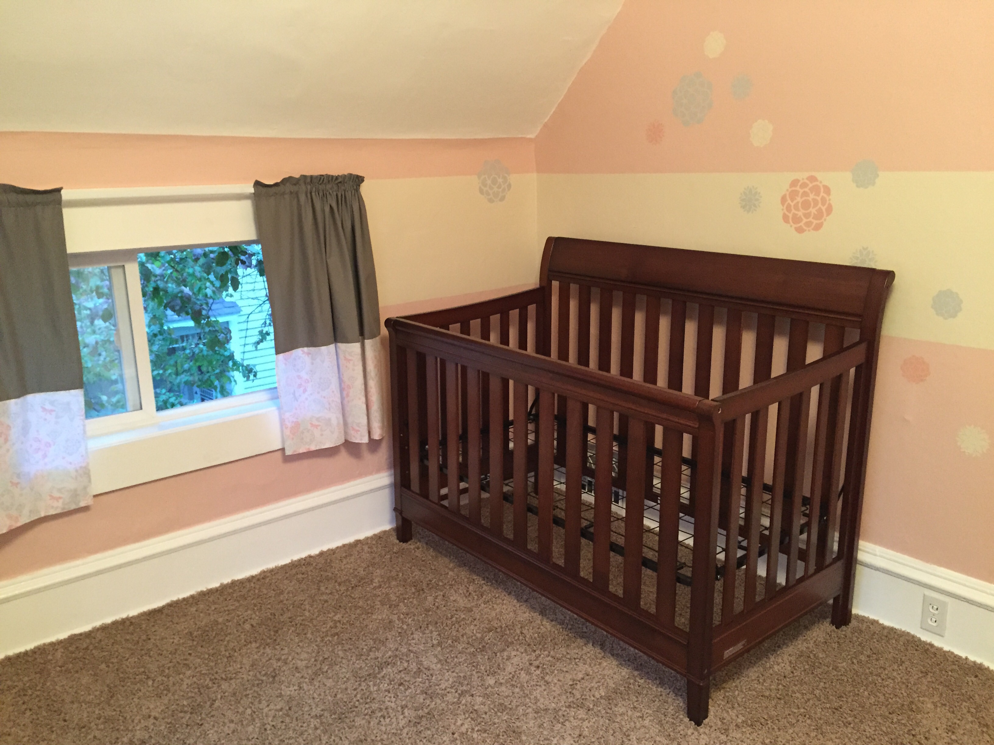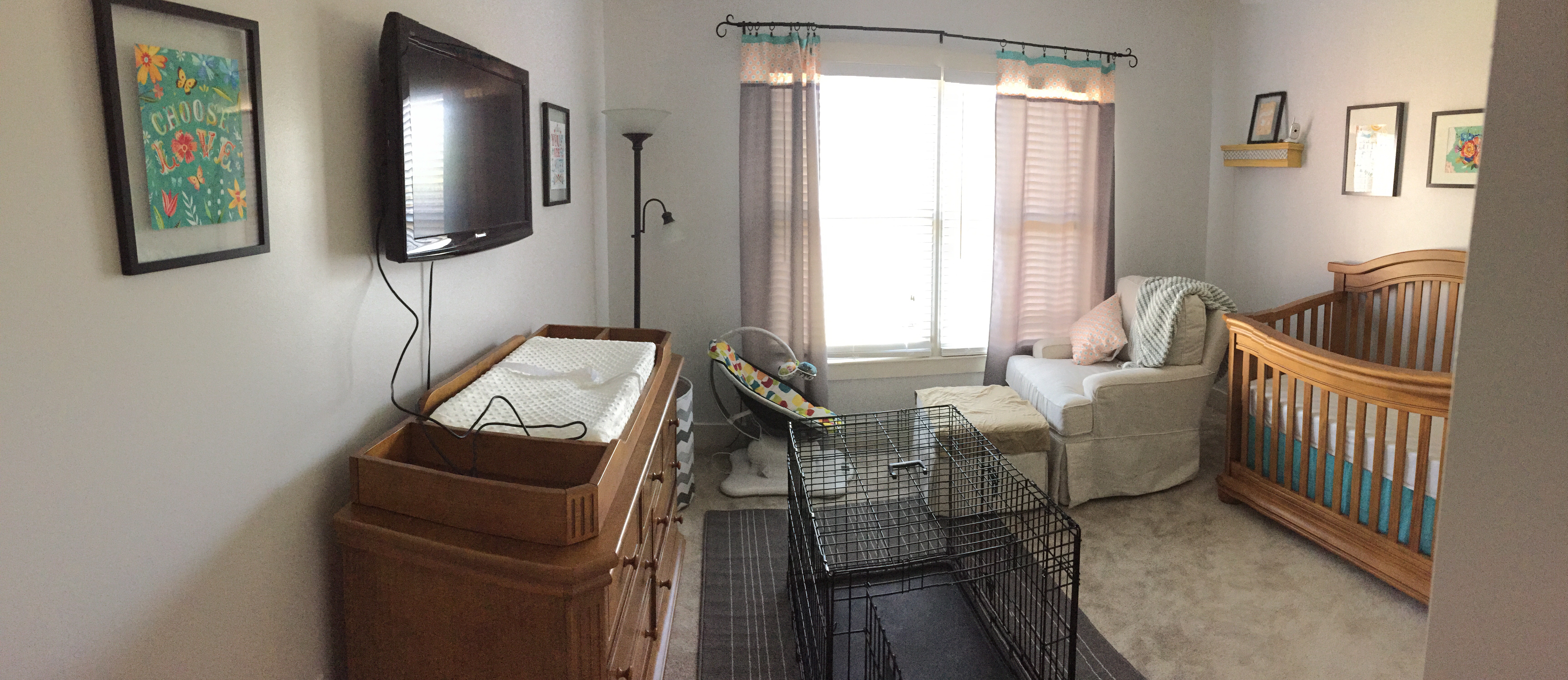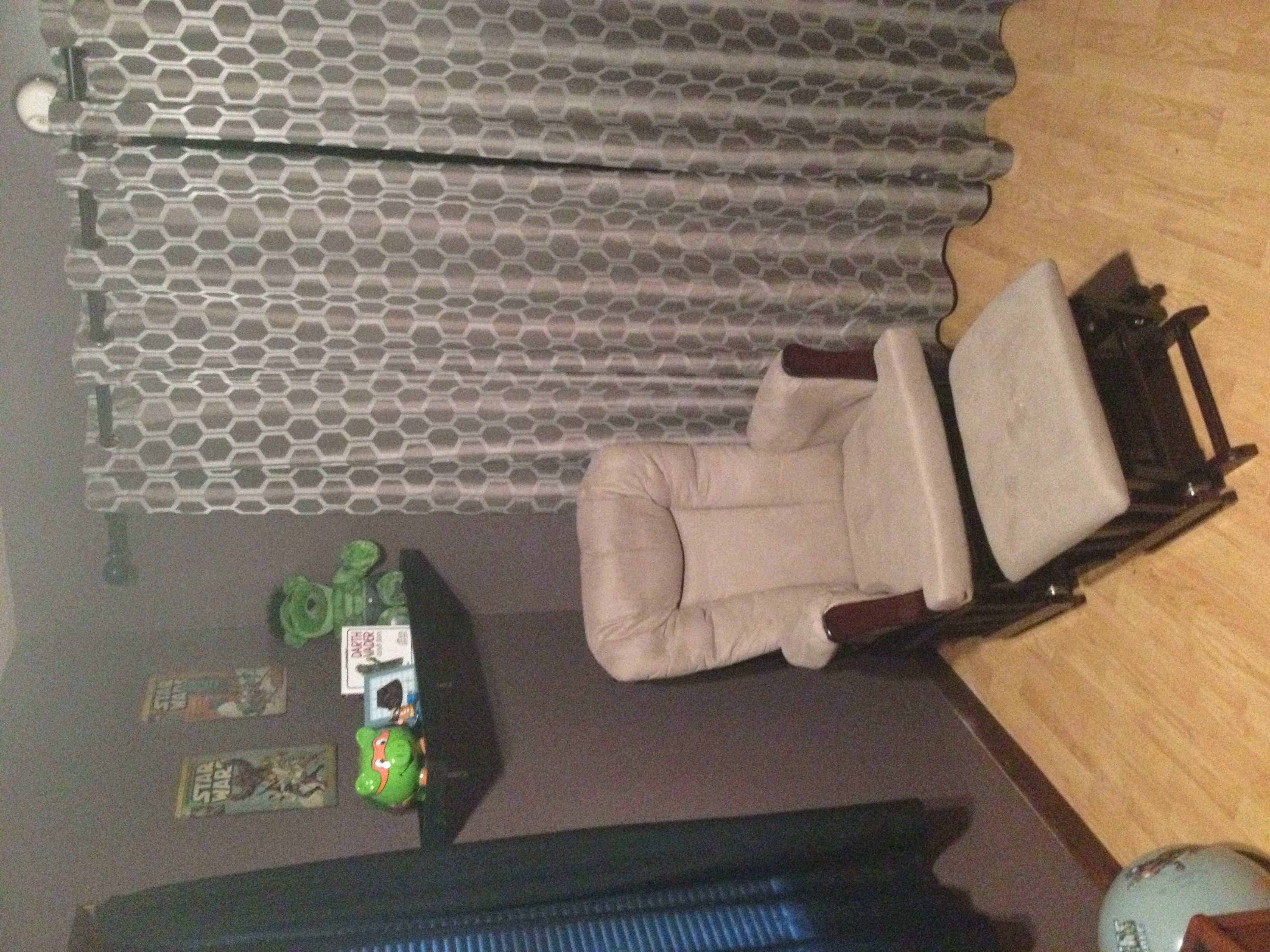 The curtains by my rocker divide the two spare rooms. For whatever reason, the previous homeowner took out the wall between the two rooms. We didn't feel like messing with putting it back up so we just bought curtains to separate them. We're using the dresser as his changing table.