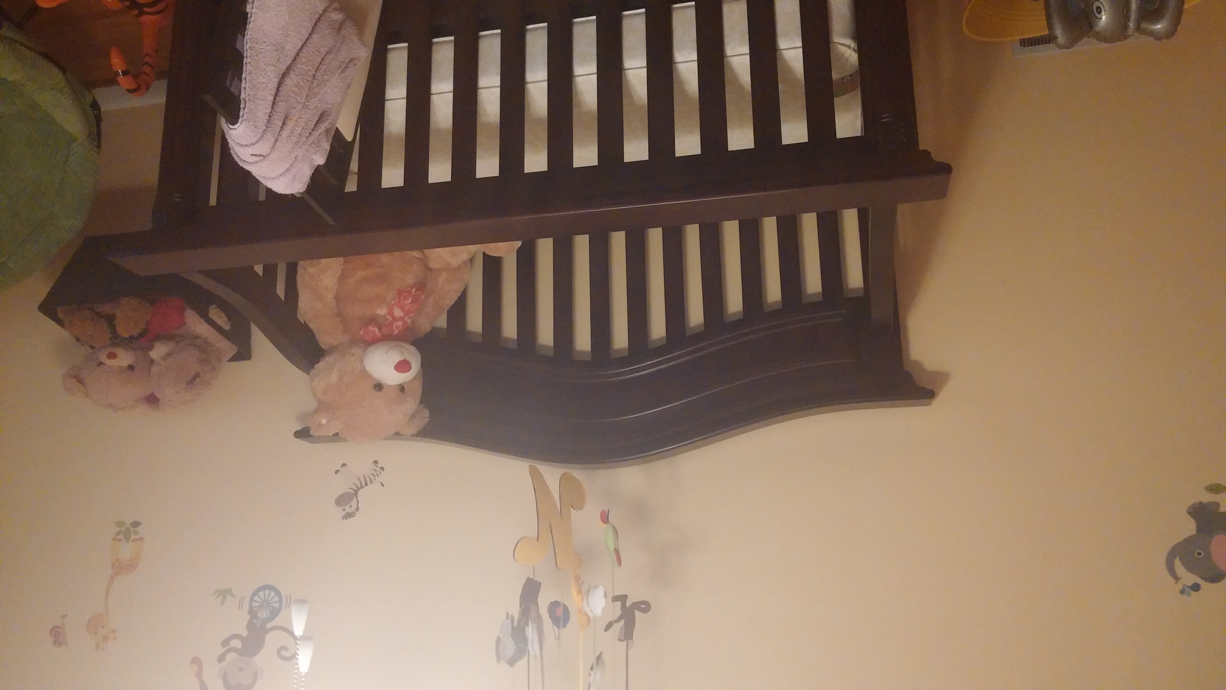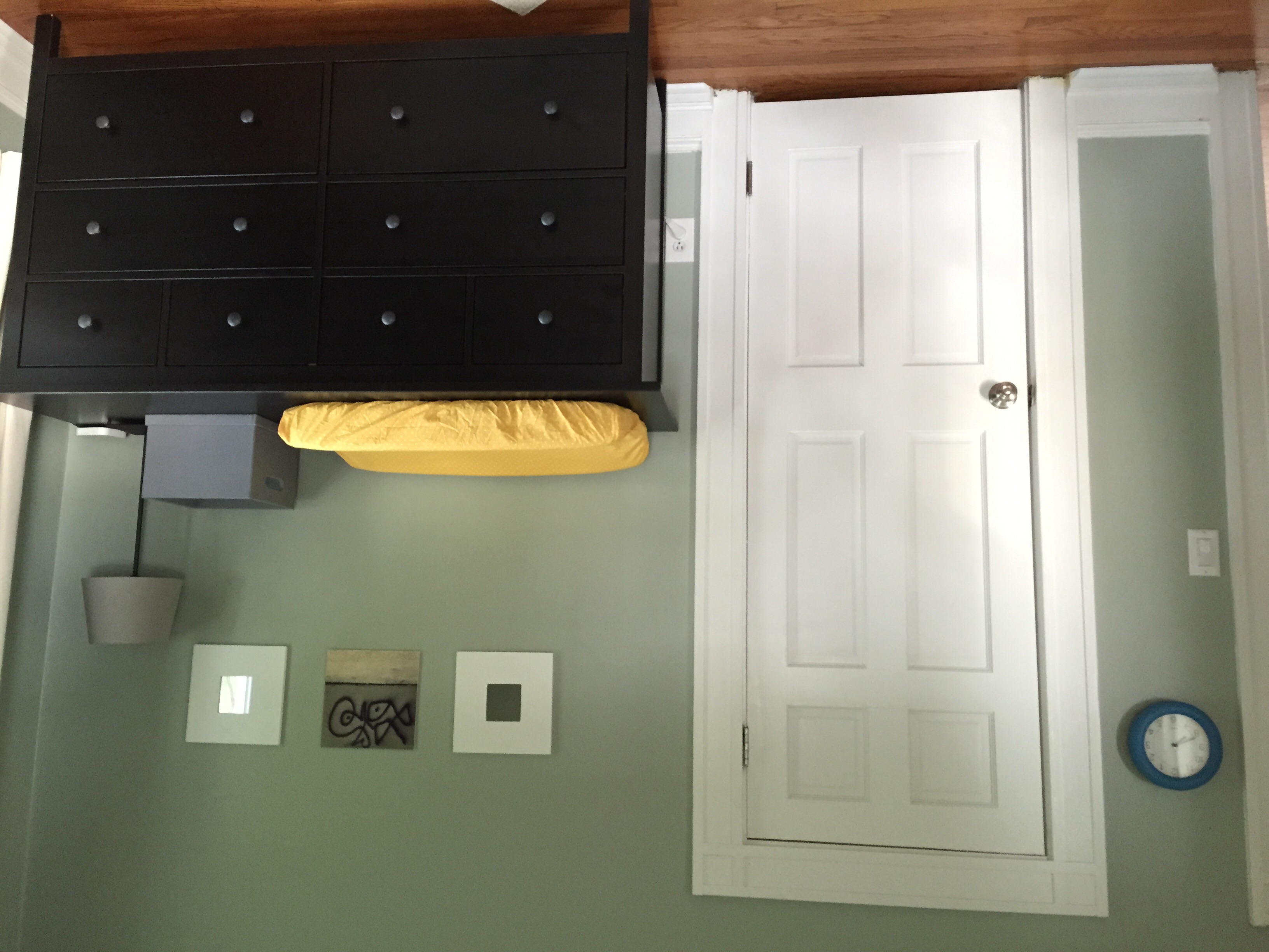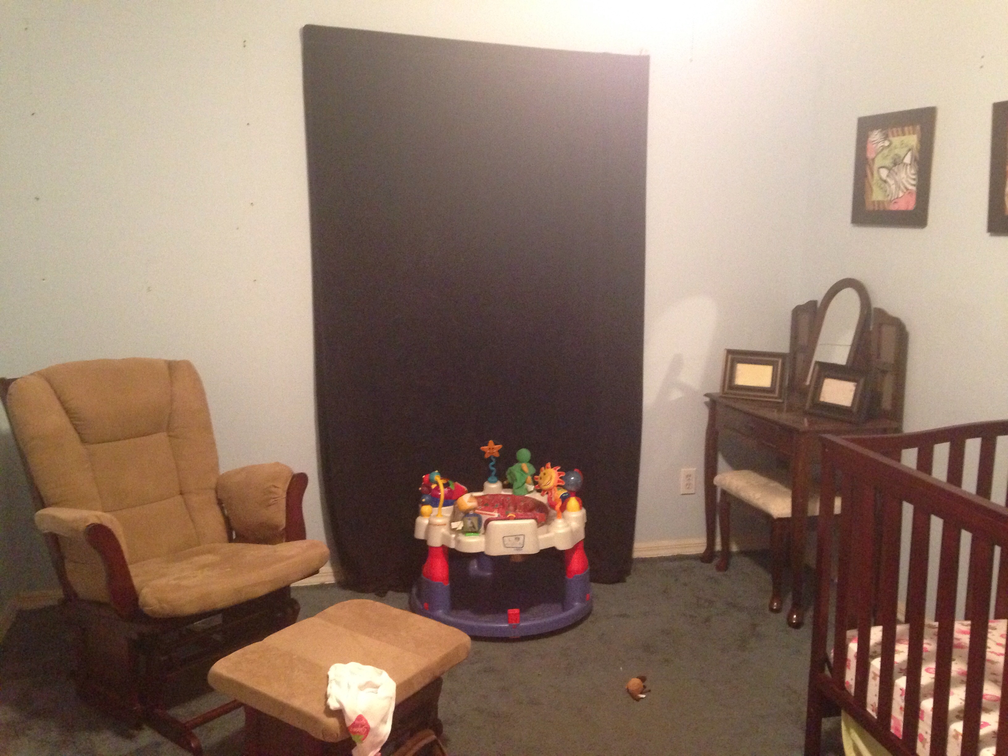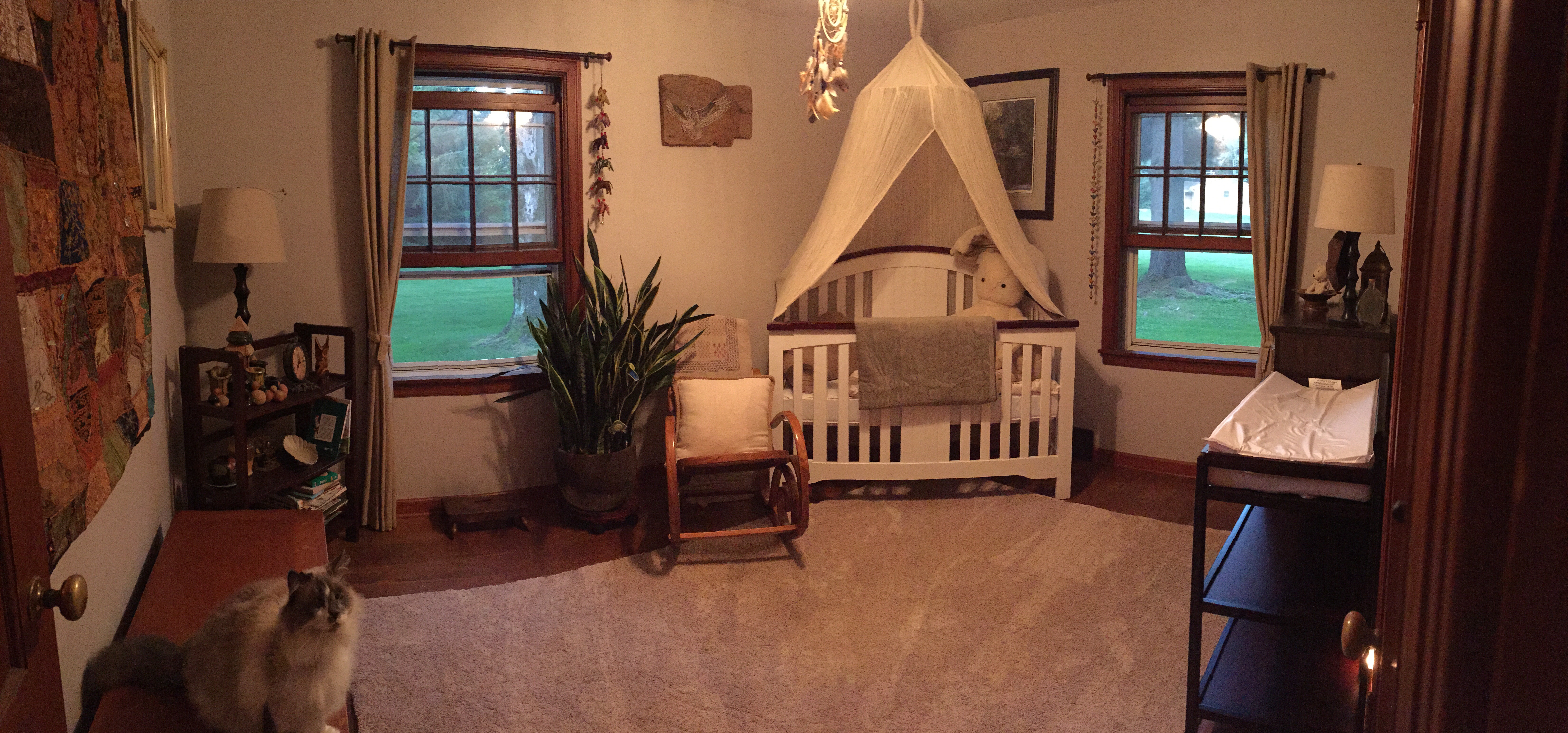 The curtains by my rocker divide the two spare rooms. For whatever reason, the previous homeowner took out the wall between the two rooms. We didn't feel like messing with putting it back up so we just bought curtains to separate them. We're using the dresser as his changing table.