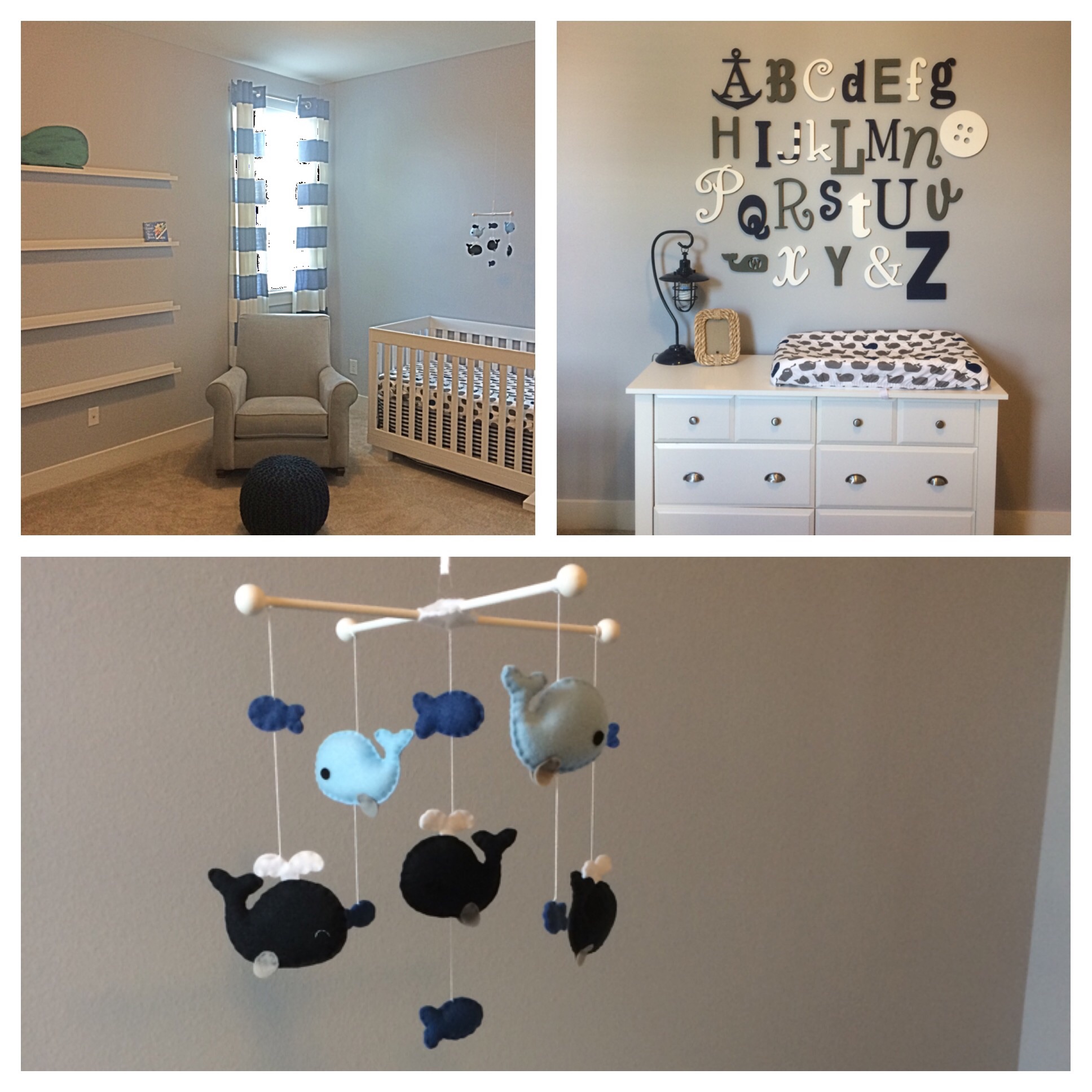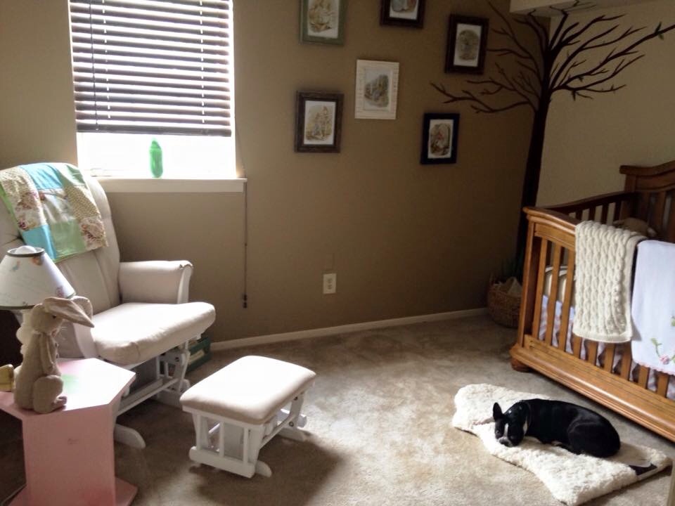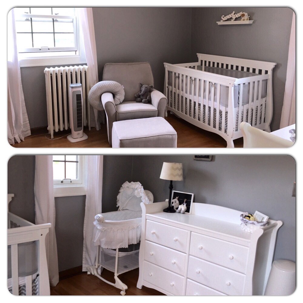 Still quite a bit to go but we got the basics started! Benjamin Moore Gray Owl paint/ Pottery Barn baby Fillmore crib and extra wide dresser/ Radcliffe rocker and ottoman