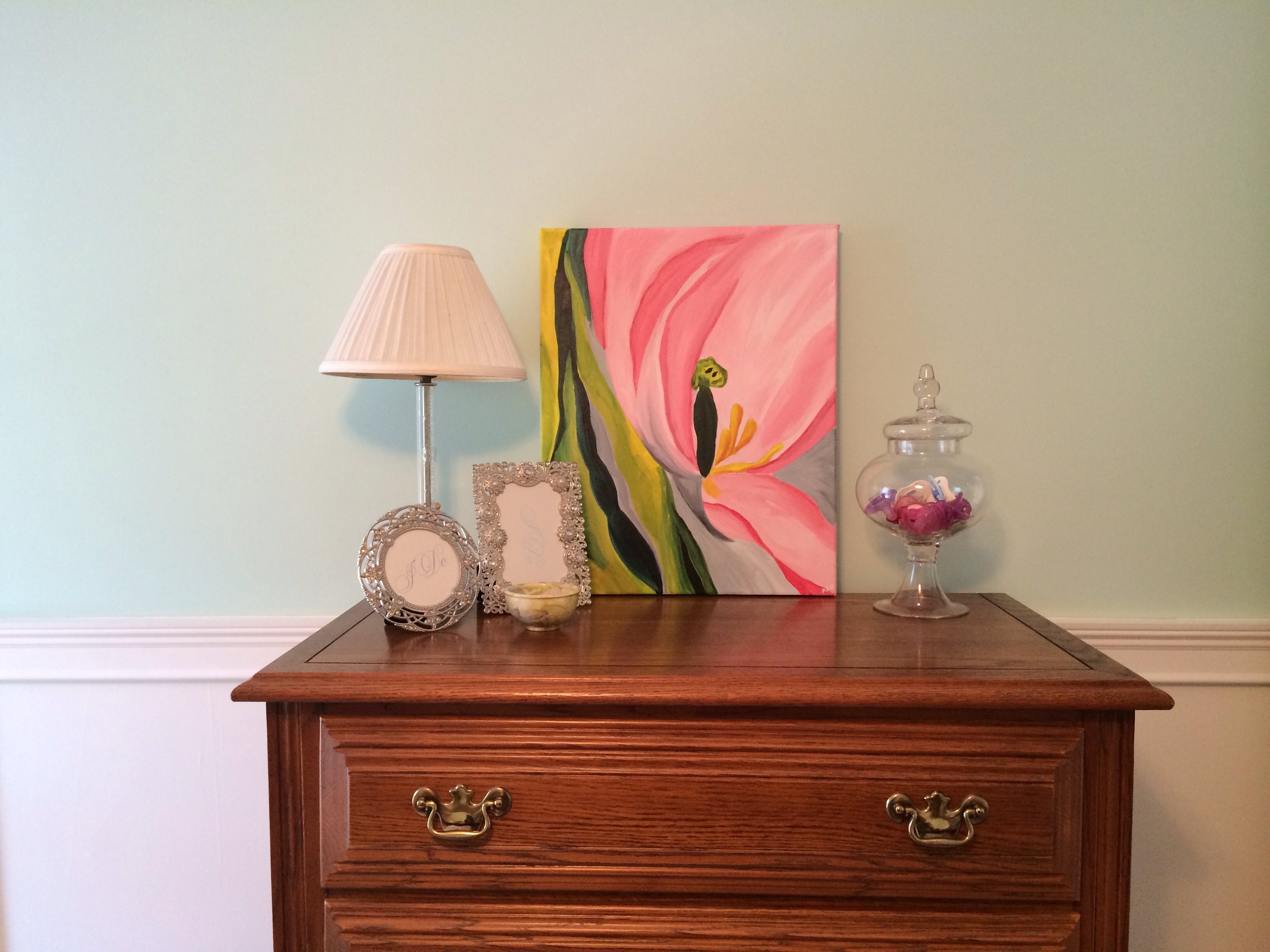My furniture isn't where it will stay and nothing is hung, but you get the gist. I will be doing a leopard print pearlized (sp?) stencil on the white part of the walls. It will be white on white, so just a hint of leopard. Still undecided if the pink tulip painting will go in her room. I painted it while she was in my belly, so it's kinda meaningful, I guess. Also, I'm looking for new lamps. These came out of grandma's house.