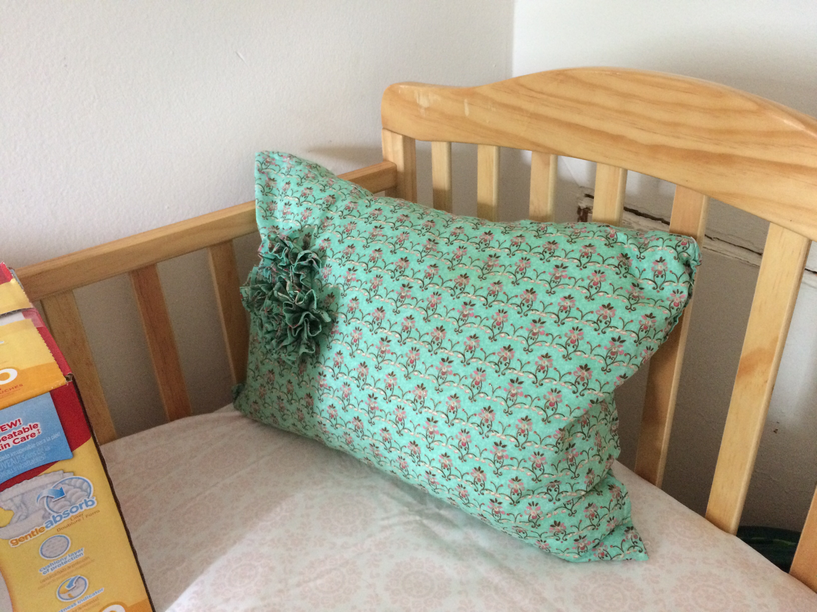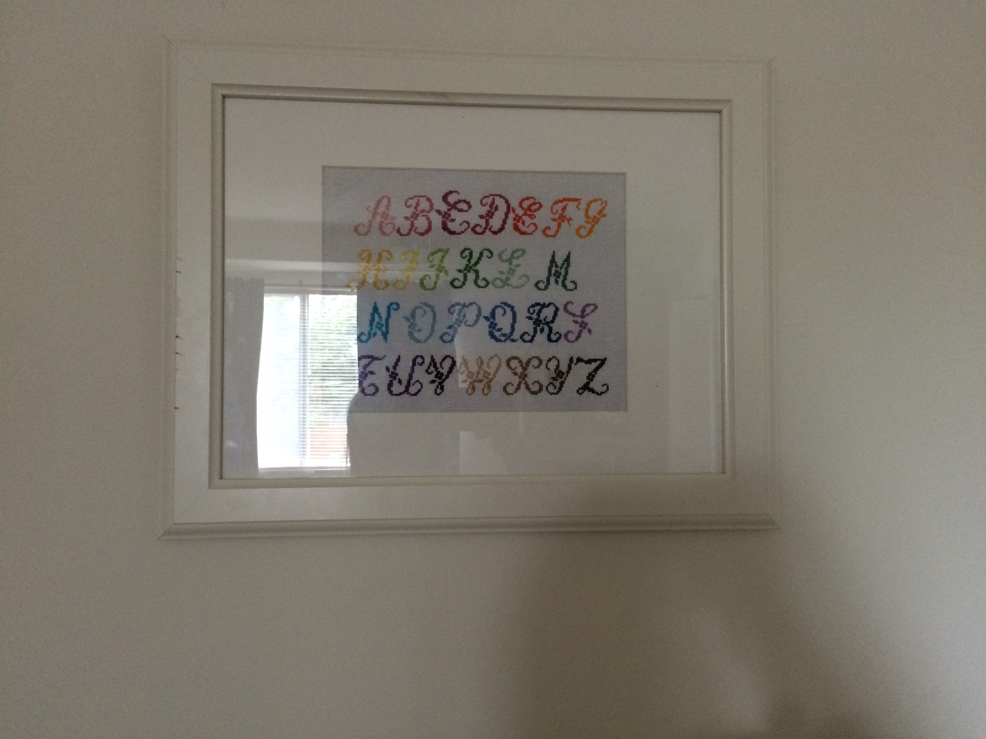 I made the pillow that's currently sitting in the crib as well as the cross stitch of the alphabet. (I wanted to do something with a rainbow since DD is my rainbow baby, but I couldn't find any patterns I liked . . . So I did the alphabet as a rainbow).