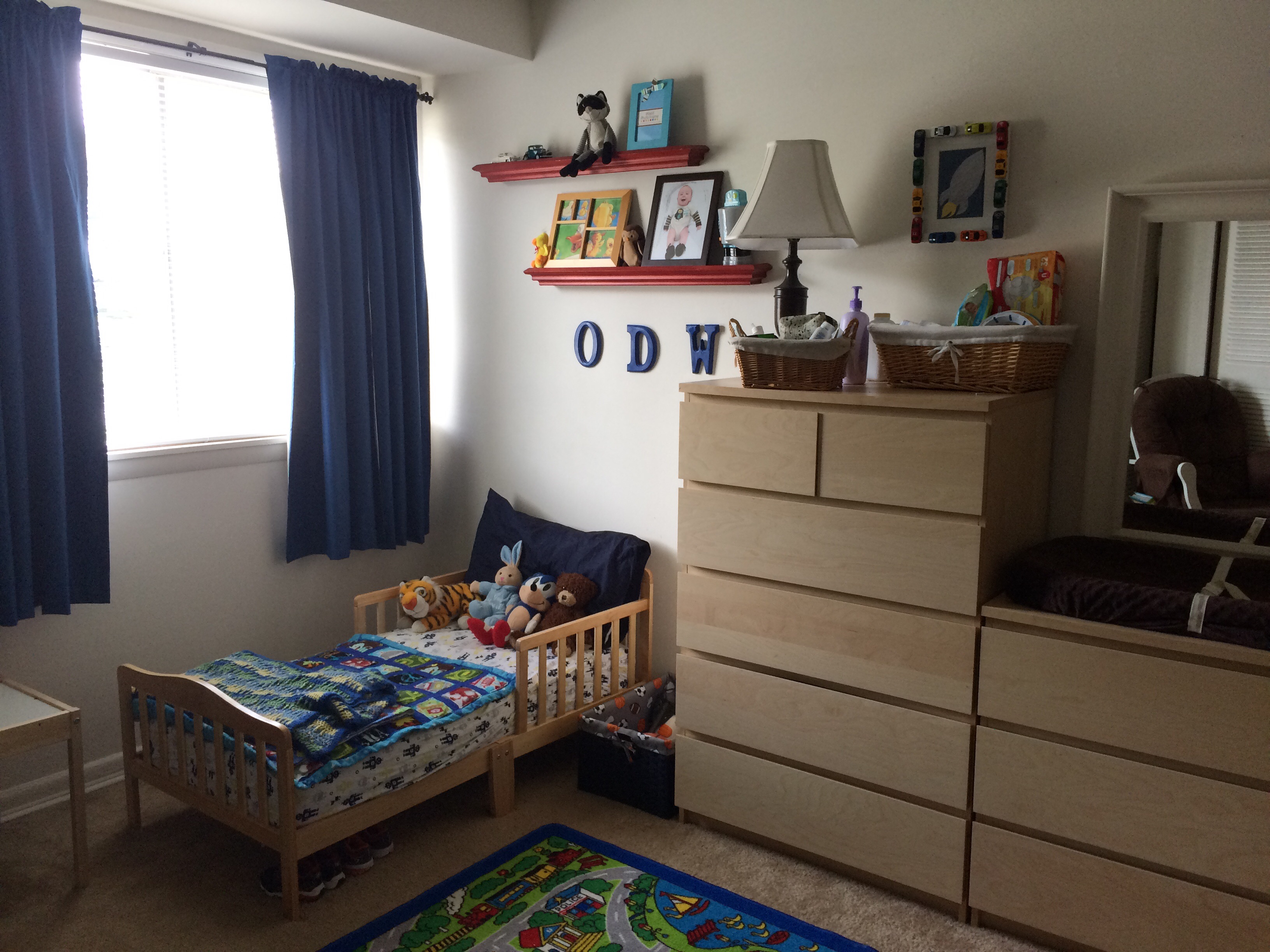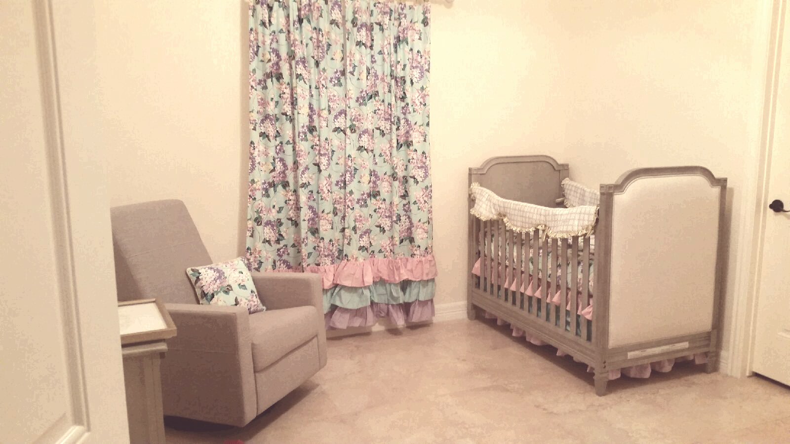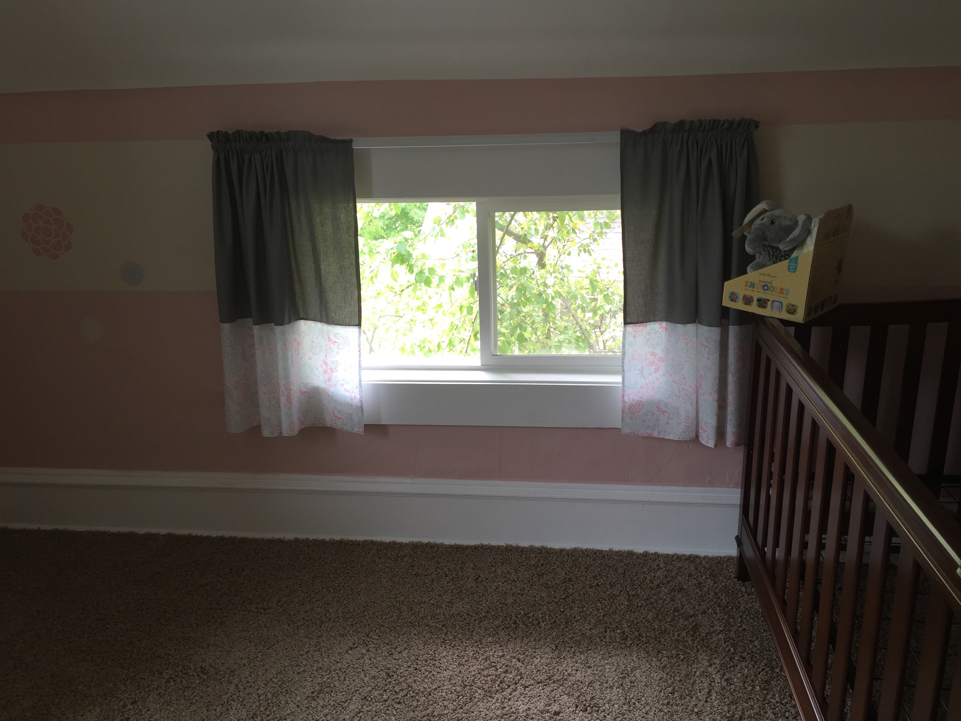 We finally just got ours all finished. Try not to be jealous! Haha! The curtains by my rocker divide the two spare rooms. For whatever reason, the previous homeowner took out the wall between the two rooms. We didn't feel like messing with putting it back up so we just bought curtains to separate them. We're using the dresser as his changing table.