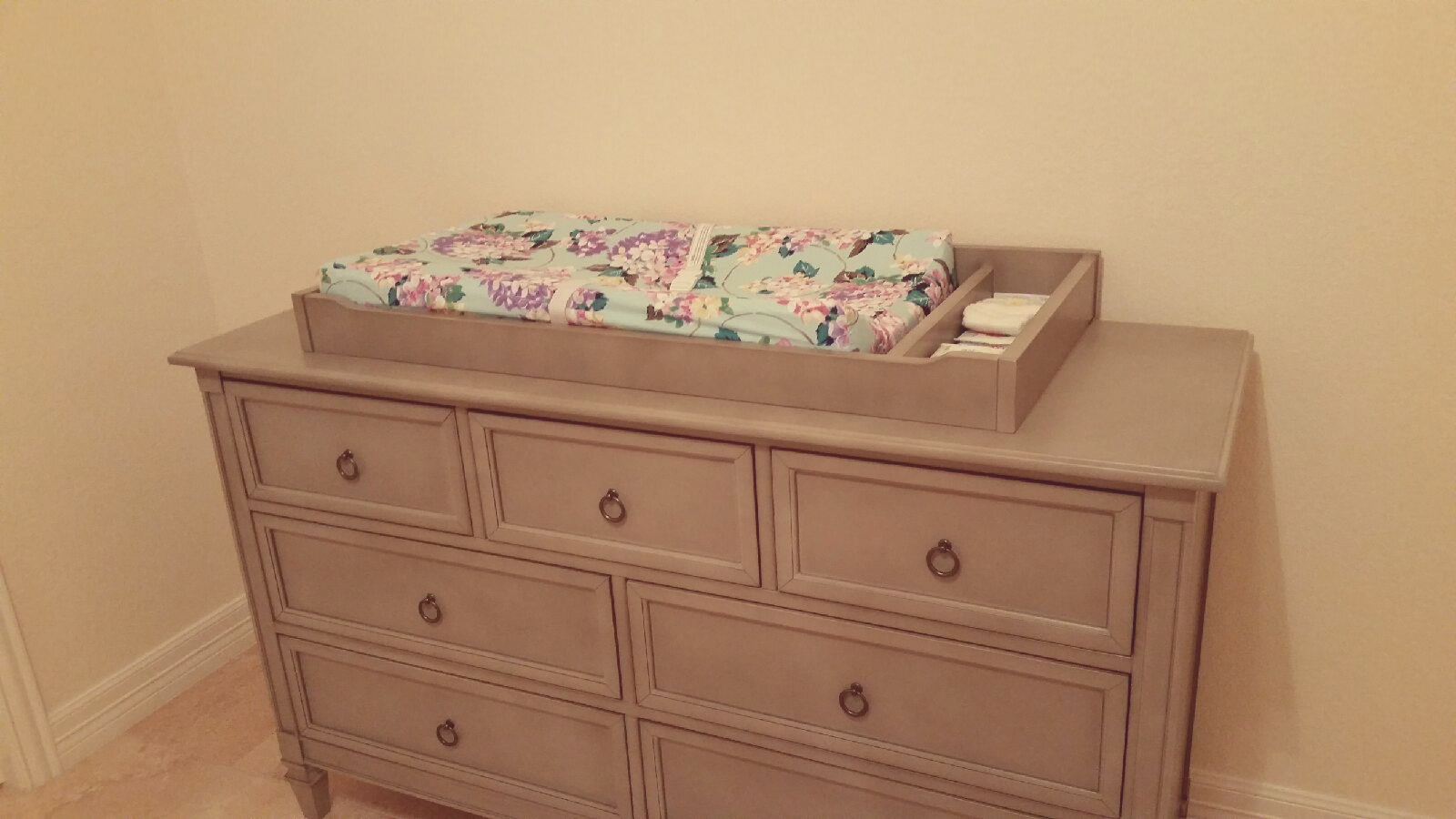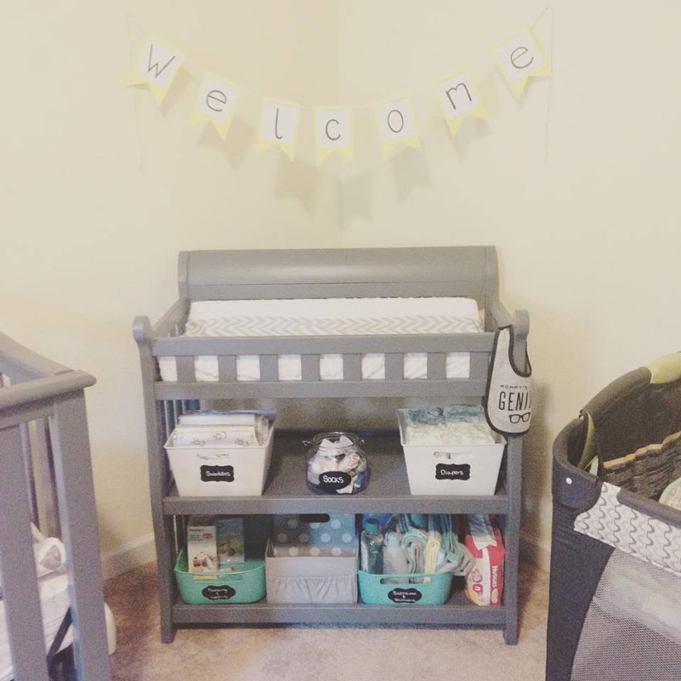 Mine is still a work in progress (and a wee bit crowded with stuff to move out once baby is here!) but here is our changing table. Our theme is gray and white with yellow and teal accents. I have a really fluffy chevron print rug that my dog is obsessed with too haha! Our changing table was originally dark wood, but my mom painted it to match our crib.
