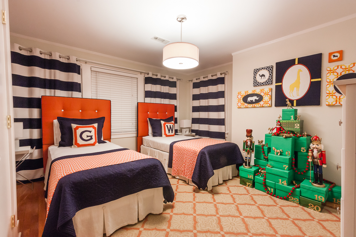 Love this! One of my son's rooms is navy and orange - the stripes are my favorite. We've used the exact scheme in two houses now. (green boxes were an advent calendar)