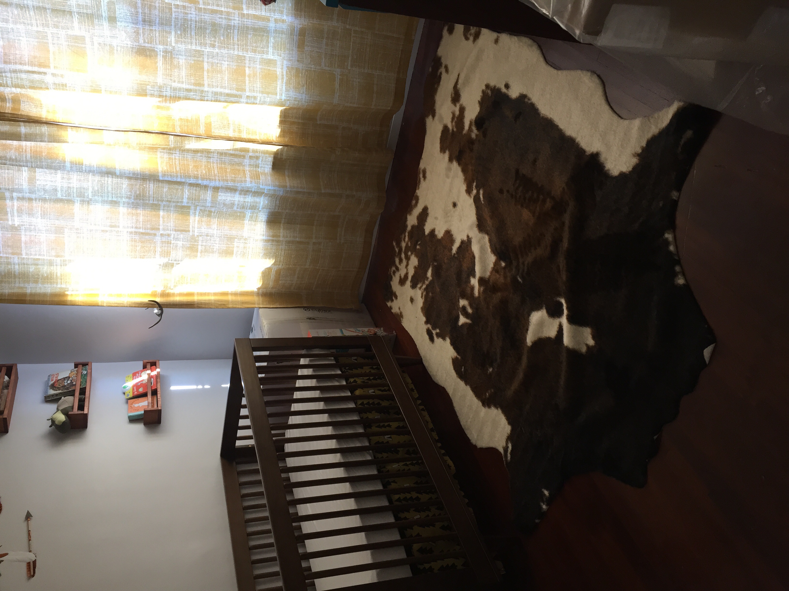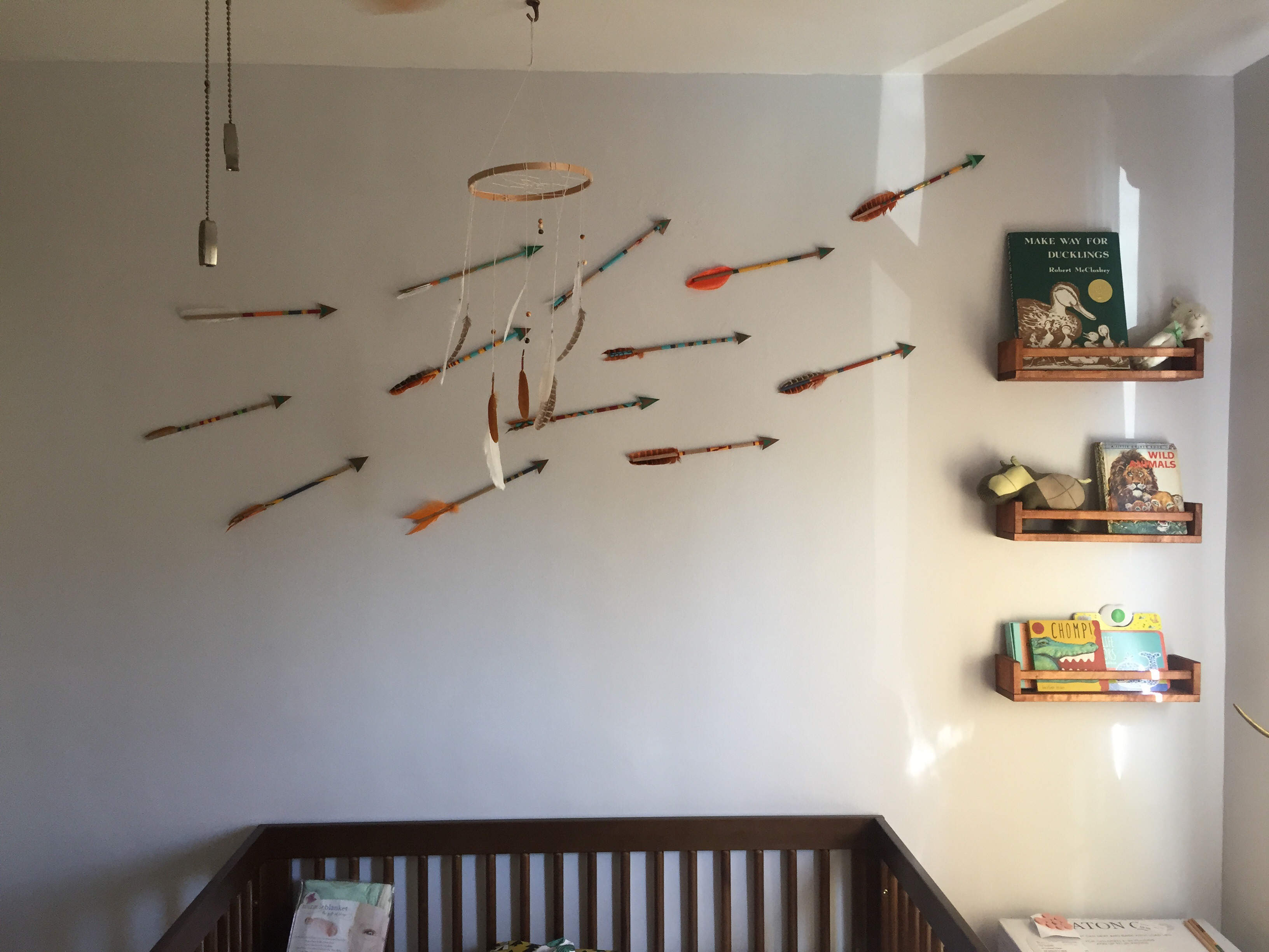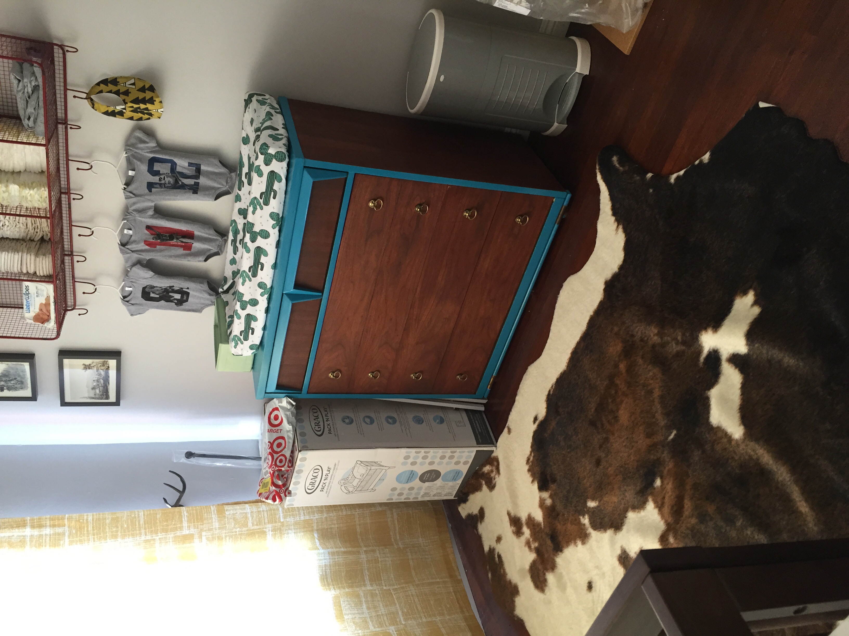 Ignore the boxes in the corners! Turned out to be a kind of southwest theme I guess. I refinished and painted the dresser/changing table and my friends and I made the mobiles and vintage-inspired arrows at my shower. the rug is faux cowhide