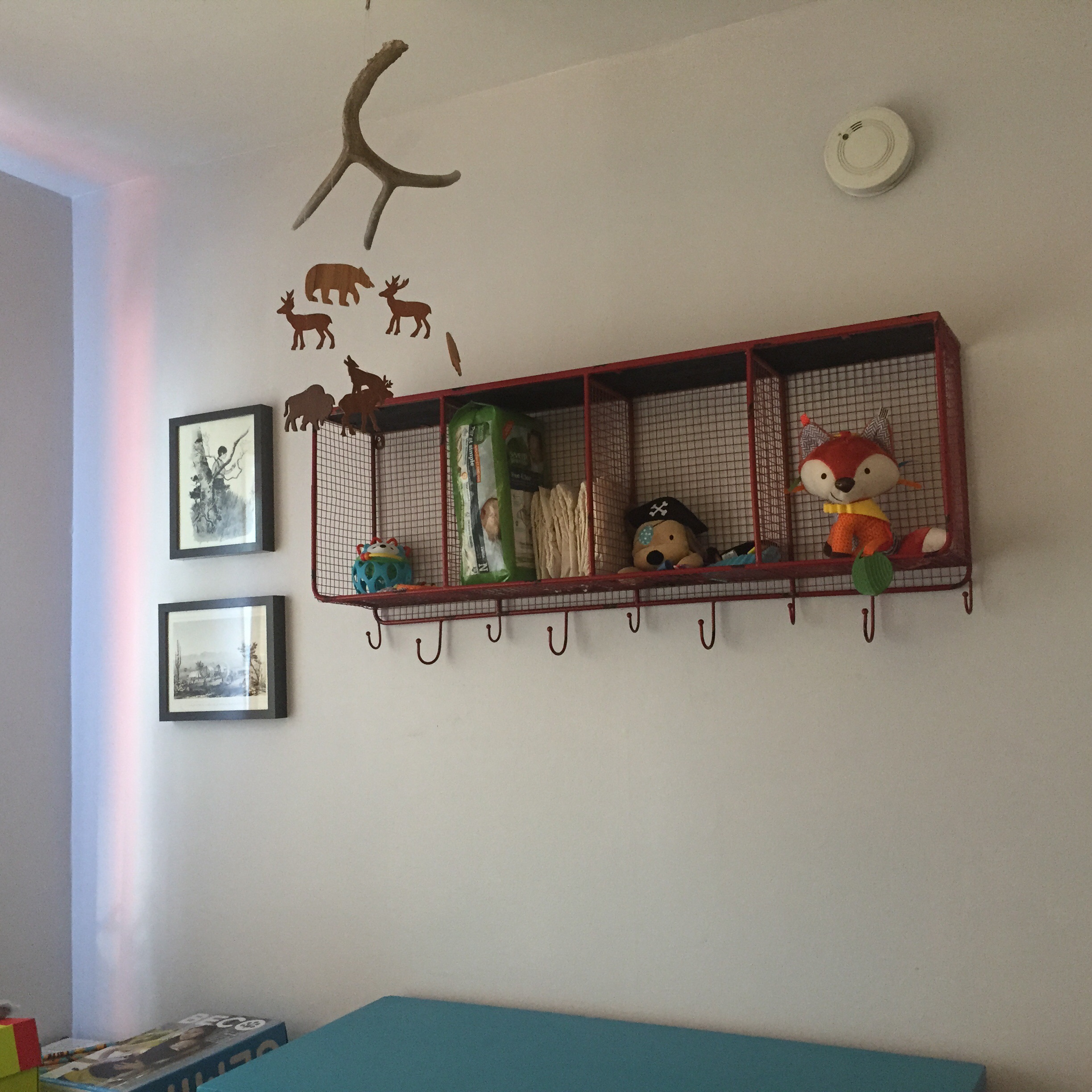 My dad built me this desk/wall unit in middle school and my sister and i originally used it as a dresser. I padded the desk as a changing table, with diapers and swaddling blankets on the shelves above. Bottles supplies are currently left and right. From there down, there are baskets on every shelf for clothes and two large baskets below the changing table full of books. An owl piggy bank i love has a home here as well and the mantle is perfect for decorations.