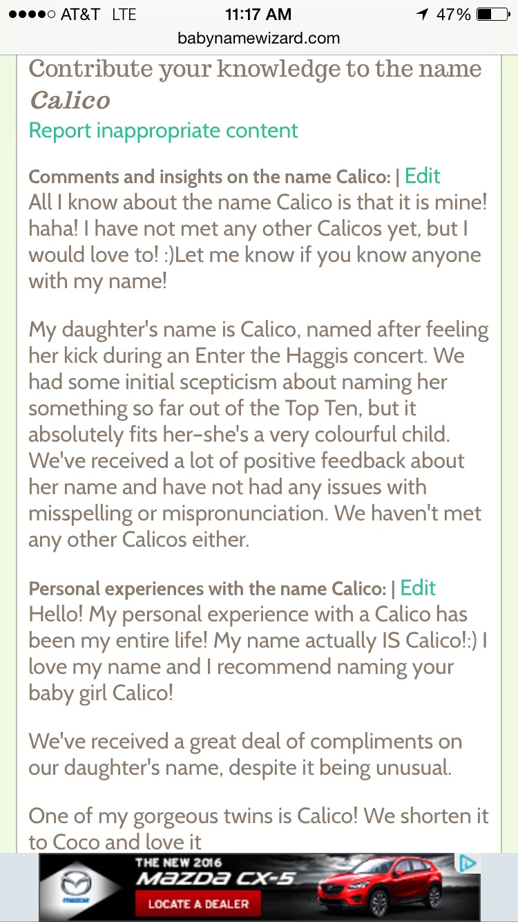 That's not the reason I want to name my child calico. I didn't even know until I searched the name.