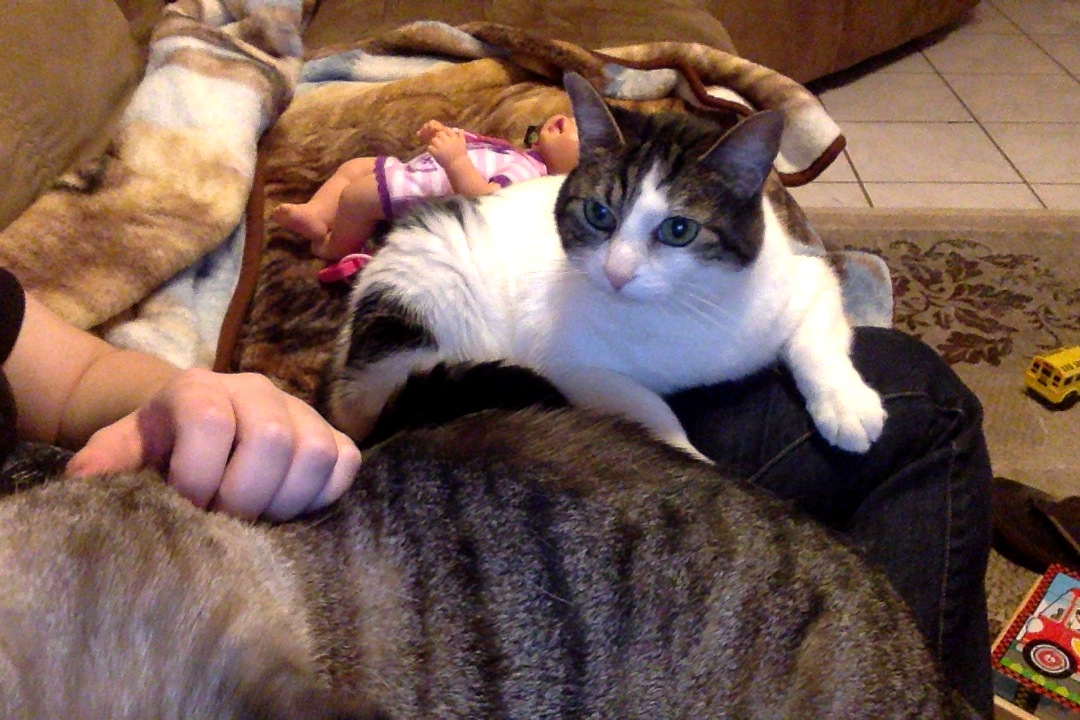 We have three fur babies Titus rescued at 16 weeks (whiter one) Tillie rescued and two (darker one) and Nox (cat) found in the gutter in the middle of winter. Vet thinks he is around one