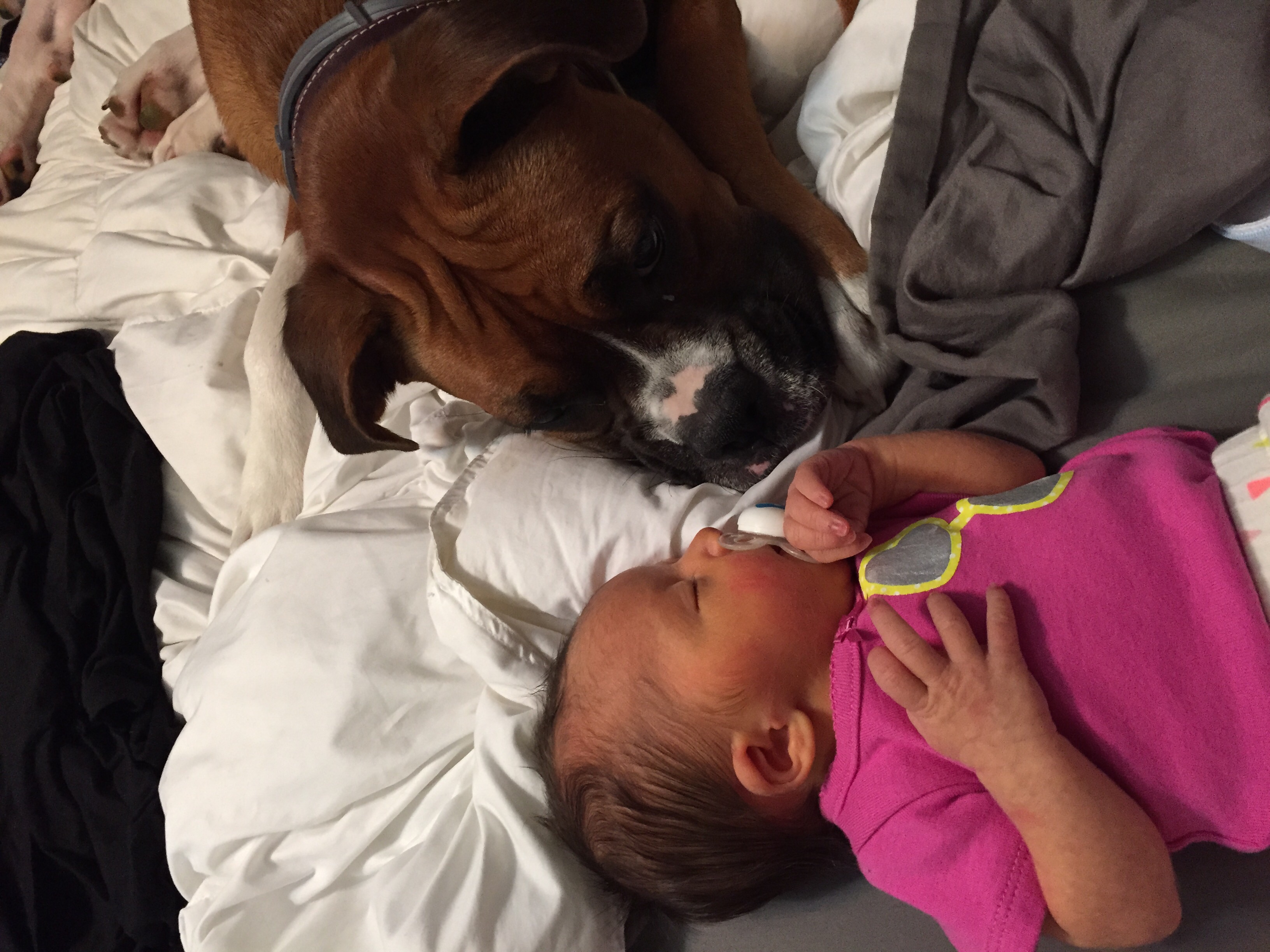 Little Scarlett is amazing at 4 weeks old! The furry one (Phoebe) is in love too and helps get Scarlett dressed in the morning.
