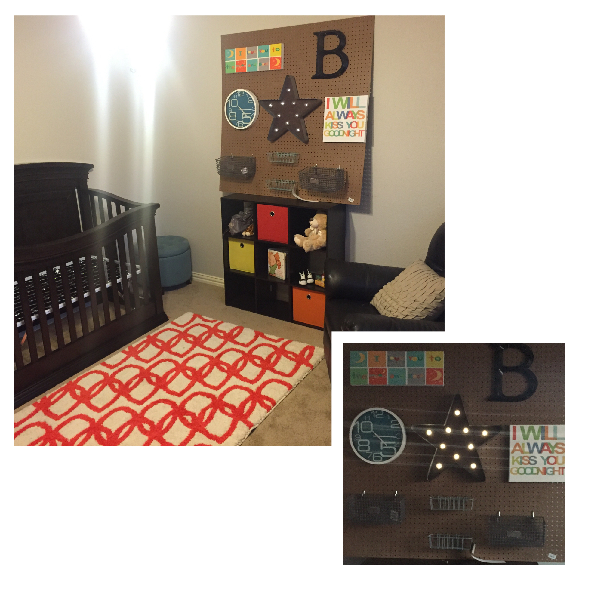 I have been planning this pegboard project for a while and finally was able to start putting it together! I'm debating painting the board red to add some color... Thoughts? We are renting and didn't want to put many holes in the wall and can't paint so this has really saved us! My grandmother is making our bedding in these colors as well! My favorite part is the star that can also be used as a night light.