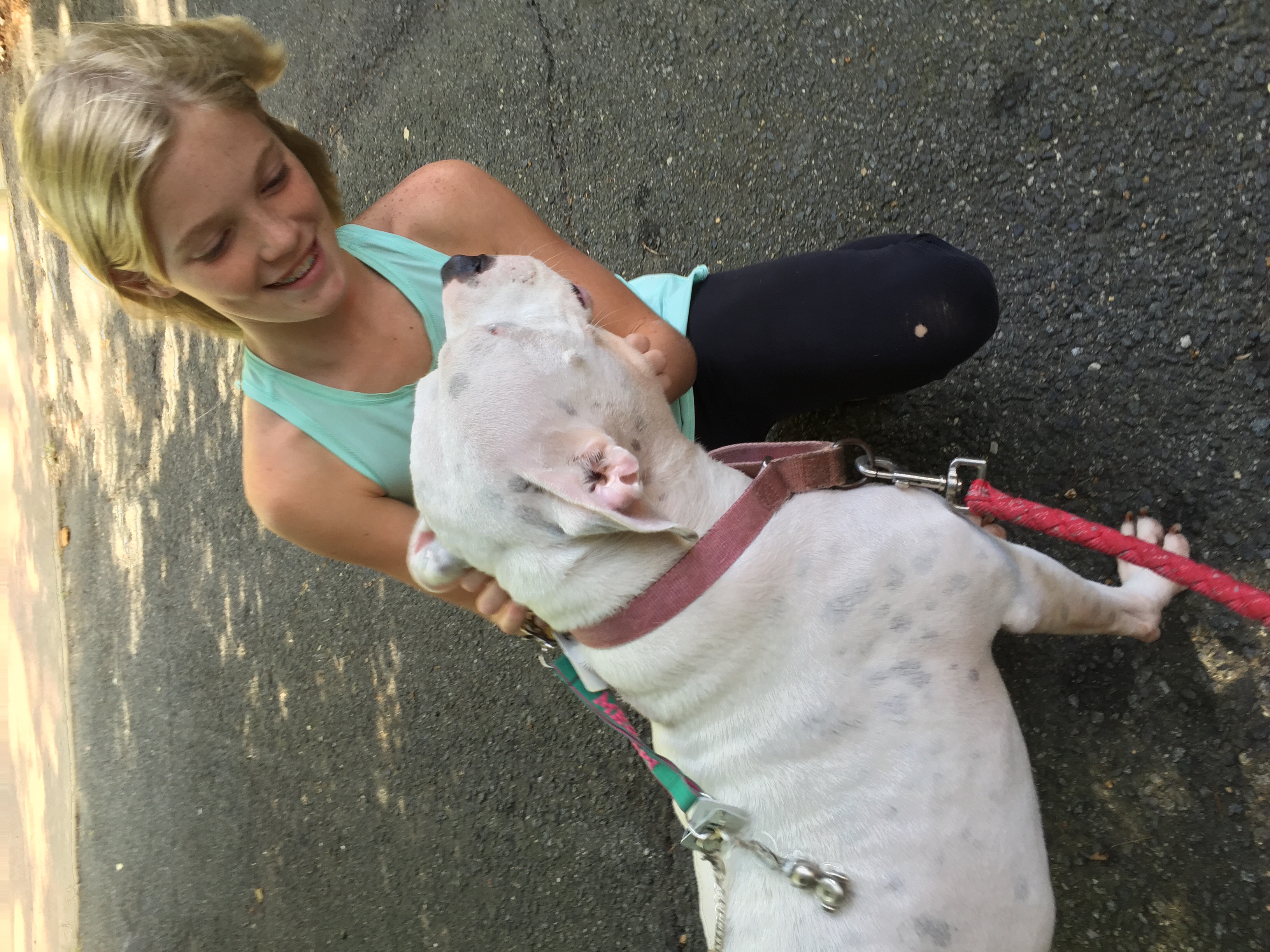 For fun, this is one of the dogs I work with, her name is Daisy, and this is Sarah, a girl who WAS afraid of pitbull a (because her mother is one of THOSE people *insert eye roll*) Sarah asks about her every day and she nearly cried when I told her Daisy belongs to her owner and Sarah can't keep her. Lol