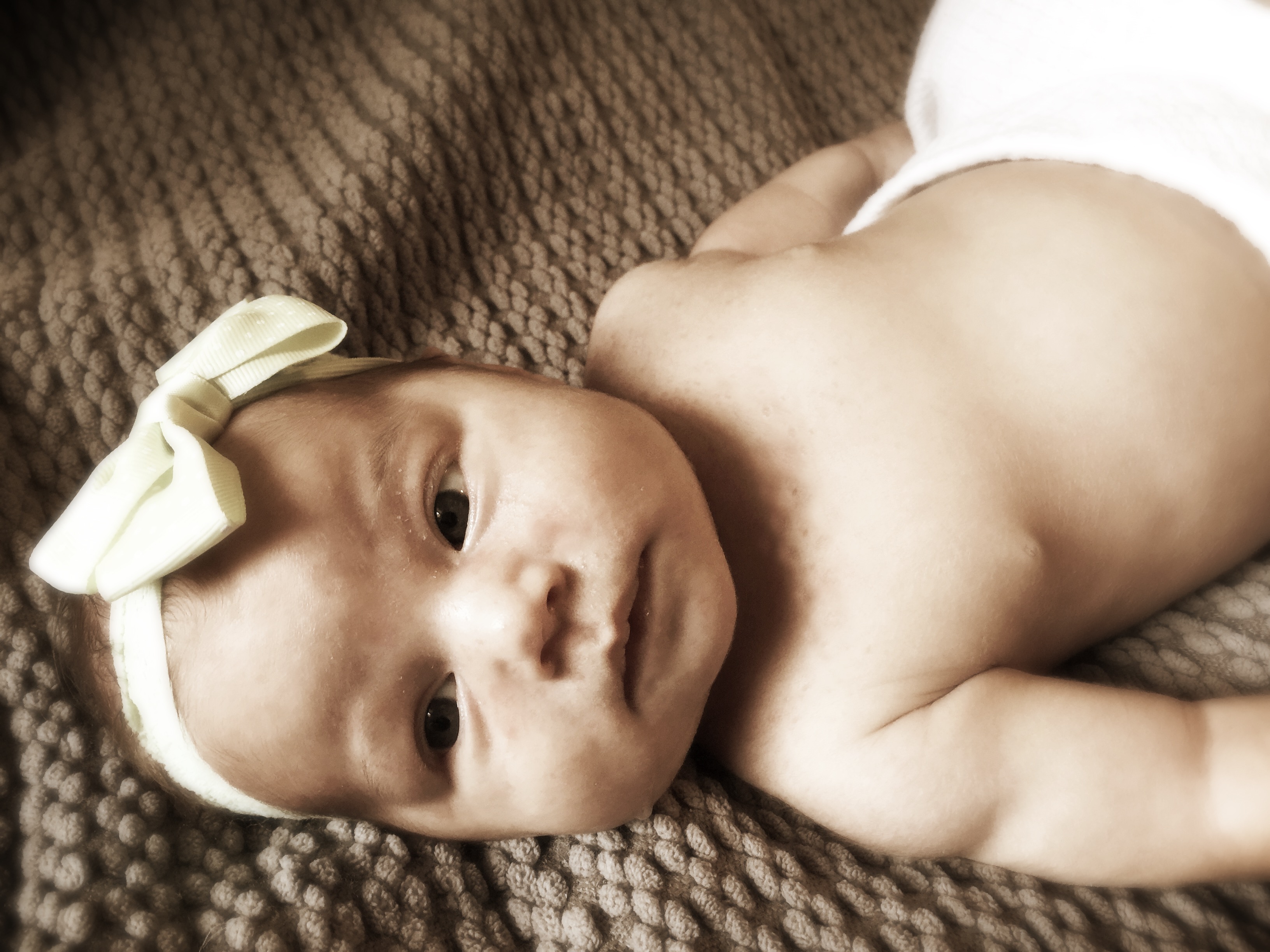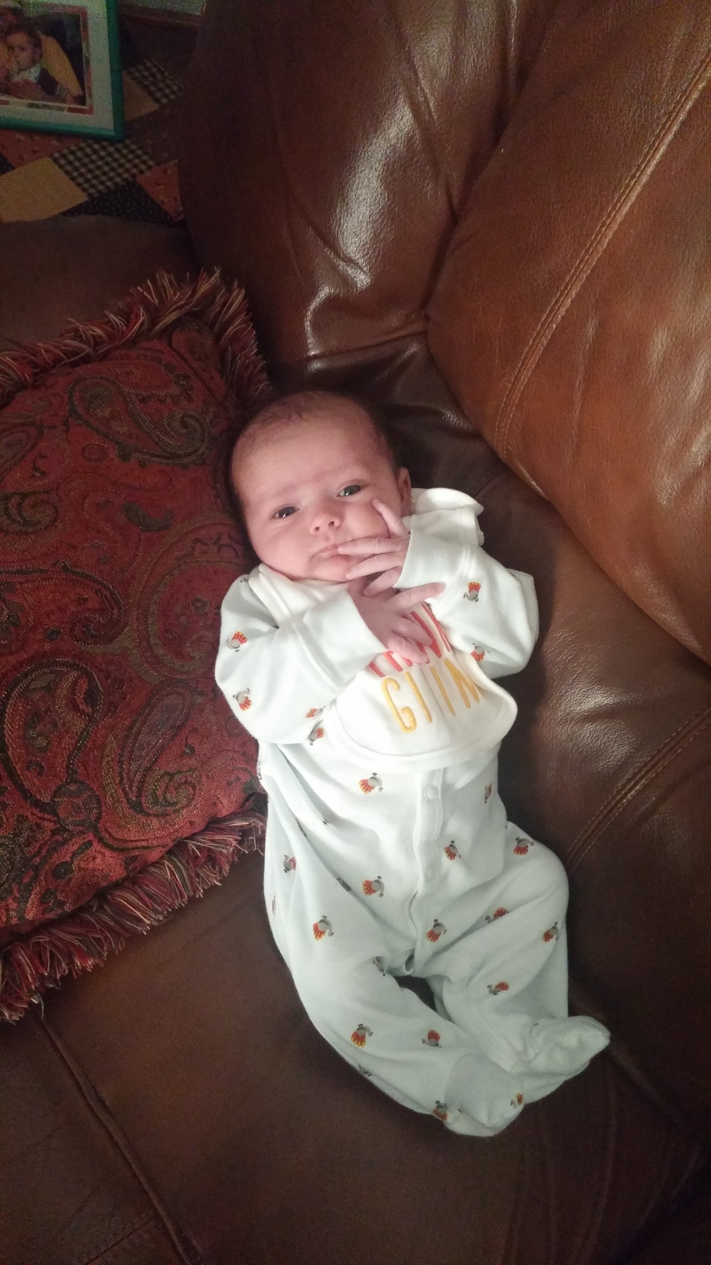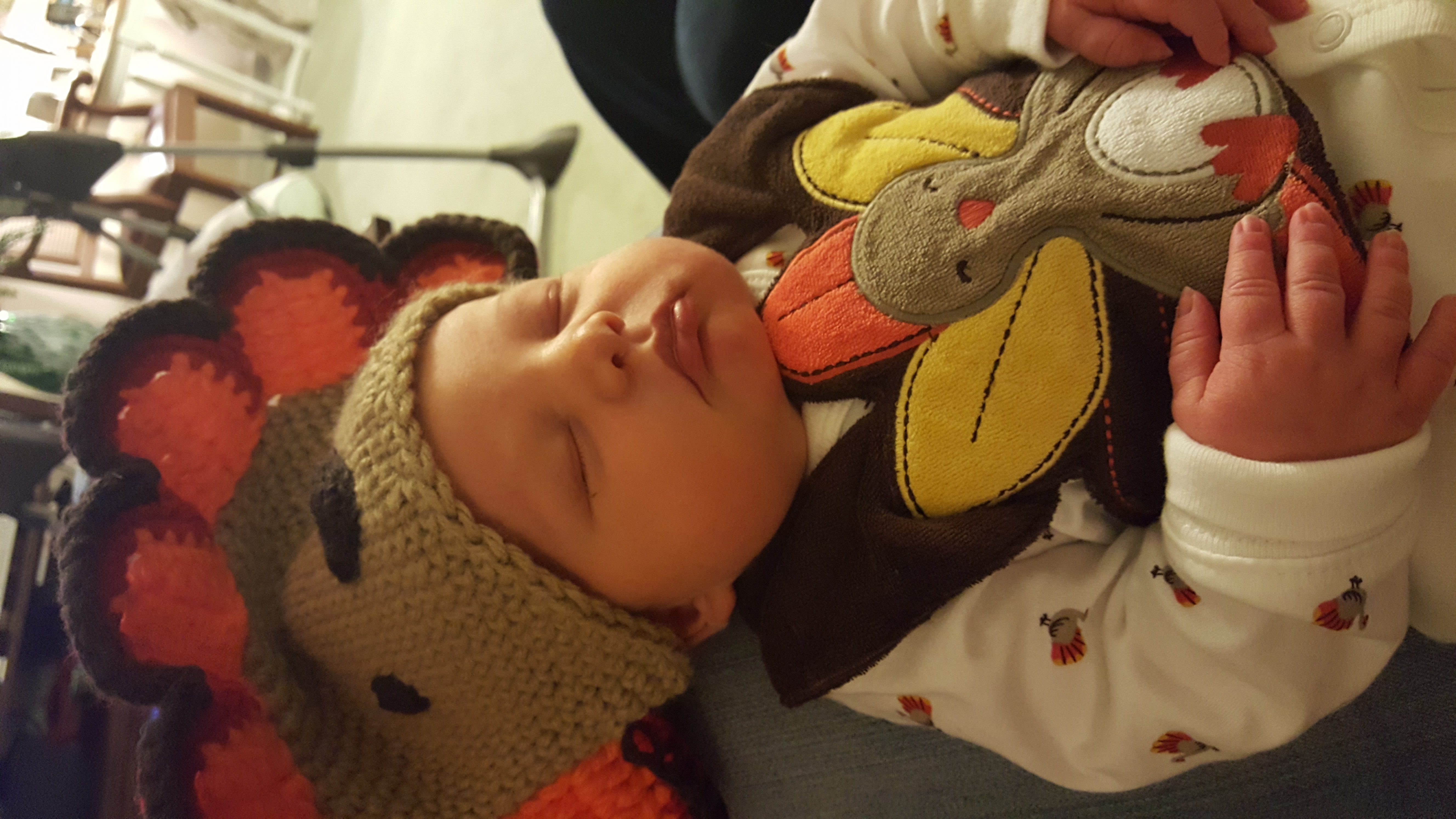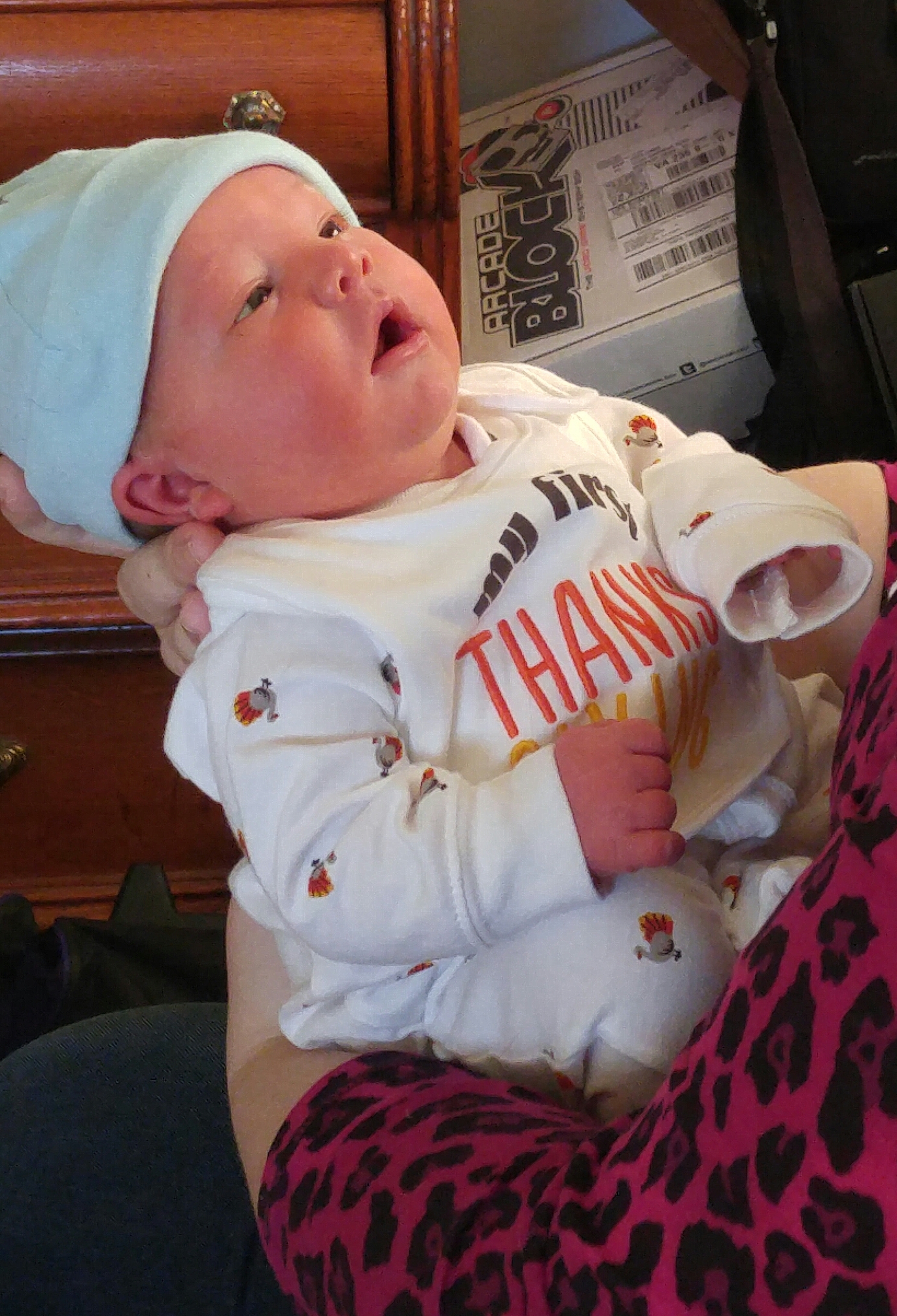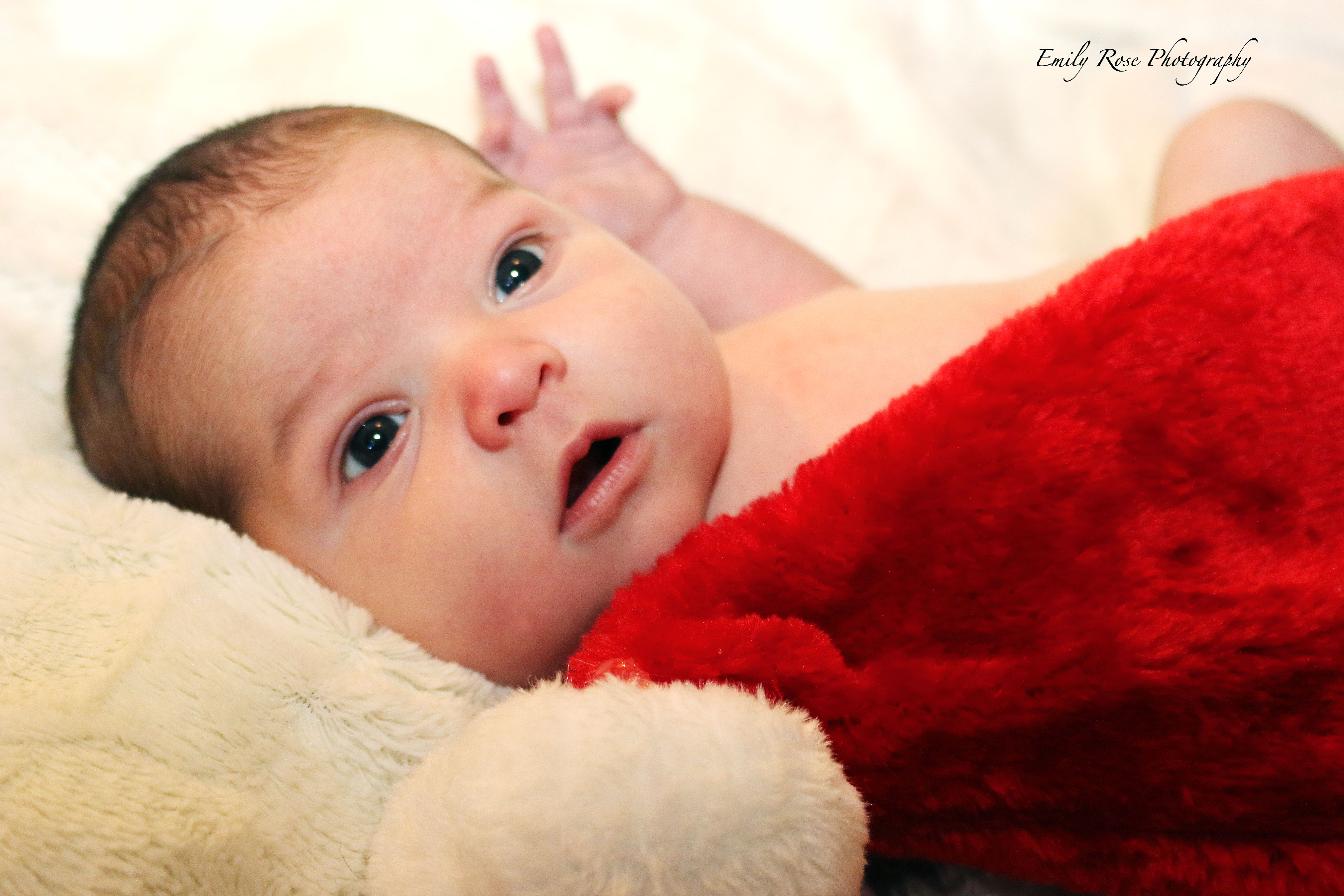 We are getting pictures of the kids done on the 5th so I don't have any professional ones yet, but here is one that I took of my little guy on Thanksgiving. I can't believe that he'll be a month old tomorrow, it went by so quick! He's starting to show more of his personality now and it's amazing.