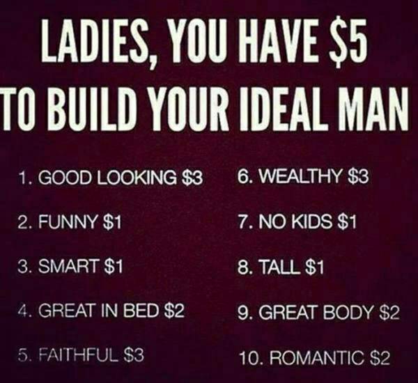 I would also say funny, smart, and faithful. Faithful is spendy at $3, but that's a nonnegotiable. I was eyeing the great body, but then I'd have to give up funny and I like to laugh too much. But really, if I had to build my ideal man, it'd be my husband