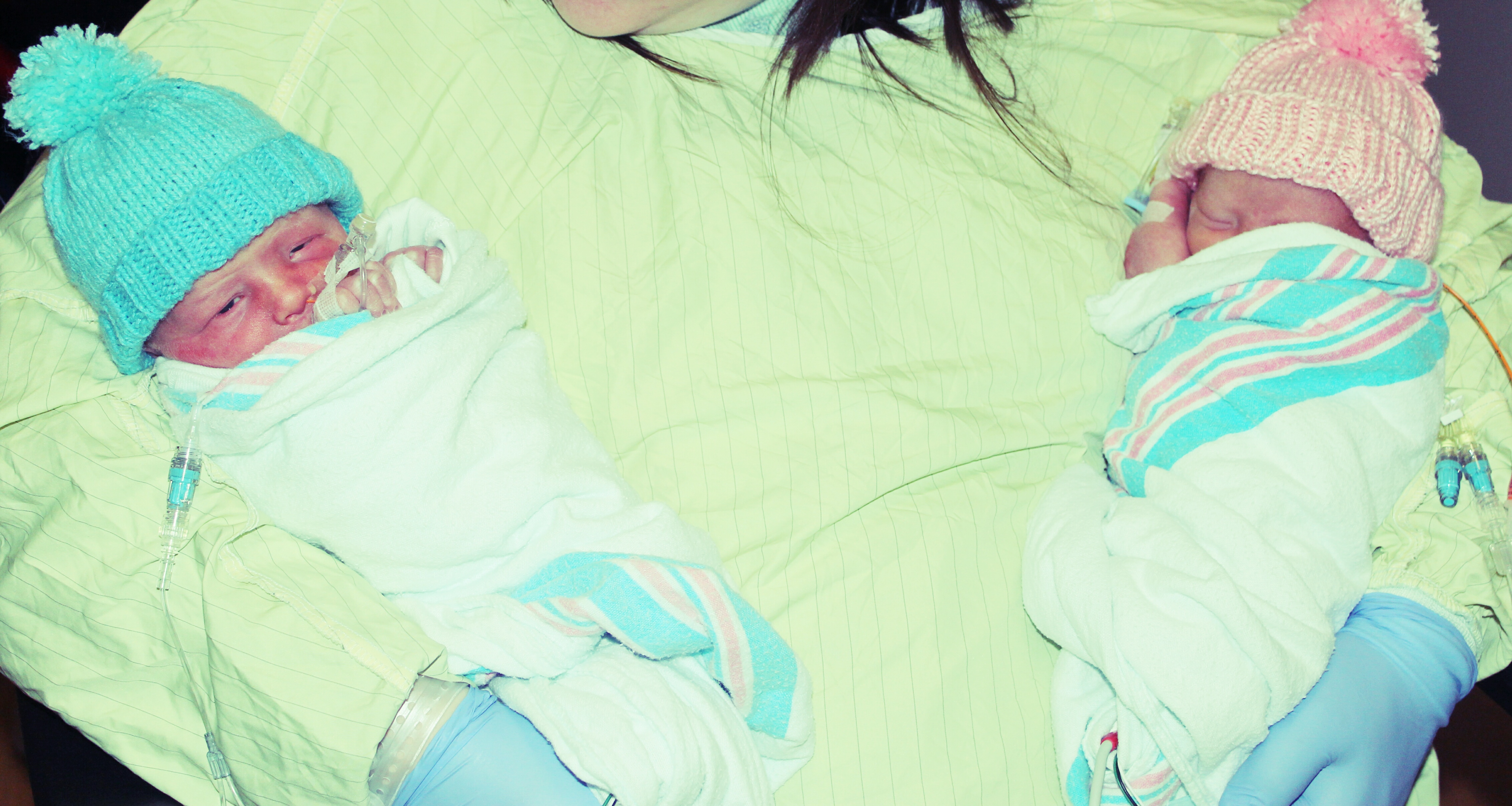 On Wednesday, 12/2 at 3:01 & 3:02 pm, our world became whole as they pulled out our little ones. She was 4 lb 5 oz, 17.25" & he was 5lb 05 oz, 18". She's been doing amazingly, even with being that small. He had breathing issues at the beginning and is now struggling with keeping a constant temp but they are doing amazing for being only 35w 4d in my belly. Hopefully only a week or so in the nicu before we bring them both home!