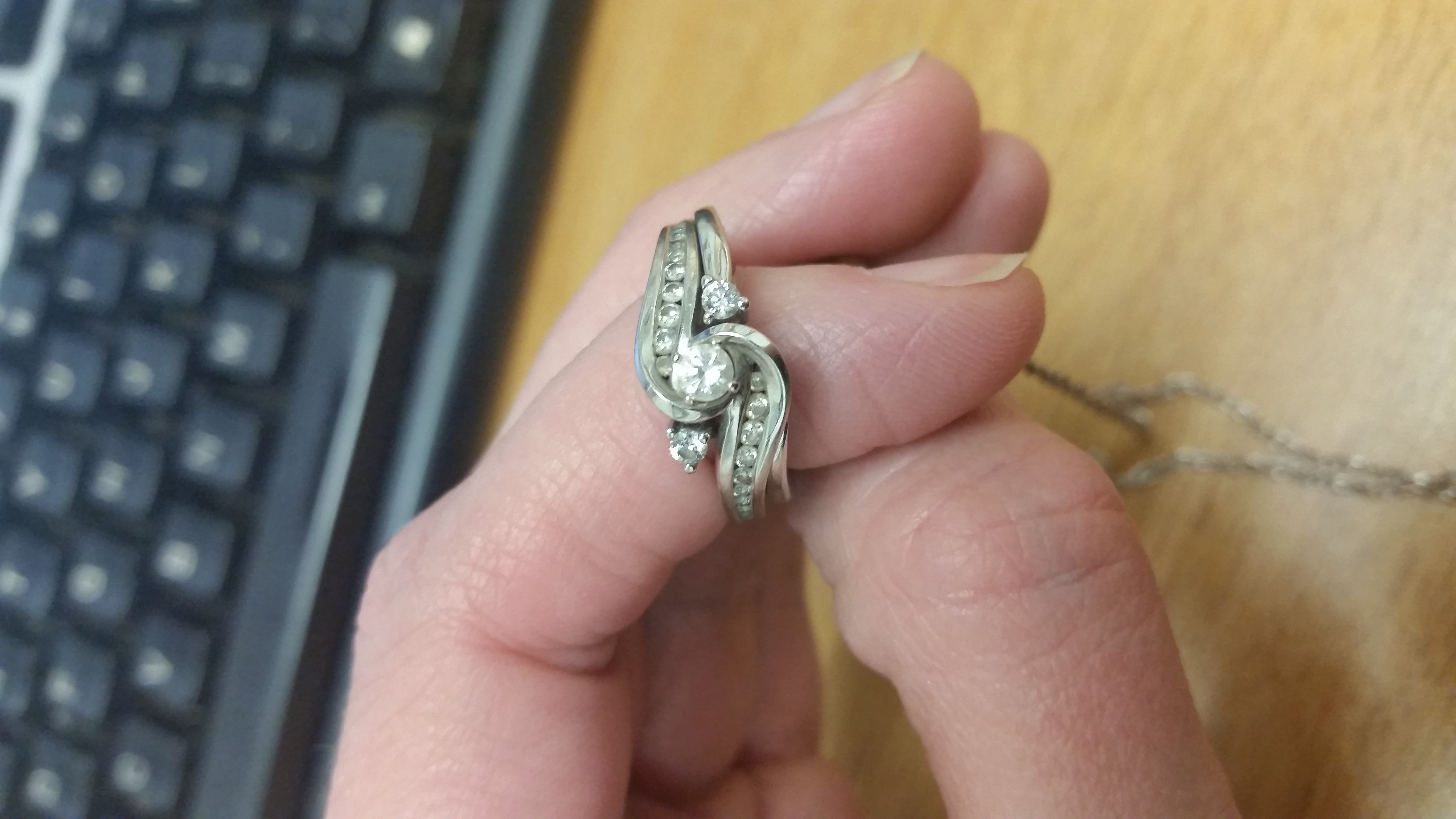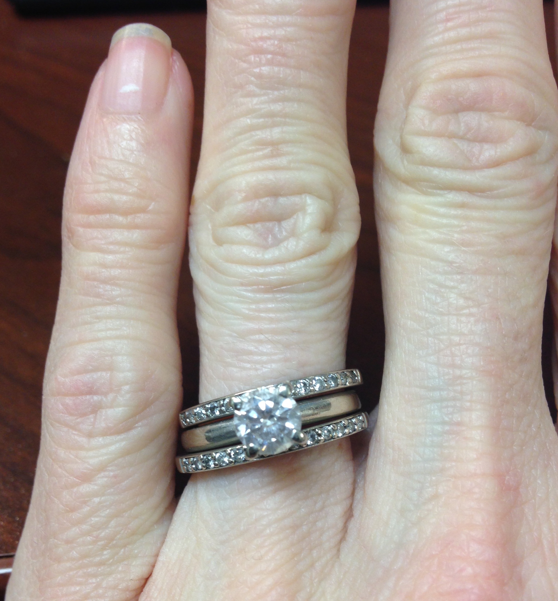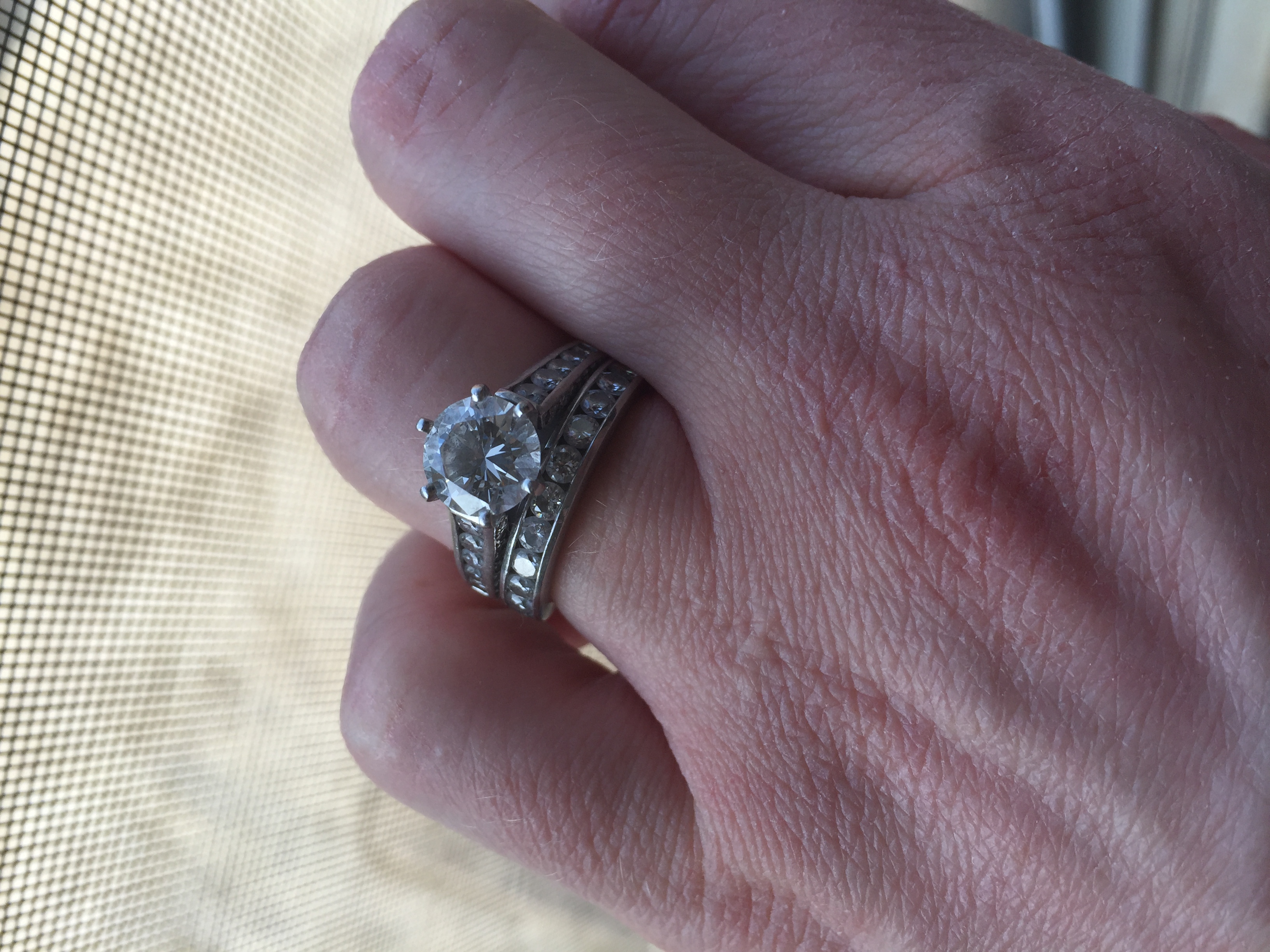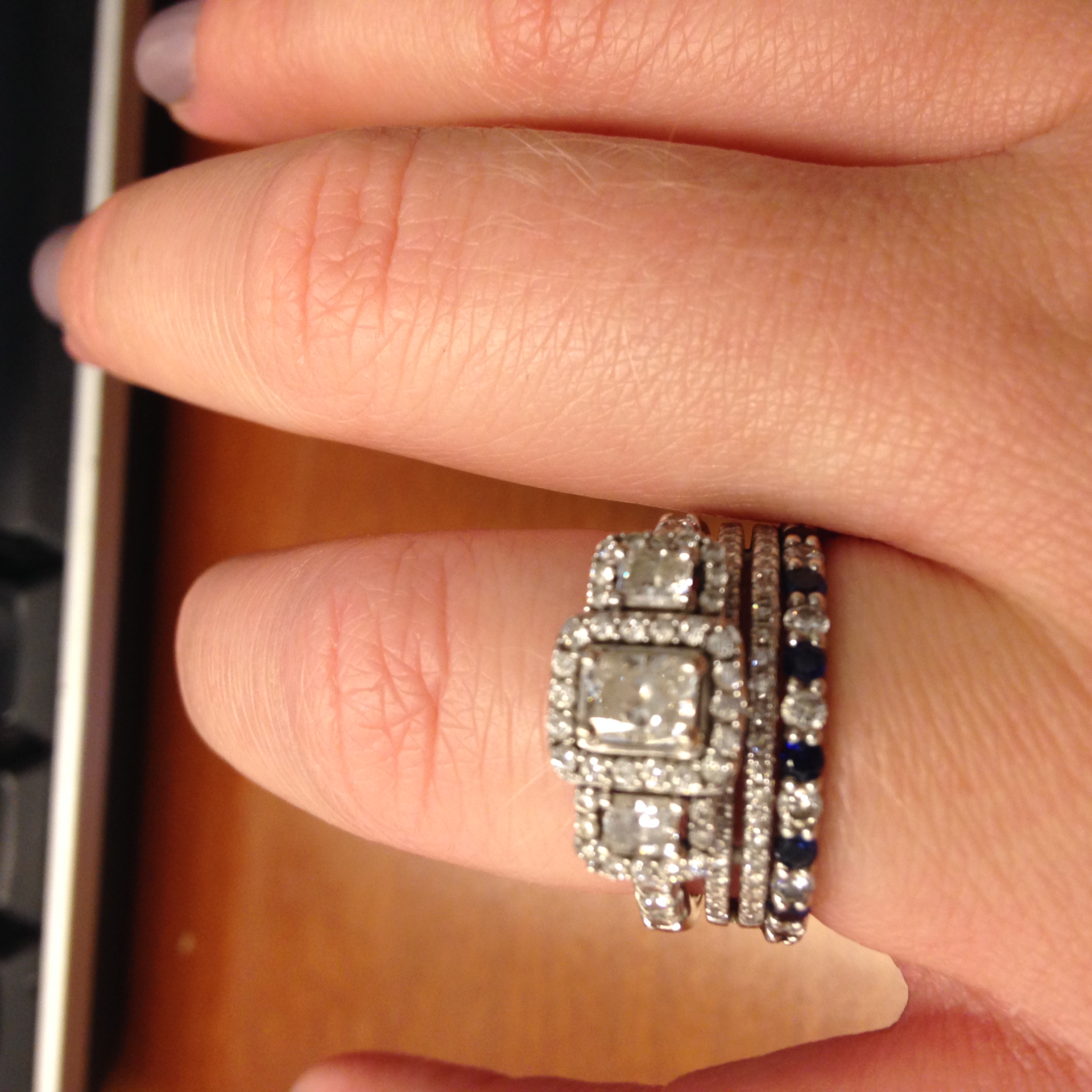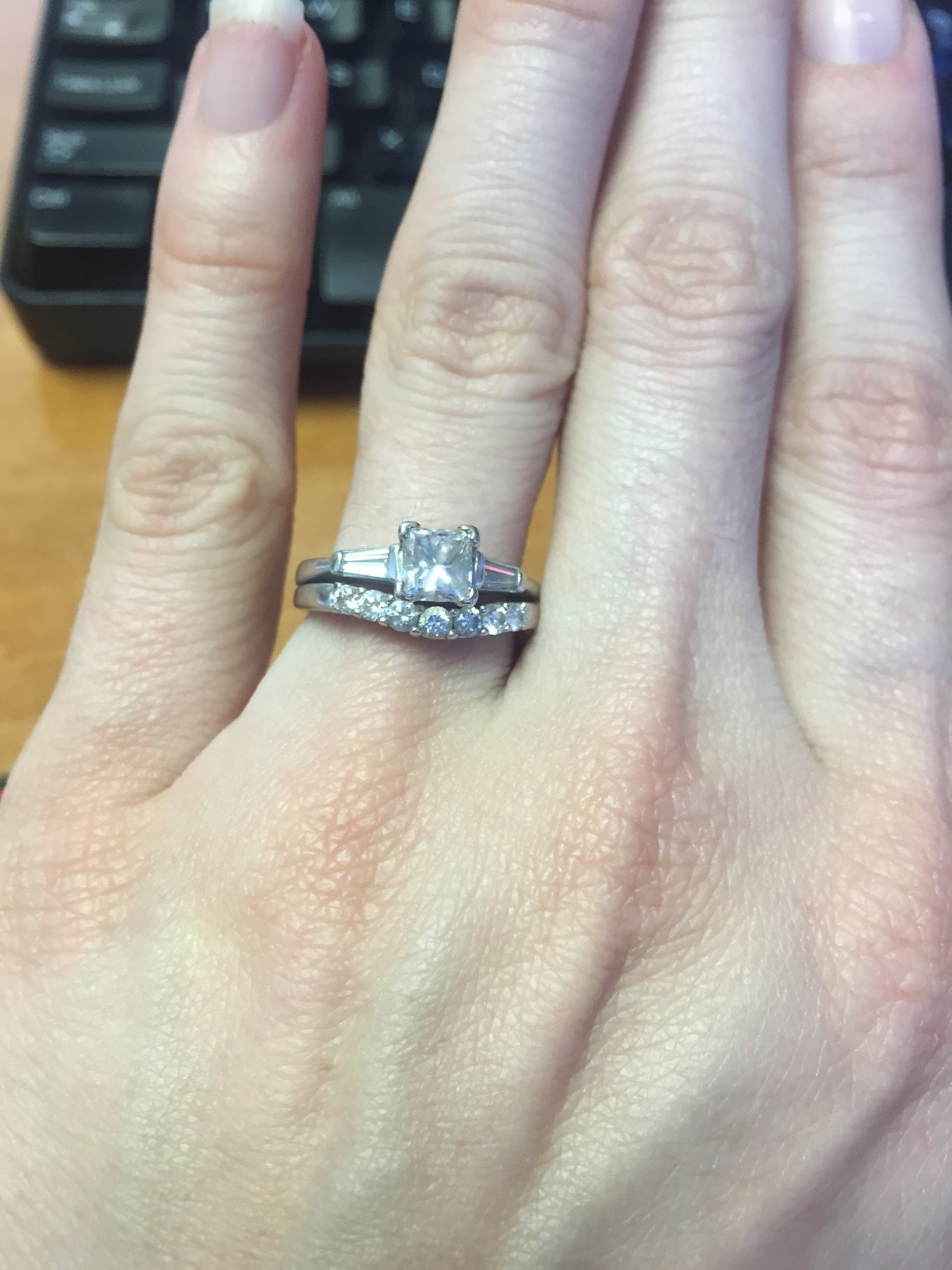 I forgot my rings today. The center diamond came from a necklace that was given to MIL by her MIL when MIL and FIL got married. It's not what I would have picked for myself but I absolutely love it. My band is a diamond eternity band that matches the engagment band.