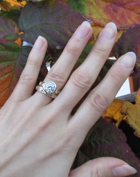 This is my wedding band and engagement ring. We were engaged in Salzburg, Austria and it was magical! We took the Sound of Music tour and my (then) fiancée got down on one knee and proposed in front of the church that Maria got married. When the tour was over we went back to the center of town and celebrated with lots of Stiegl beers