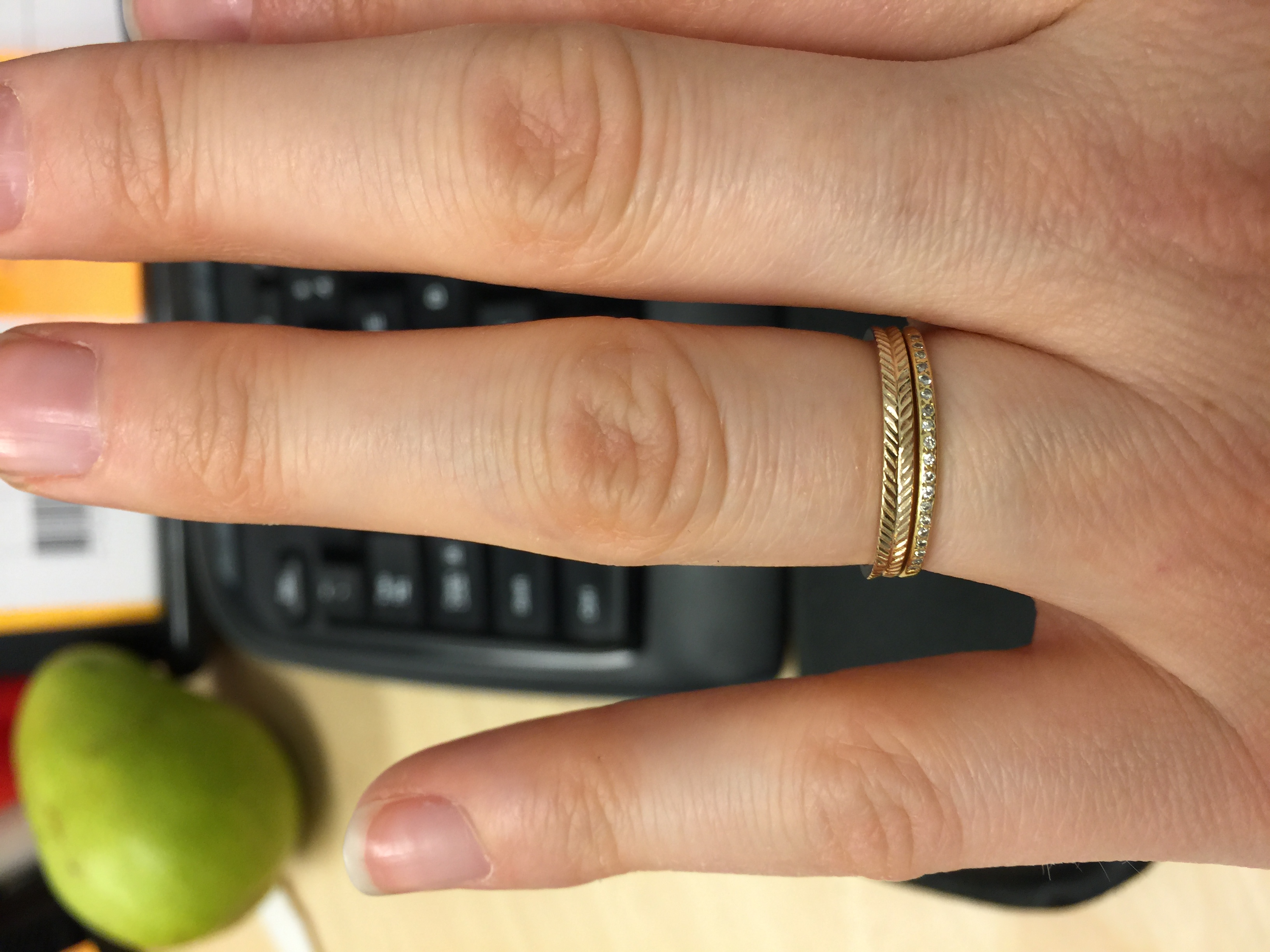 I wear my wedding band, the thin one with diamonds and another band stacked together every day. The second band was my birthday gift from my H last year and I asked for it specifically to go with my wedding band. All three look great together too, but I hardly ever wear my engagement ring. I love all my rings!