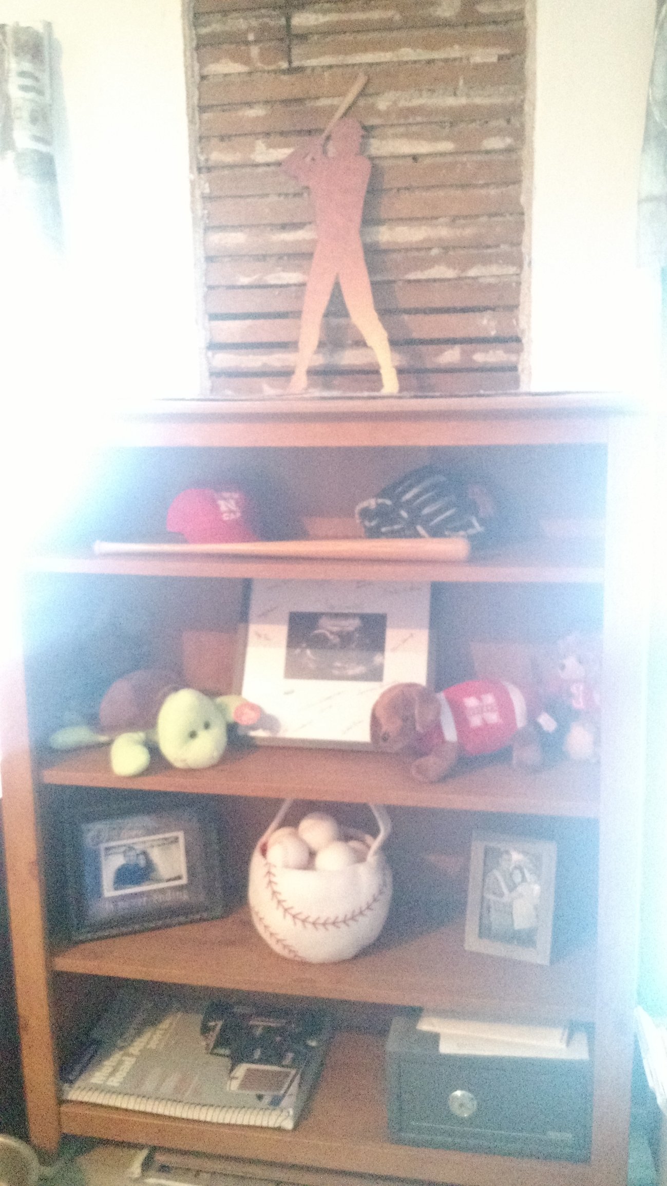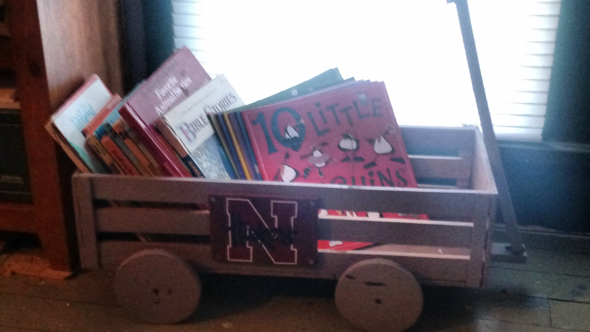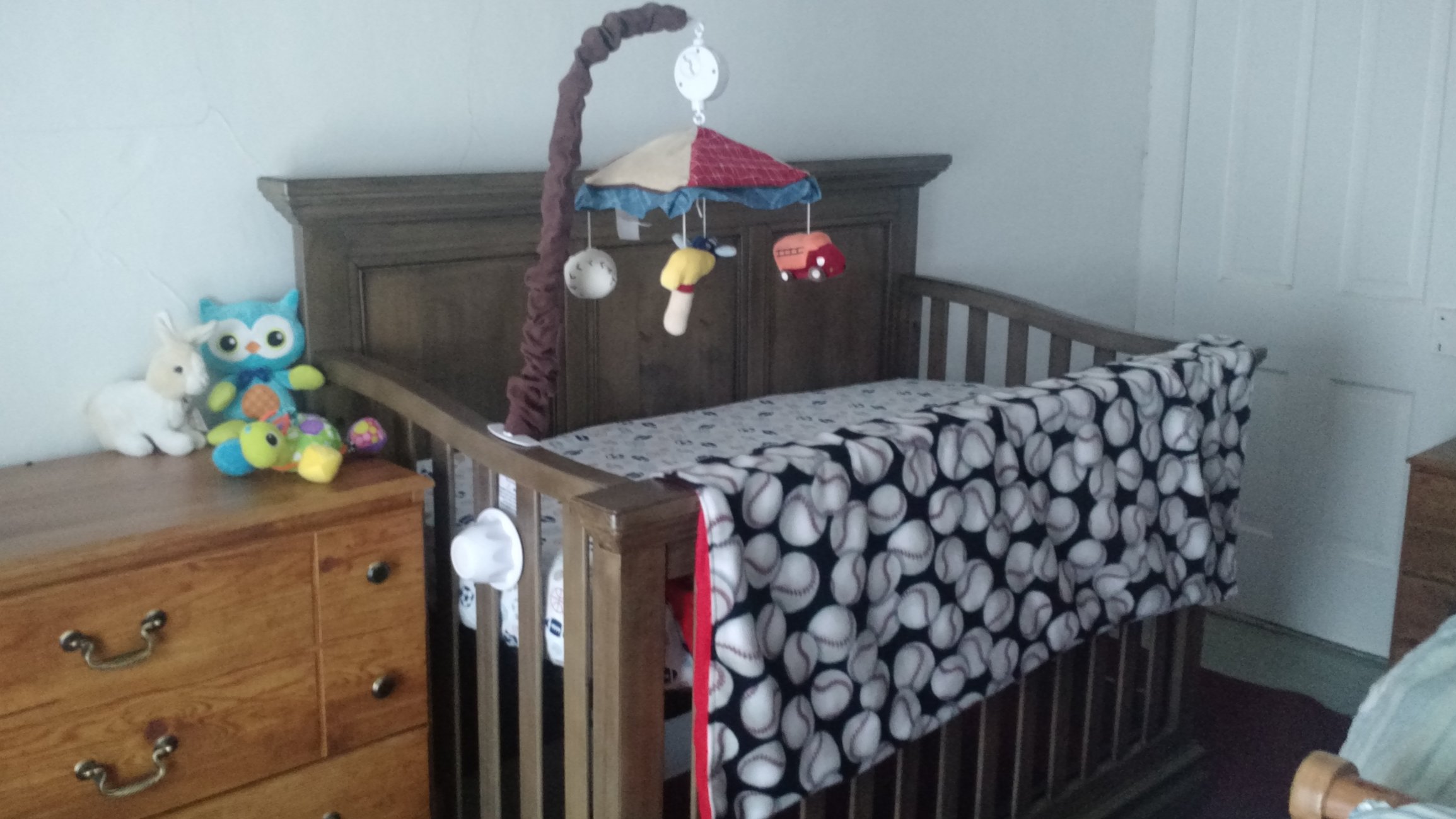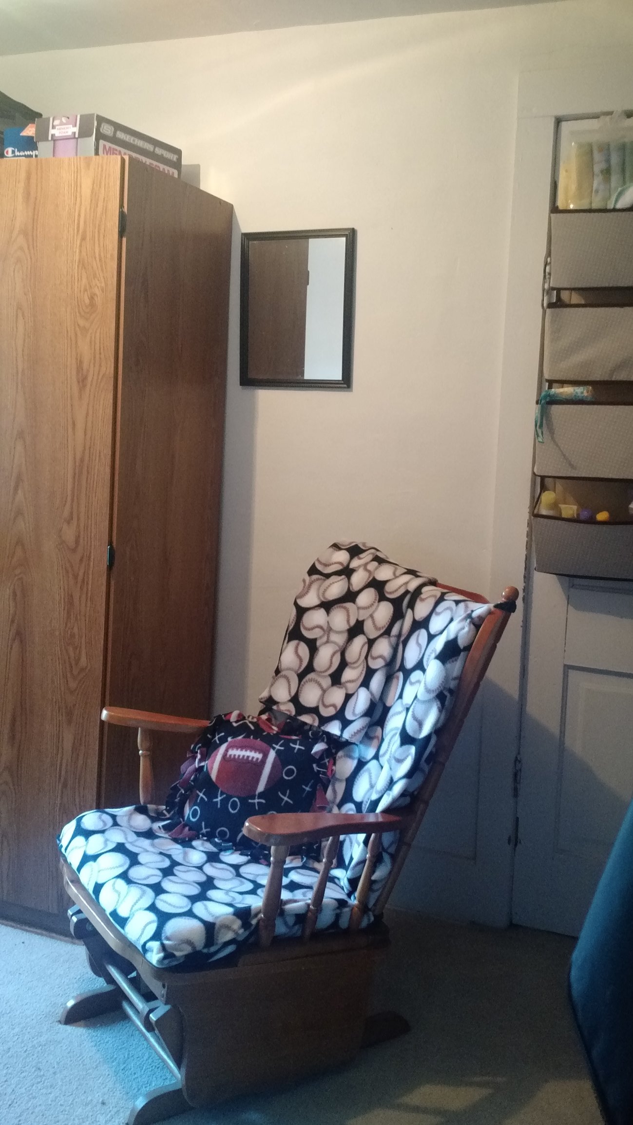 We don't have a nursery to decorate right now so we mixed everything within our room and closet room for now. Hopefully by the end of summer we will have our home renovations done so we can move him into his own room. My Mother--in-law custom made the baseball blanket, changing pad cover, glider cushion covers along with many other blankets, sheets and pad covers. The little wagon with books was custom made out of old barn wood, I thought it turned out great.