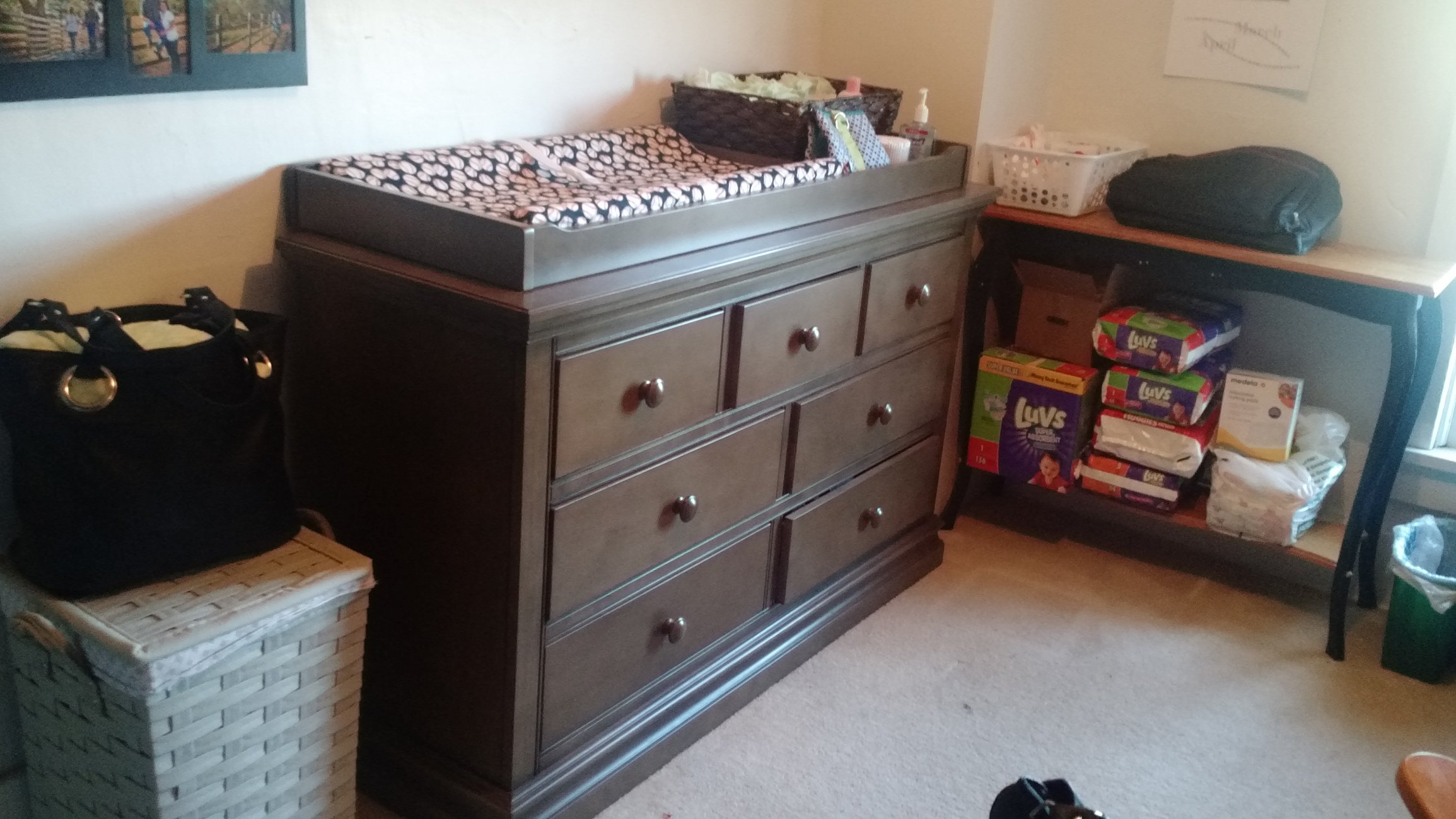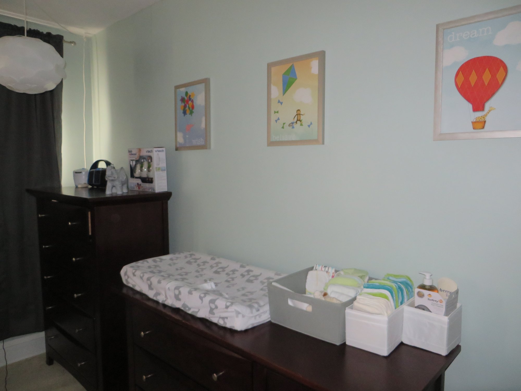 Here's half of our nursery. I'm going to end up adding to it over time. The other side has a futon and bookshelf and a wall waiting for artwork. My rocker-recliner is still downstairs too. Clearly I'm a third time mom- nothing is done!