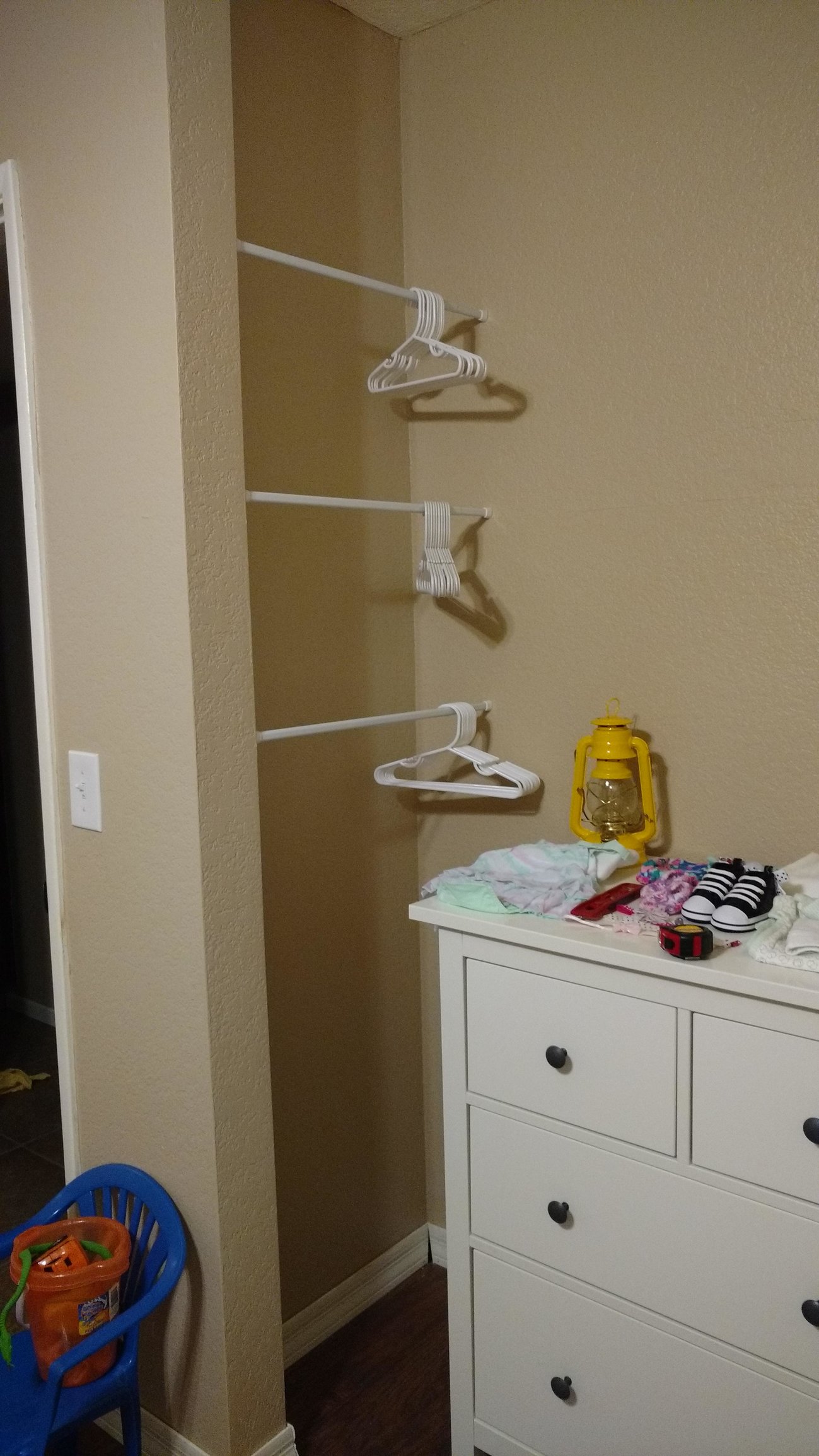 I put up some of the wall art, we got a crib mattress and I put up some tension rods for a "closet" since the room doesn't have one.