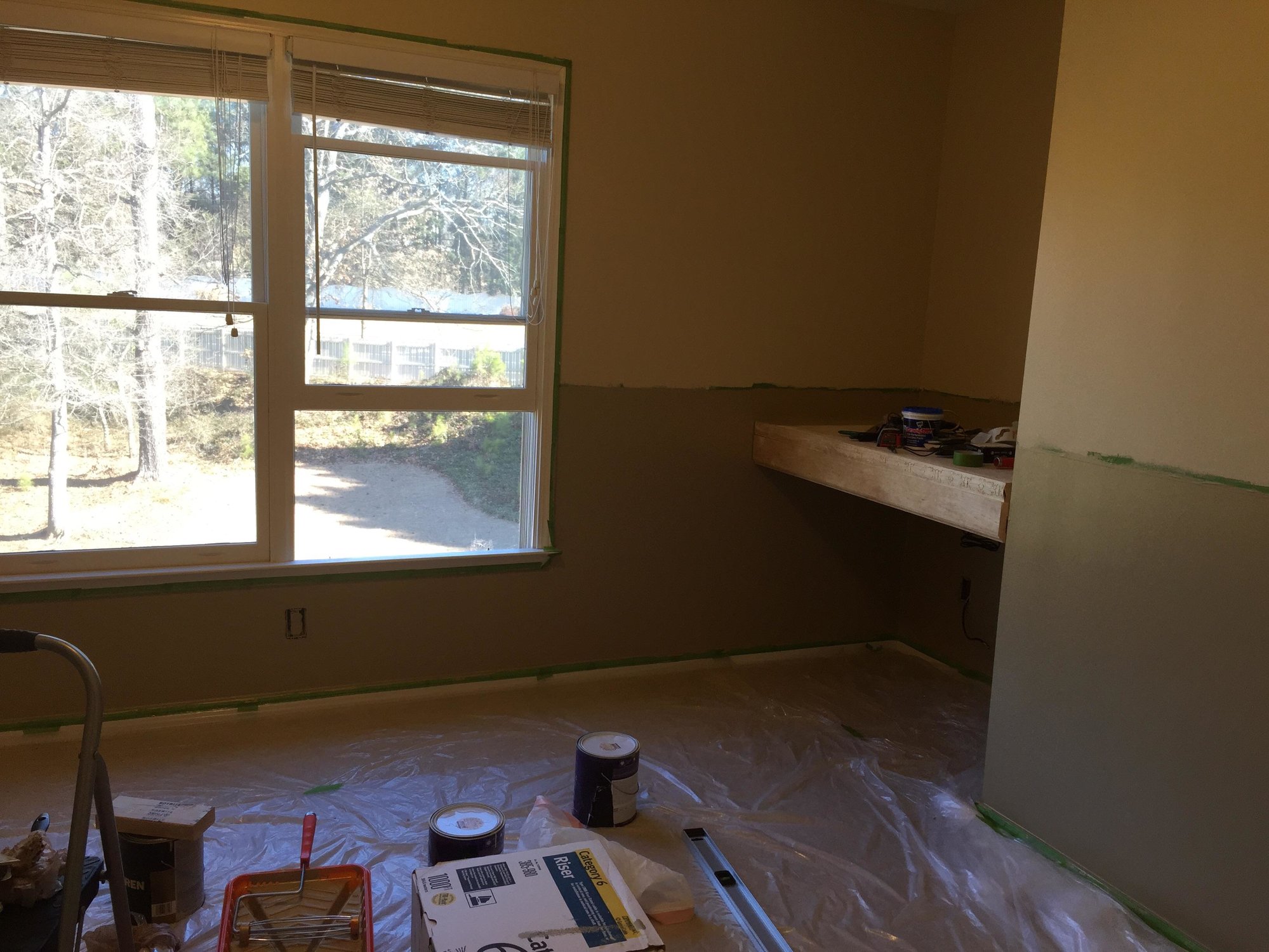 Slow progress. The room is painted! The bottom is this cool metallic paint that we did a faux hammered finish on. I'm debating going back and doing one more coat with just the sponge roller for a tad more dimension, but I love that it's really subtle and not oh my god sponge painting. DH built the desk/dresser top in the nook with a huge drawer. The dresser fits perfectly underneath. Hopefully this week I'll get that and the dresser pained peach. The plan is next weekend DH is going to paint and install the chair rail and then we can finally put the crib together