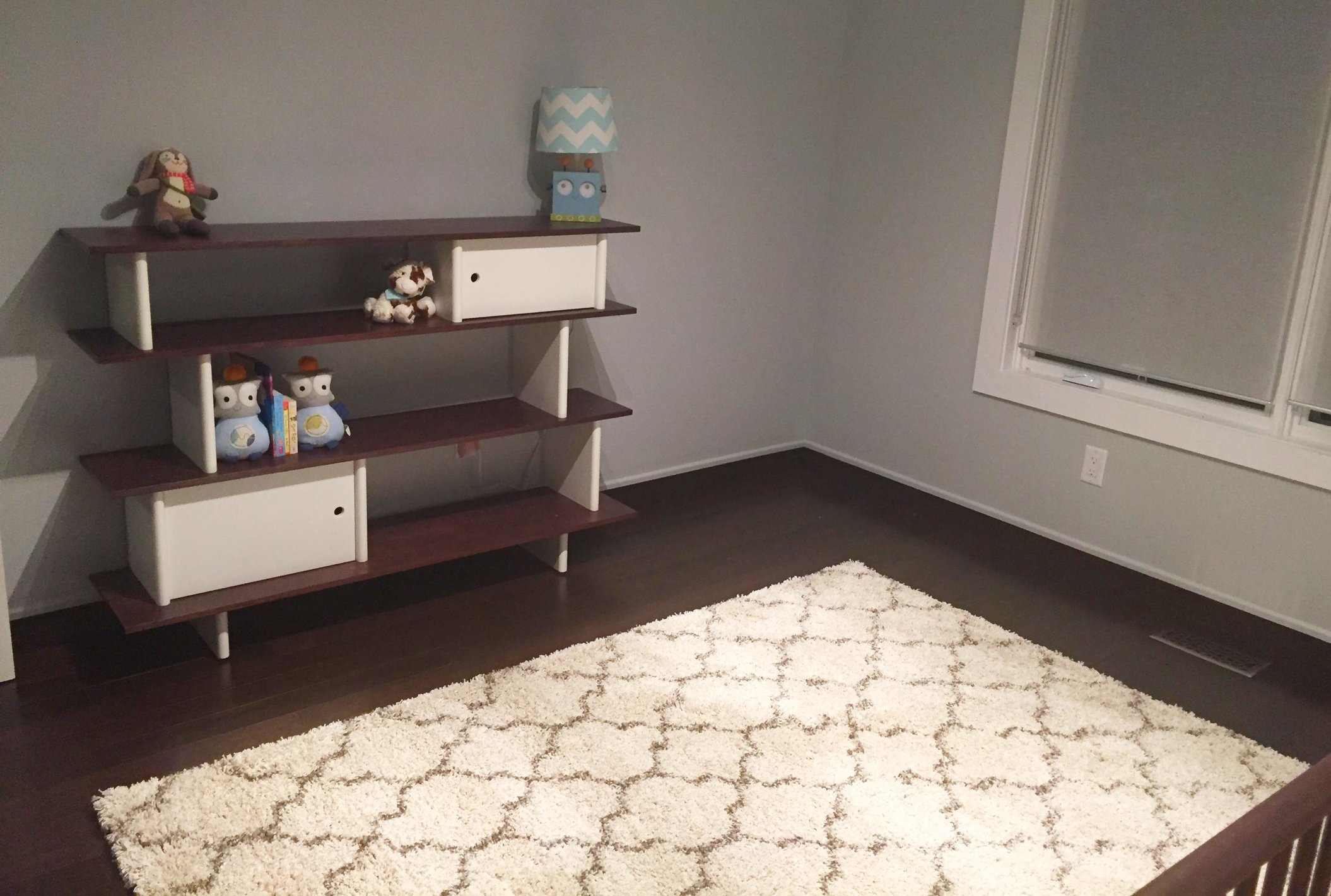 Still need to hang the curtains (turquoise blue), and waiting for stuff we ordered such as the glider chair (dark gray, will go between the mini library and the window, the orange pillow that is inside the crib will be on the chair), mattress, white star decals for the accent wall, and decorative stuff I ordered on Etsy.