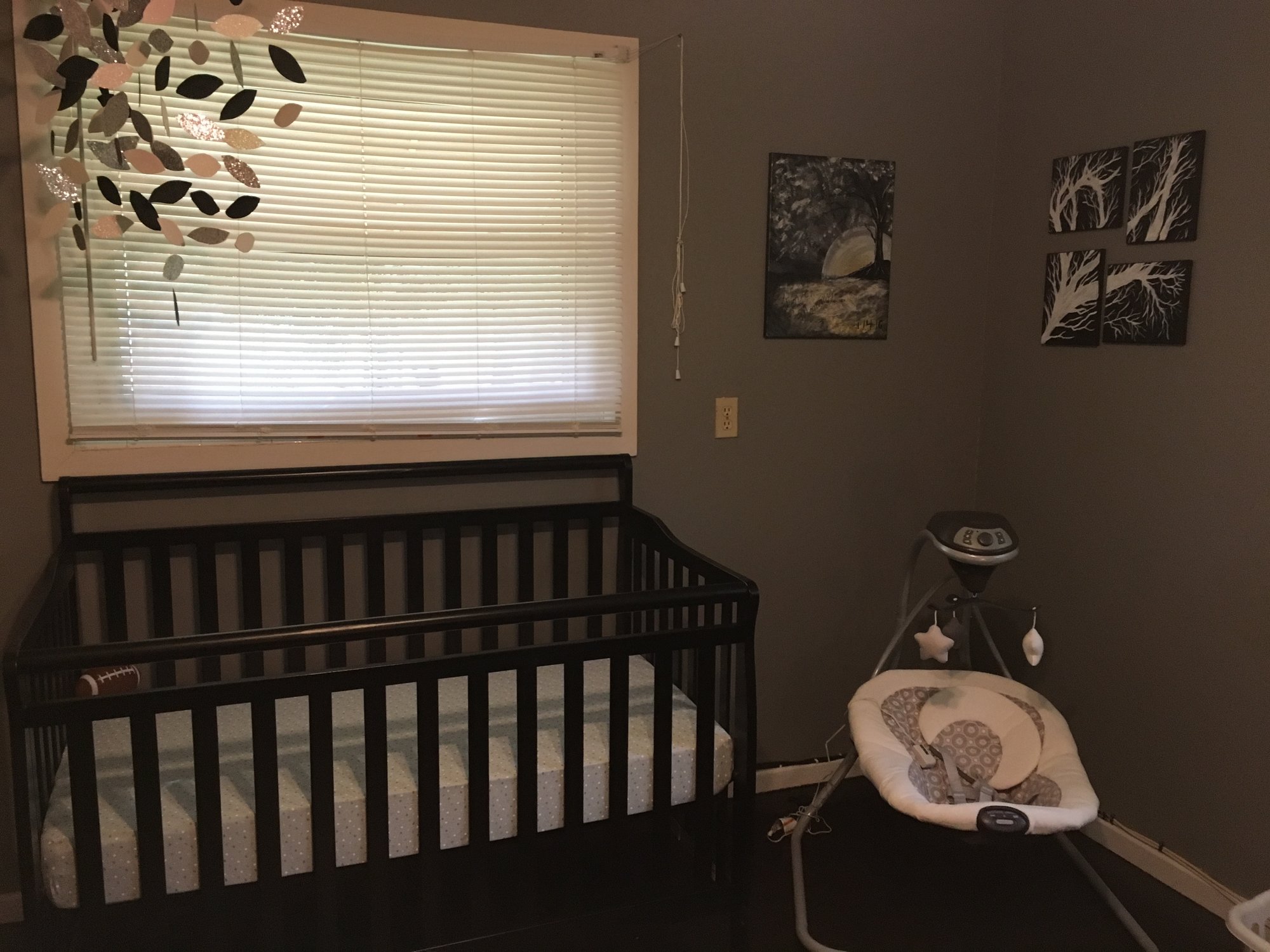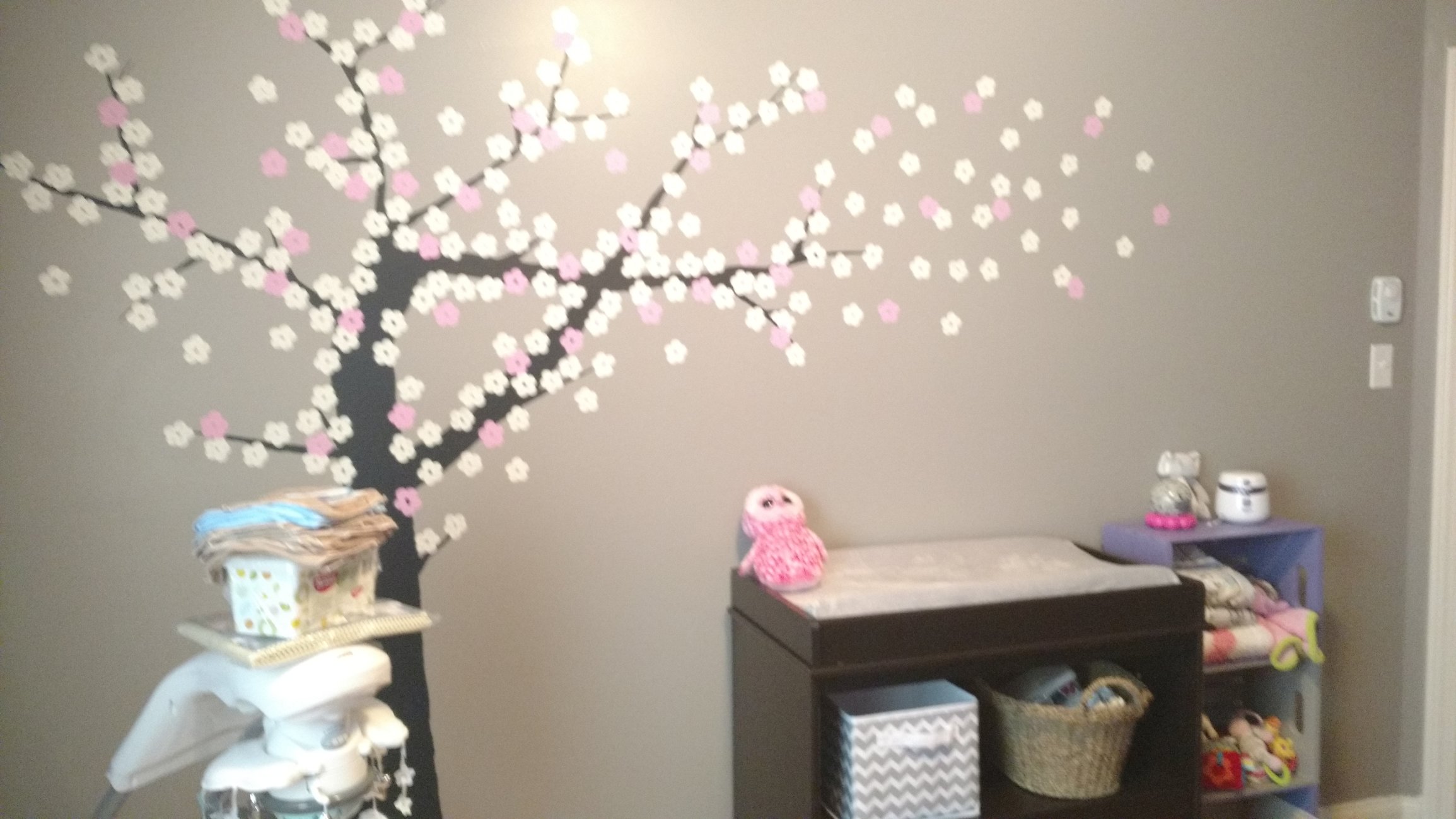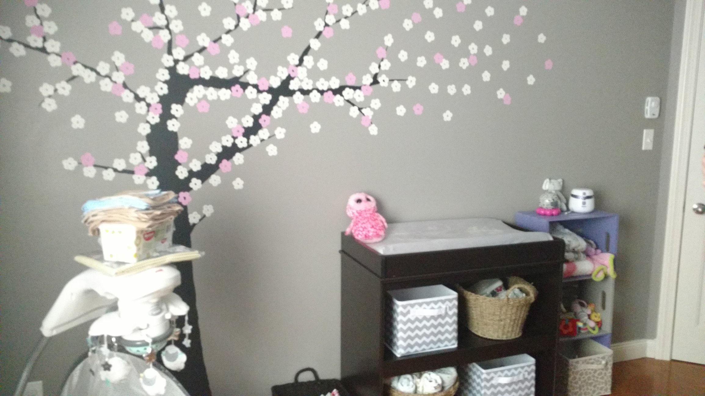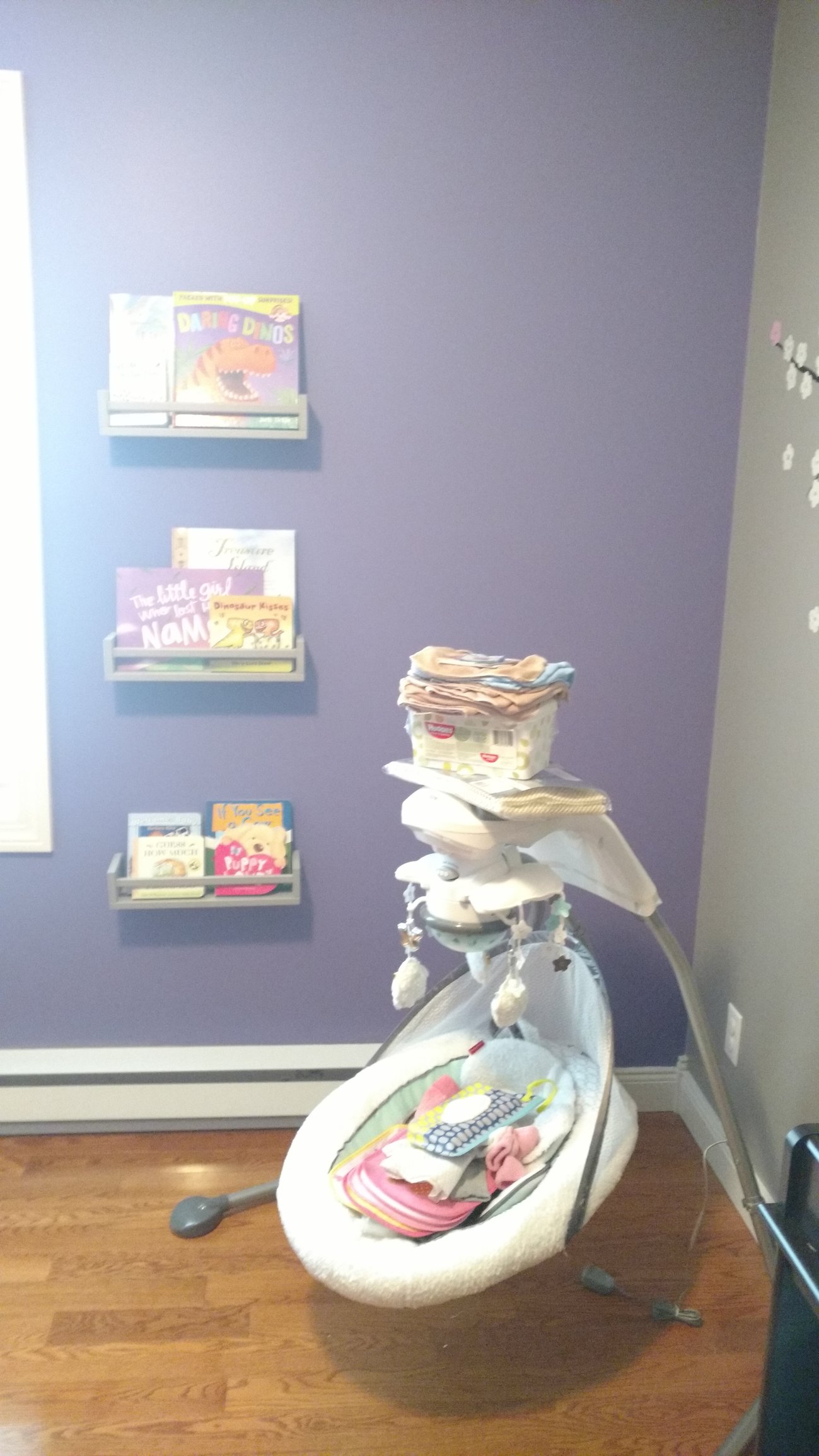 This is our progress so far...grey and purple walls with A painted cherry blossom tree behind the diaper changing table...the swing is going downstairs to make room for a rocker in that corner and we have some finishing touches left to do with a few other things as well