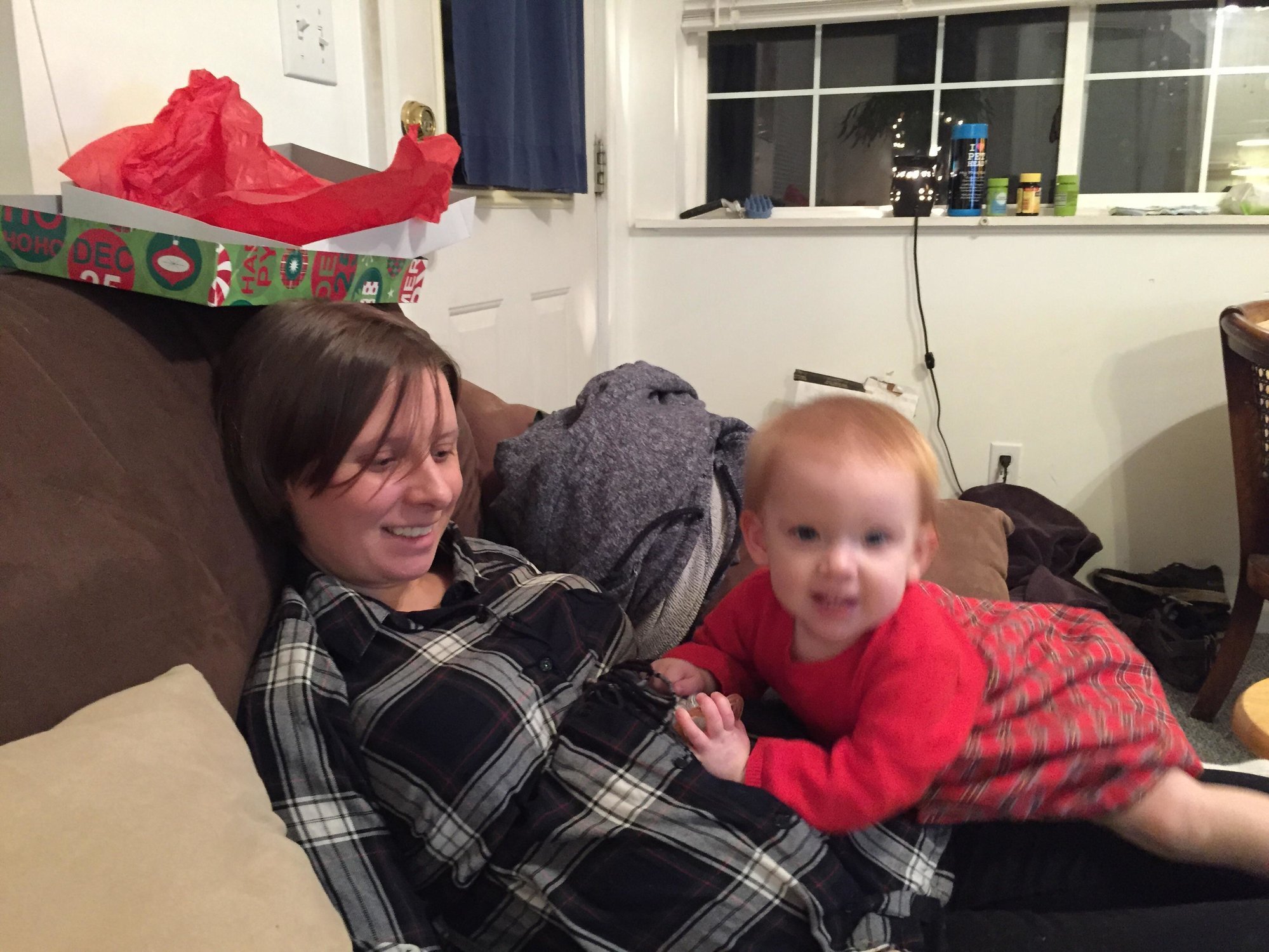 Late to the party, but this is the best I got Christmas Day. DD2 was kicking where DD1 has her hands. It was cute watching her try to wrap her head around what was going on. Also bonus adorable toddler because I'm an AW
