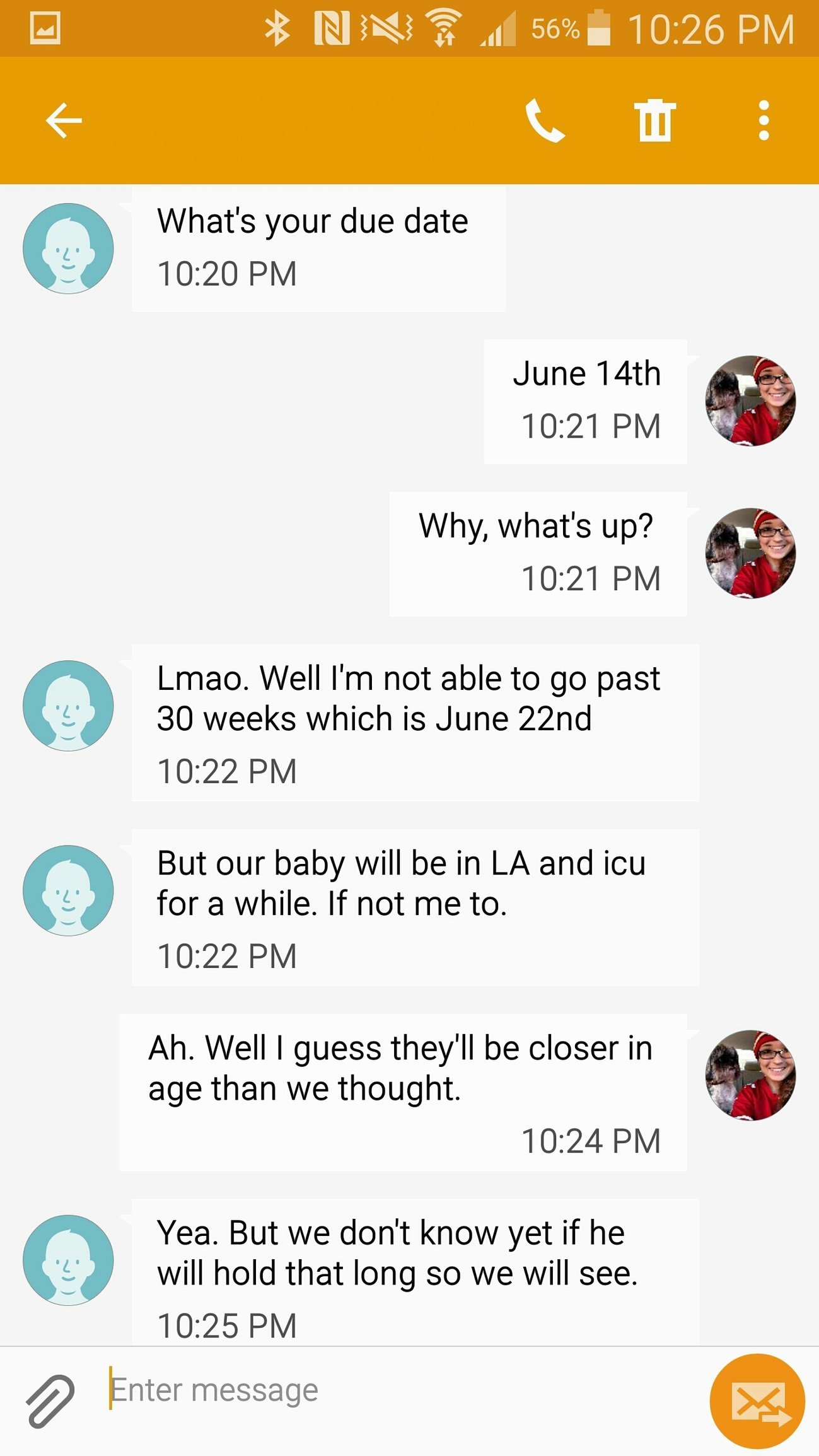 Texts from crazy... Looks like she's now all of a sudden anticipating a June baby. I don't really think a baby born at 30 weeks is something to "lmao" about but I also didn't realize this pregnancy was going to be a competition. *eye roll*