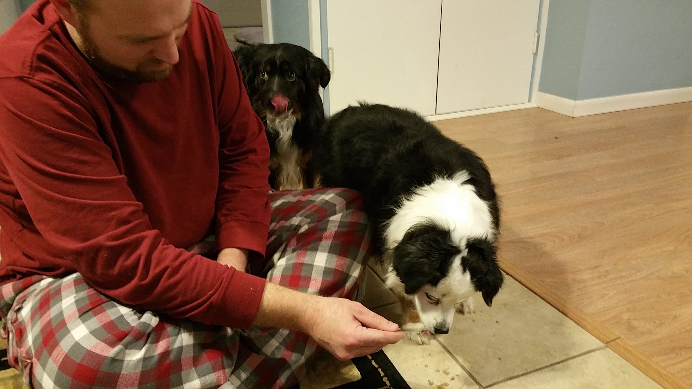 Because of him I'm pretty partial to black dogs. I like their fur is gorgeous. These are our two current dogs. One was refusing new food so she is being spoon fed by my husband. The one in the back is MORE than happy to help out if her sister didn't like the food.