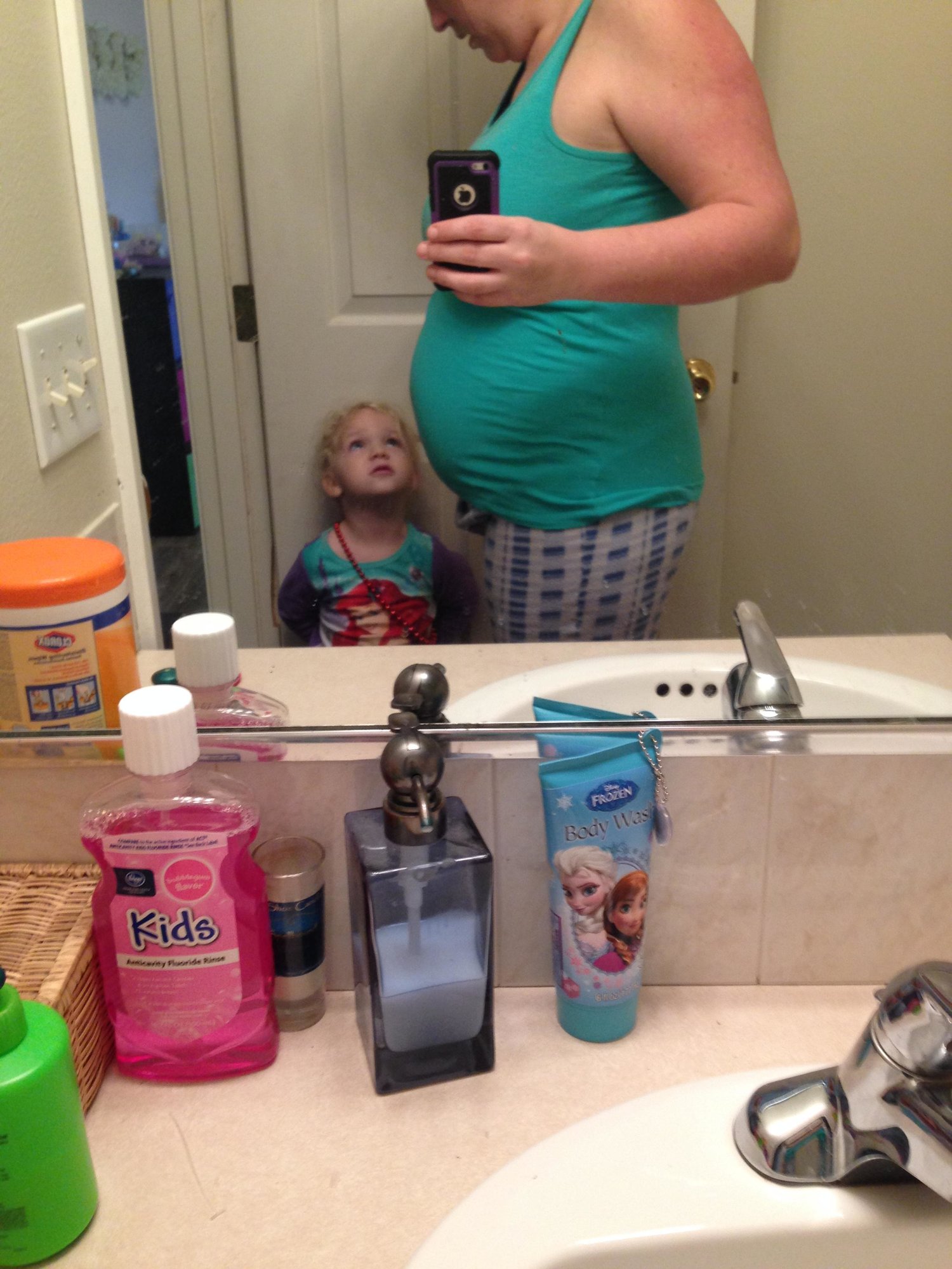 Definitely feeling like the bump is getting higher now. Took this last night at 15w1d. Daisy making her usual appearance obviously very interested in what momma is doing!
