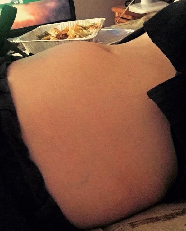 Sorry it shows my skin, but I thought it was funny. Here's my baby bump today (17w3d), still in my scrubs from work, with today's guilty pleasure of Nachos in the background