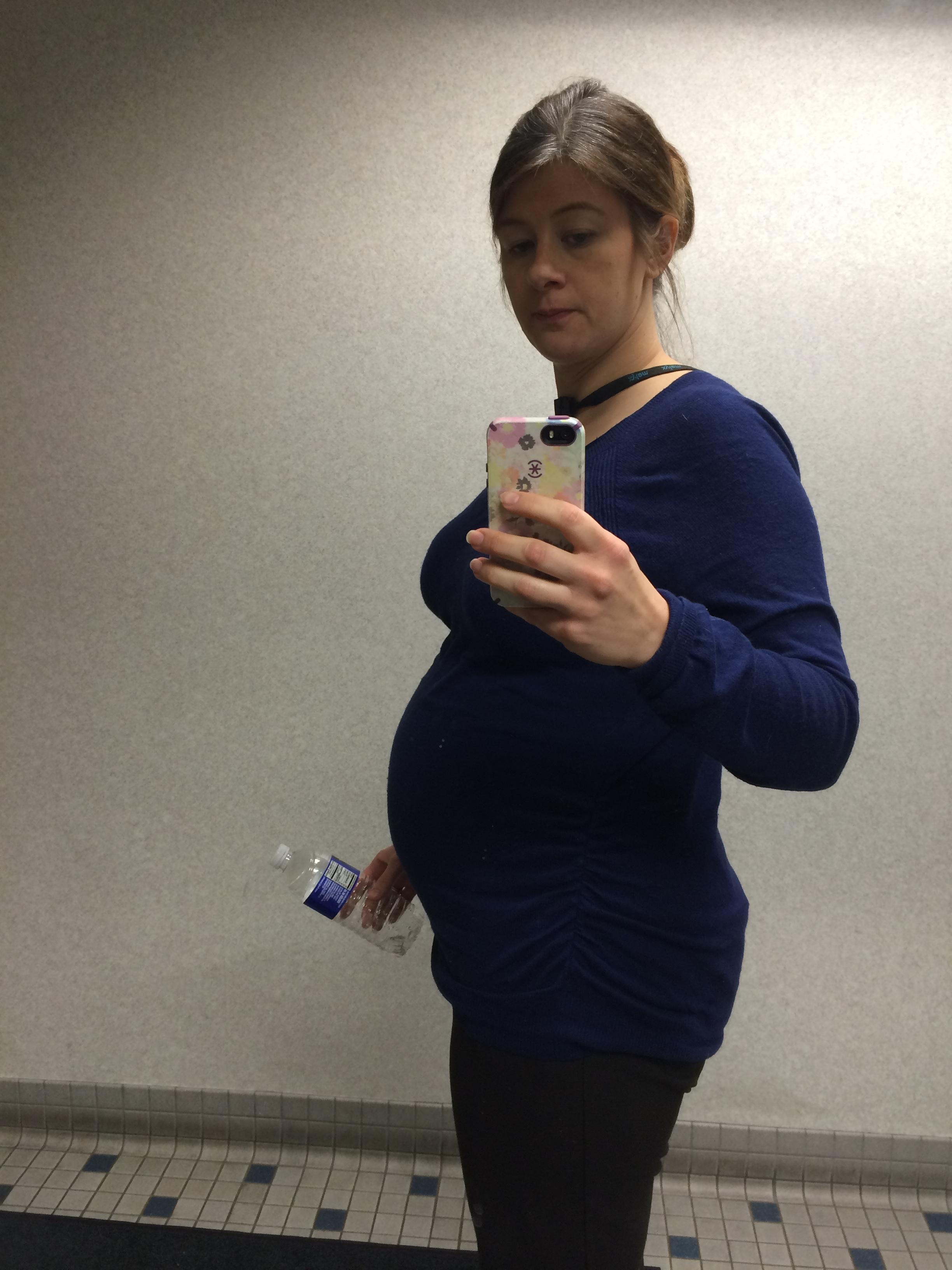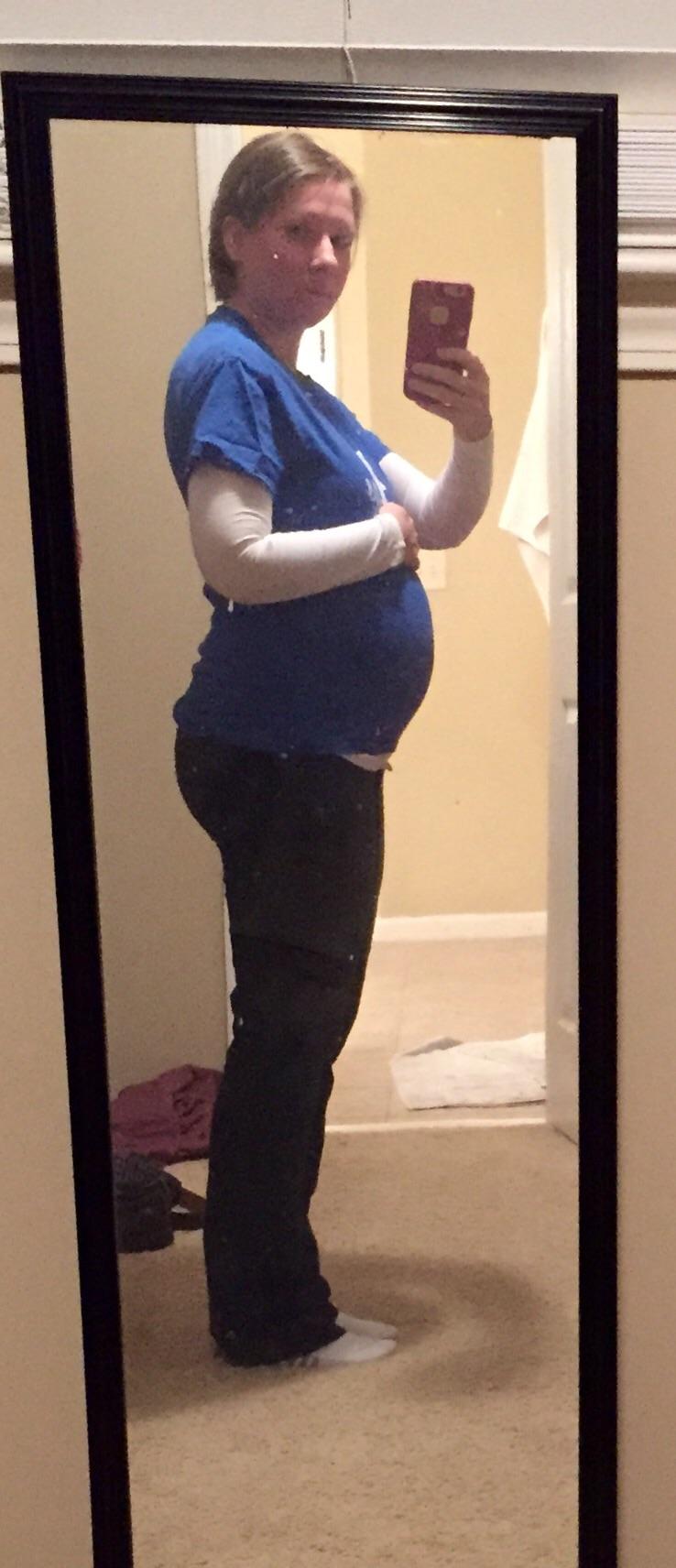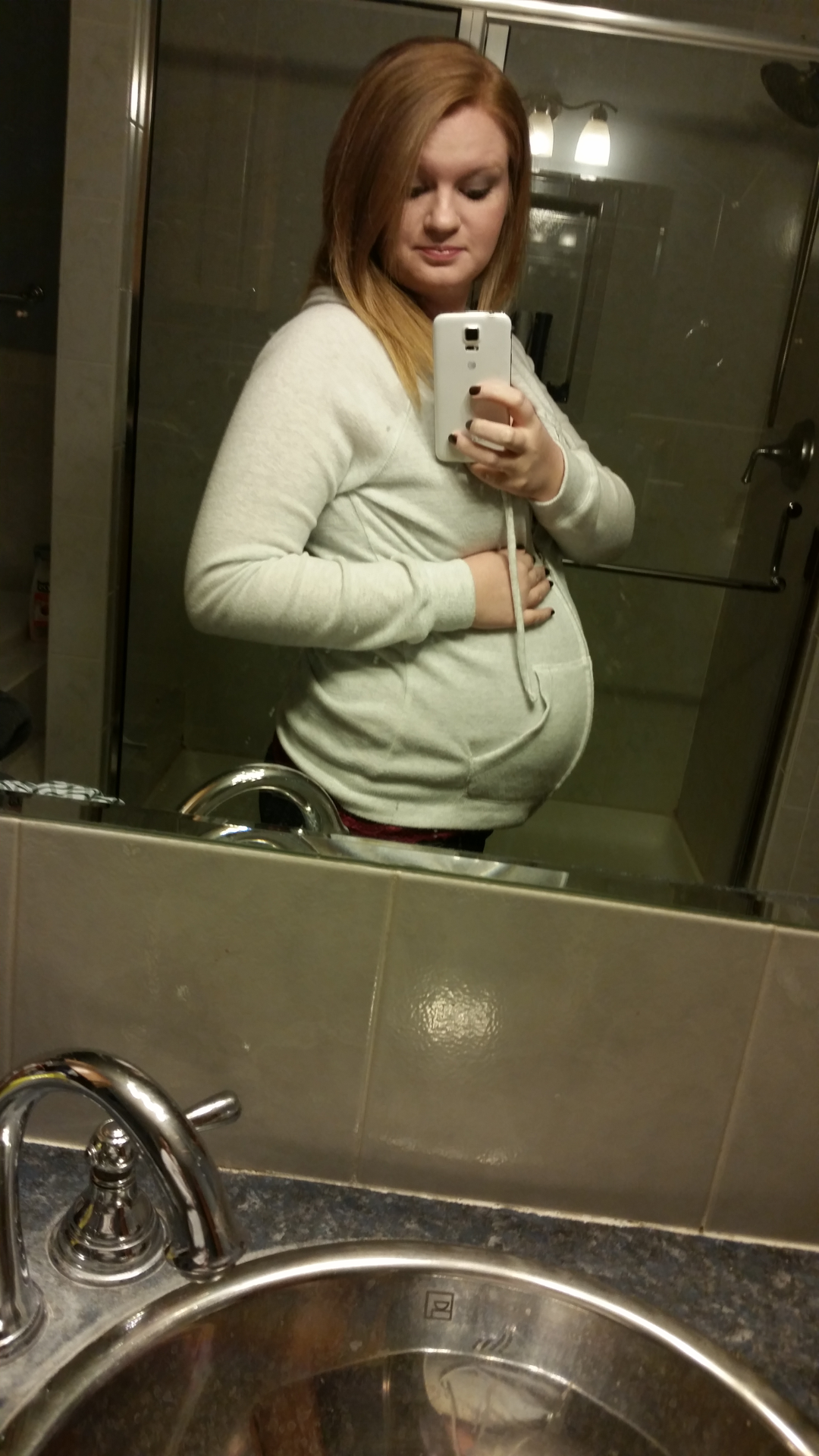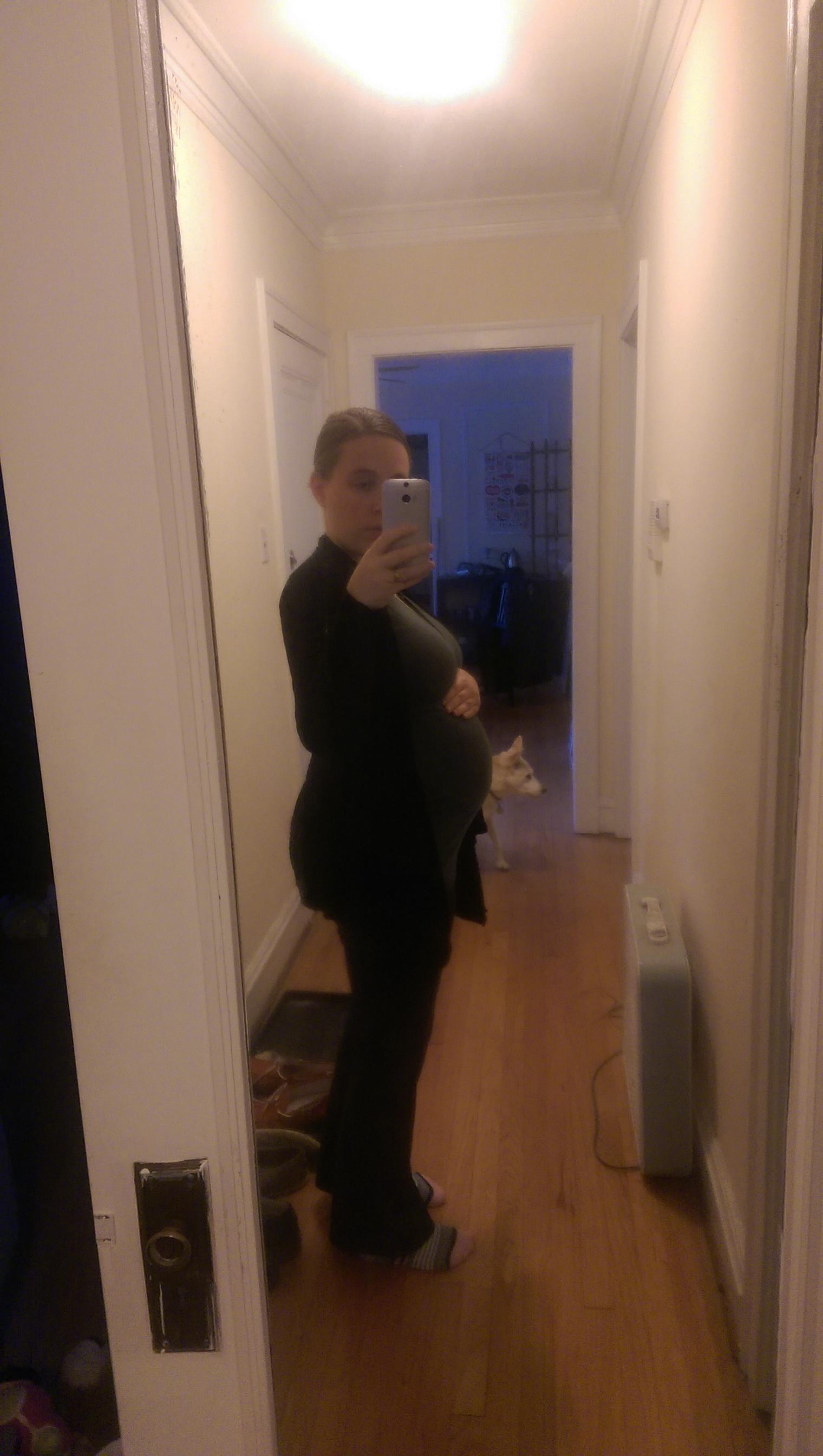 24 weeks + some days. My little friend in the background is not so patiently waiting for me to get a coat out of this closet and take her out. Dogs don't understand hump day bump day.
