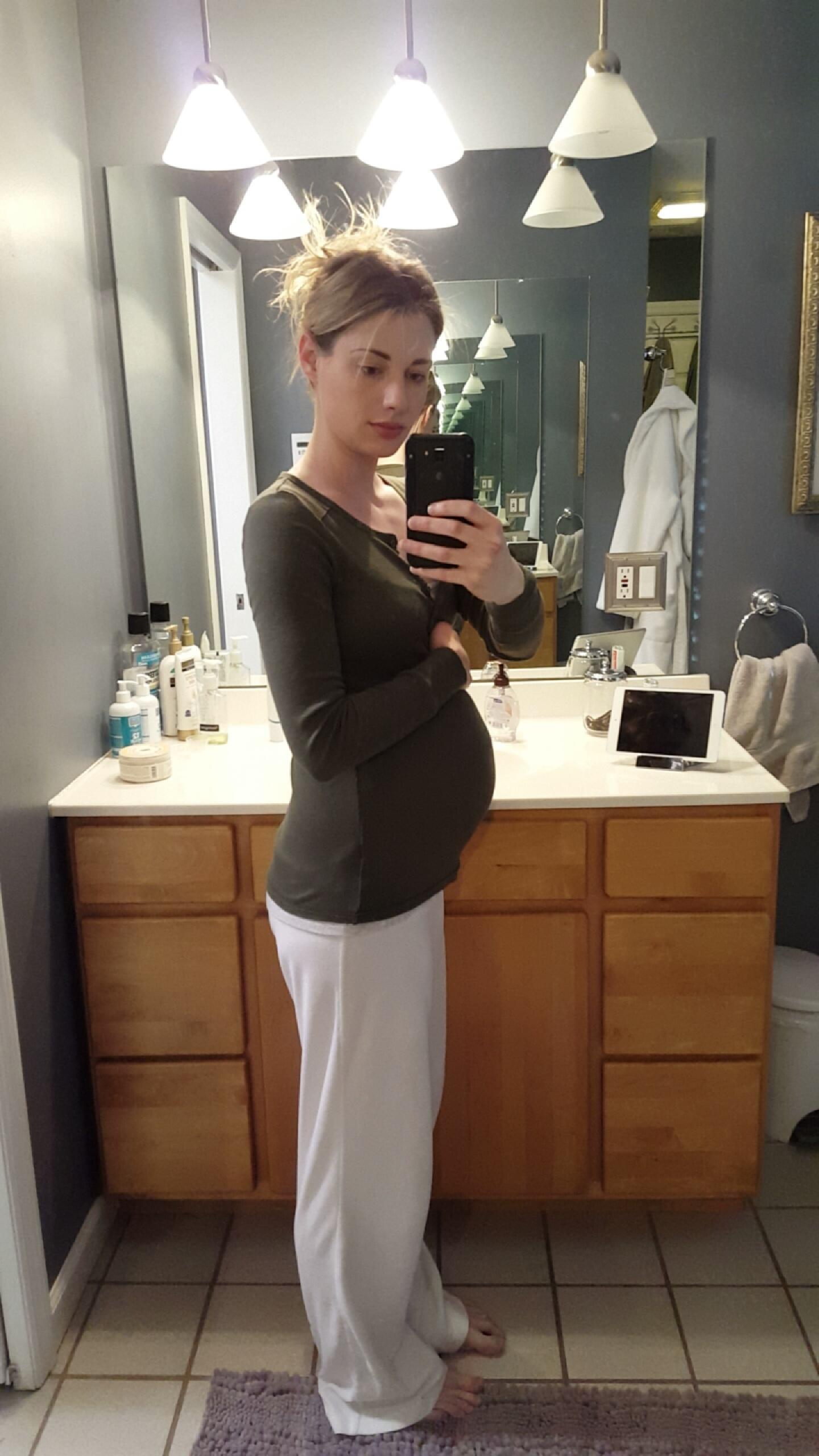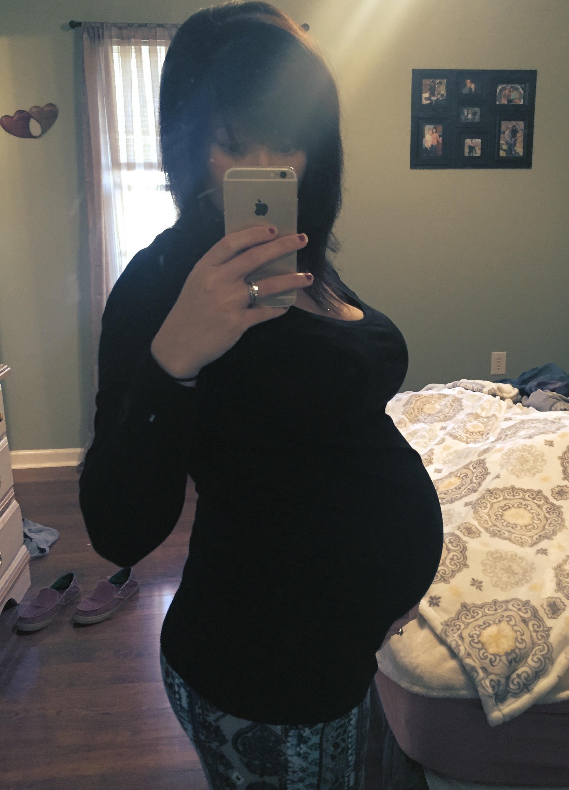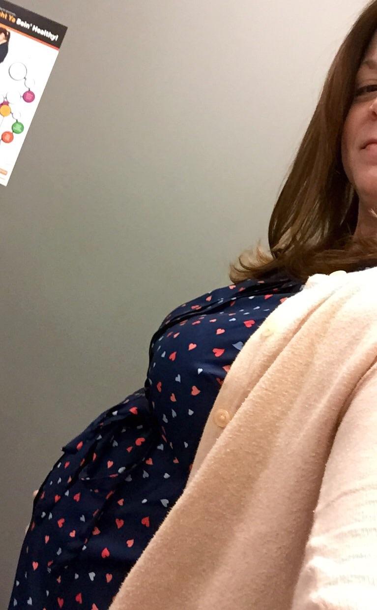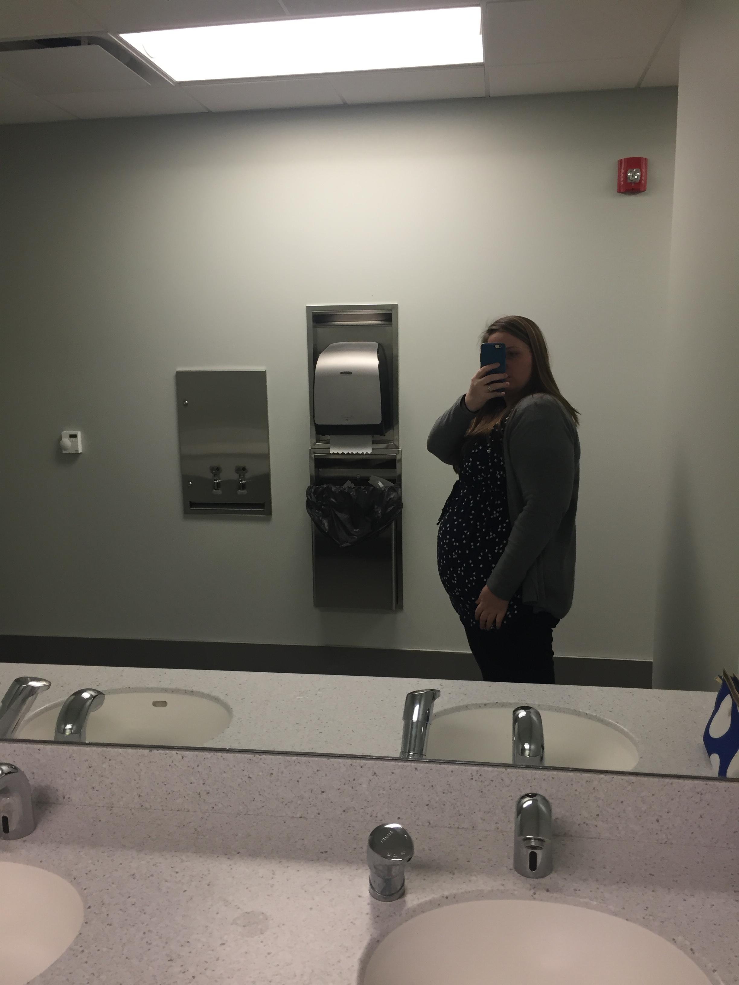 24 weeks + some days. My little friend in the background is not so patiently waiting for me to get a coat out of this closet and take her out. Dogs don't understand hump day bump day.
