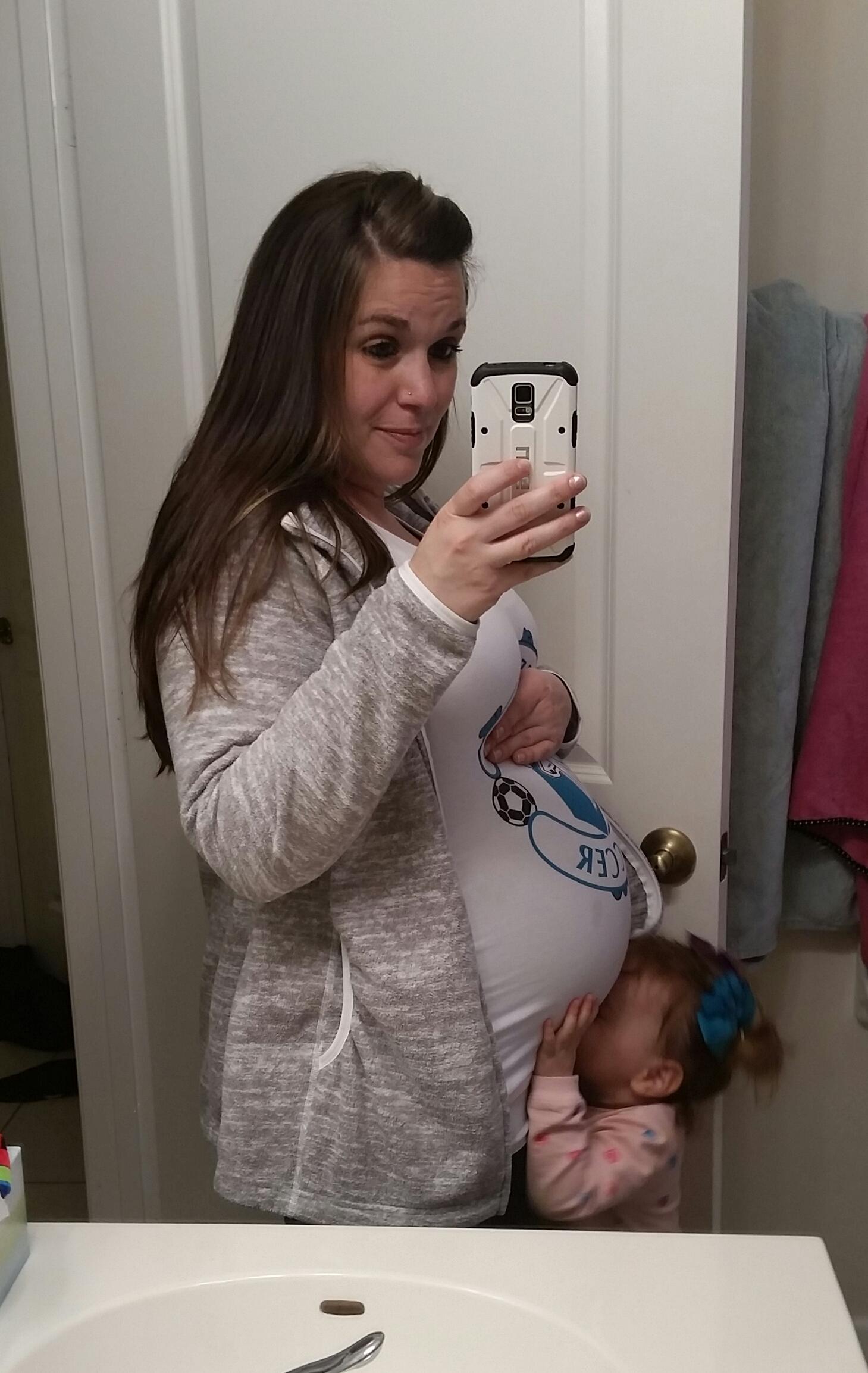 Officially in the third trimester today at 27 weeks! Heading out to DHs soccer game last night, DD1 loves giving baby sister kisses Eta: formatting got a little wonky on mobile, hope it's showing up right!